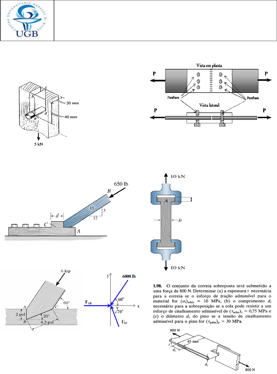 CENTRO UNIVERSITÁRIO GERALDO DI BIASE. FUNDAÇÃO EDUCACIONAL ROSEMAR PIMENTEL. INSTITUTO de CIÊNC. EXATAS, da TERRA e ENG. CURSO de ENGENHARIA CIVIL. DISCIPLINA: RESISTÊNCIA DOS MATERIAIS I. PROFESSOR: DIEGO DORNELAS. CISALHAMENTO � EXEMPLO 1 ( A escora de madeira mostrada na figura está suportada por uma haste de aço de 10 mm de diâmetro presa na parede. Se a escora suporta uma carga vertical de 5kN, calcular a tensão de cisalhamento média da haste na parede e ao longo das duas áreas sombreadas da escora, uma das quais está identificada com abcd. EXEMPLO 2( O elemento B está submetido a uma força de compressão de 650 lbf. Supondo que A e B sejam feitos de madeira e tenham espessura de 3/8 pol e d = 6 pol, determinar a tensão de cisalhamento média ao longo da seção C. EXEMPLO 3( A junta está submetida à força de 6 kip (6000 lbf) do elemento axial. Determinar a tensão normal média que atua nas seções AB e BC. Supor que o elemento é plano e tem 1,5 polegada de espessura. EXEMPLO 4 ( Achar os diâmetros dos parafusos de aço da conexão (diâmetros iguais) para que possamos aplicar P = 8,7 kN com segurança, sabendo que a tensão admissível ao cisalhamento do aço é τadm= 69 Mpa EXEMPLO 5 ( A amostra de madeira está submetida a uma tração de 10 kN em uma máquina de teste de tração. Supondo que a tensão normal admissível da madeira seja (τadm = 12 Mpa) e a tensão de cisalhamento admissível seja (τadm = 1,2 Mpa), determinar as dimensões b e t necessárias de modo que a amostra atinja essas tensões simultaneamente. A amostra tem largura de 25 mm. EXEMPLO 6( t UGB – Compromisso com a Transformação Social!
