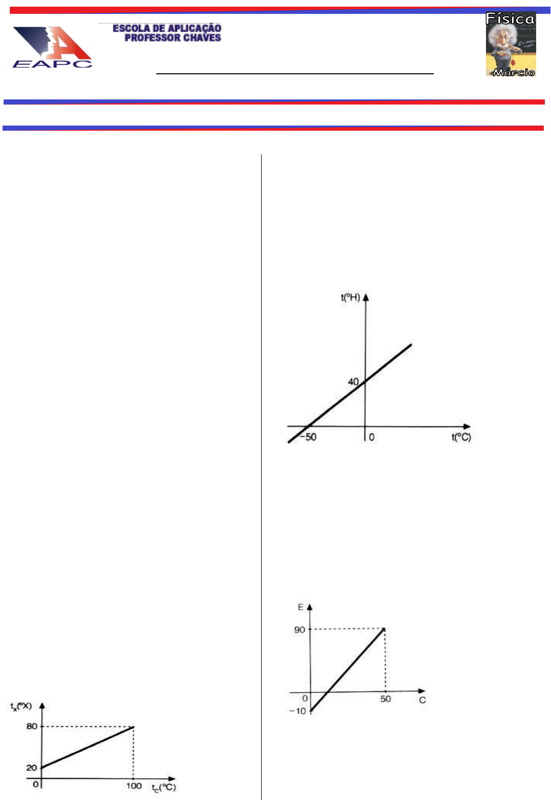 1) Certo termômetro é graduado numa escala X tal que 0 oX corresponde a (– 10 oC) e 100 ºX correspondem a 40 °C. Na escala X, a temperatura correspondente a 0 oC é de: a) 40 oX b) 25 oX c) 20 oX d) 10 oX 2) Numa das regiões mais frias do mundo, o termômetro indica – 76 °F. Qual será o valor dessa temperatura na escala Celsius? a) -60 b) – 76 c) - 50,4 d) – 103 e) + 76 3) A expressão que relaciona a temperatura de um corpo nas escalas Kelvin (T) e Celsius (t) é, aproximadamente, igual a: a) T = t + 273 b) T = t – 273 c) T = t.273 d) T = t/273 e) T = (t + 273)/5 4) A febre é um indicador de alguma anormalidade no organismo humano. Dentre as temperaturas a seguir, a que indica um estado febril é: a) 39 oF b) 60 oF c) 72 oF d) 102 oF e) 150 oF 5) No gráfico está representada a relação entre a escala termométrica Celsius (tc) e uma escala X (tx). Qual é a relação de em função de tc em função de tx? a) tc = 20 + 0,6 tx b) tc = 80 tx - 20 c) tc = (tx -20)/0,6 d) tc = (20 + 0,6.tx)/80 e) tc = (80 + 0,6.tx)/20 6) O gráfico estabelece a relação entre uma escala hipotética de temperatura e a escala Celsius. A temperatura da água em ebulição, sob pressão atmosférica normal, vale: a) 60 oH b) 80 oH c) 100 oH d) 120 oH e) 150 oH 7) Comparando-se a escala E de um termômetro com a escala C (Celsius), obteve-se o seguinte gráfico de correspondência entre as medidas. Quando o termômetro Celsius estiver registrando 90 oC, o termômetro E estará marcando: a) 100 oE b) 120 oE c) 150 oE d) 170 oE e) 200 oE LISTA DE EXERCÍCIOS - TERMOMETRIA Competência, ética e cidadania GOVERNO DO ESTADO DE PERNAMBUCO SECRETARIA DE EDUCAÇÃO Aluno(a): nº 2º ano 8) Dois termômetros, Z e W, marcam, nos pontos de fusão do gelo e de ebulição da água, os seguintes valores: As escalas apresentam a mesma leitura a: a) -10,0 b) - 6,0 c) 2,4 d) 5,2 e) 6,9 9) Quando um corpo está numa temperatura que em graus Celsius tem a metade do valor medido em graus Fahrenheit, pode-se afirmar que sua temperatura é de: a) 200 oF b) 300 oF c) 240 oF d) 320 oF e) 160 oF 10) A indicação de uma temperatura na escala Fahrenheit excede em 2 unidades o dobro da correspondente indicação na escala Celsius. Essa temperatura é: a) 300 oC b) 170 oC c) 150 oC d) 100 oC e) 50 oC Gabarito