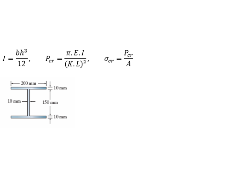 Uma coluna de aço tem comprimento de 9 m e está engastada em ambas as extremidades. Se a área da seção transversal tiver as dimensões mostradas na figura, determine a carga crítica. A fórmula de Euler é válida? Dados: Eaço = 200 GPa, tensão de escoamento = 250 MPa e K=0,5. A - 750 kN, não B - 700 kN, sim C - 1200 kN, não D - 1301 kN, sim CORRETA