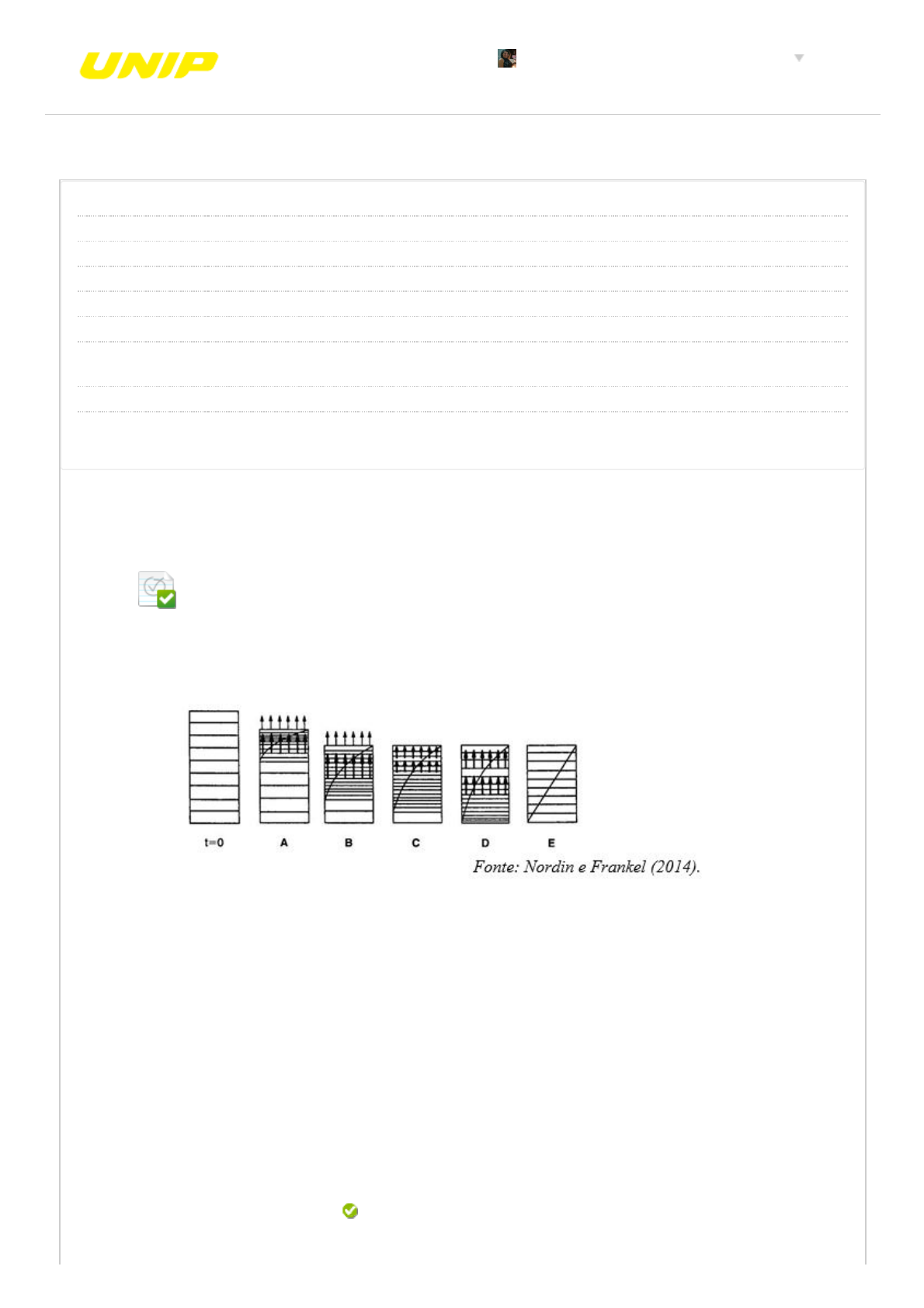 20/05/2019 Revisar envio do teste: QUESTIONÁRIO UNIDADE I – 7064-60... https://ava.ead.unip.br/webapps/assessment/review/review.jsp?attempt_id=_18848297_1&course_id=_38781_1&content_id=_610060_1&return_… 1/9 Revisar envio do teste: QUESTIONÁRIO UNIDADE IBIOMECÂNICA 7064-60_54805_D_20191 CONTEÚDO Usuário maria.bezerra8 @unipinterativa.edu.br Curso BIOMECÂNICA Teste QUESTIONÁRIO UNIDADE I Iniciado 20/05/19 15:55 Enviado 20/05/19 15:58 Status Completada Resultado da tentativa 3 em 3 pontos Tempo decorrido 3 minutos Resultados exibidos Todas as respostas, Respostas enviadas, Respostas corretas, Comentários, Perguntas respondidas incorretamente Pergunta 1 Resposta Selecionada: b. Respostas: a. A figura a seguir representa o gráfico do comportamento de estresse-relaxamento da cartilagem articular. Sabendo que a troca de líquido sinovial entre a cartilagem e a cavidade sinovial é importante para a nutrição da cartilagem e para o controle de carga sobre a articulação, leia as alternativas a seguir, compare com as informações do gráfico e responda corretamente: I. Nos gráficos A e B, o líquido sinovial migra da cavidade para a cartilagem sinovial para permitir sua deformação e piorar a condição de distribuição de pressão. II. No gráfico C, o líquido sinovial para de migrar da cartilagem para a cavidade sinovial devido aos íons negativos que envolvem os proteoglicans, que se repelem em função da aproximação de suas partes e determinam a espessura mínima que a cartilagem pode assumir na recepção de forças compressivas. III. No gráfico D, há a redistribuição do líquido sinovial que permaneceu na cartilagem articular. IV. No gráfico E, há a deformação máxima da cartilagem articular, aumentando a área de contato entre as peças ósseas, melhor condição para receber forças de alta intensidade. Essa ação é acelerada quando a cartilagem recebe forças de compressão de baixa intensidade e alta frequência no aquecimento para o exercício. As afirmações II, III e IV estão corretas. As afirmações I, II, III e IV estão corretas. UNIP EAD BIBLIOTECAS MURAL DO ALUNO TUTORIAISCONTEÚDOS ACADÊMICOS 0,3 em 0,3 pontos maria.bezerra8 @unipinterativa.edu.br 20/05/2019 Revisar envio do teste: QUESTIONÁRIO UNIDADE I – 7064-60... https://ava.ead.unip.br/webapps/assessment/review/review.jsp?attempt_id=_18848297_1&course_id=_38781_1&content_id=_610060_1&return_… 2/9 b. c. d. e. Feedback da resposta: As afirmações II, III e IV estão corretas. As afirmações I, II e III estão corretas. As afirmações I, II e IV estão corretas. As afirmações I, III e IV estão corretas. Resposta: Alternativa b. Comentário: Com a aplicação de força compressiva na articulação, o líquido sinovial migra da cartilagem para cavidade sinovial a fim de permitir a deformação da cartilagem para aumentar a área de contato com as peças ósseas e melhorar a condição de distribuição de força. Pergunta 2 A resposta mecânica do tendão pode ser investigada por meio de testes mecânicos (ver figura), nos quais uma amostra de tendão é submetida a forças de tração progressivamente mais altas até a ruptura do tecido. Durante esse processo, a magnitude da força e a deformação resultante são registradas. Leia o texto a seguir, no qual a resposta mecânica do tendão está descrita e assinale a alternativa correta. Os tendões apresentam quatro fases diferentes de resposta. A fase 1 (intervalo de 0 a 1 do gráfico) representa o alinhamento das fibras de colágeno. Quando estas estruturas não estão sendo tracionadas, elas se apresentam em uma disposição ondulada e relaxada. Com uma quantidade relativamente pequena de carga de tração, ocorre o alinhamento da estrutura, na qual as fibras passam a ficar alinhadas e esticadas. A fase 2 (intervalo de 1 a 2 do gráfico) é a fase de resposta linear ou região secundária. Nesta fase, as fibras respondem à tração por meio de alongamento. A relação entre estas duas variáveis é mais ou menos linear, ou seja, quanto maior for a força empregada, maior será o alongamento da estrutura, mas também quanto mais alongada estiver a estrutura, maior será a sua rigidez. 0,3 em 0,3 pontos 20/05/2019 Revisar envio do teste: QUESTIONÁRIO UNIDADE I – 7064-60... https://ava.ead.unip.br/webapps/assessment/review/review.jsp?attempt_id=_18848297_1&course_id=_38781_1&content_id=_610060_1&return_… 3/9 Resposta Selecionada: a. Respostas: a. b. c. d. e. Feedback da resposta: A fase 3 (intervalo de 2 a 3 do gráfico) representa o instante a partir do qual as fibras de colágeno vão aleatoriamente se rompendo na extensão da estrutura e sua resistência vai gradativamente sendo comprometida em função dessas rupturas. Esta fase se chama fase de falha ou microfalha. Por último, a fase 4 (intervalo de 3 a 4 do gráfico) representa a fase da ruptura total, na qual a carga máxima foi atingida e a estrutura não é mais capaz de responder ao estímulo. As forças de tração impostas nos movimentos cotidianos chegam até a fase 2 de resposta mecânica. As forças de tração impostas nos movimentos cotidianos chegam até a fase 2 de resposta mecânica. As forças de tração impostas nos movimentos esportivos chegam até a fase 1 de resposta mecânica. Em repouso, o tendão apresenta-se na fase 3 de resposta. As forças de tração impostas nos movimentos esportivos sempre chegam até a fase 4 de resposta mecânica. As forças de tração impostas nos movimentos cotidianos chegam até a fase 1 de resposta mecânica. Resposta: Alternativa a. Comentário: Os movimentos do cotidiano não aplicam forças de tração intensas ao ligamento a ponto de promover rupturas. Pergunta 3 Resposta Selecionada: a. Respostas: a. b. A resistência de um material biológico, como osso, tendão e ligamento, pode ser testada por meio do procedimento experimental conhecido por Ensaio Mecânico In Vitro. Sobre este procedimento é correto afir