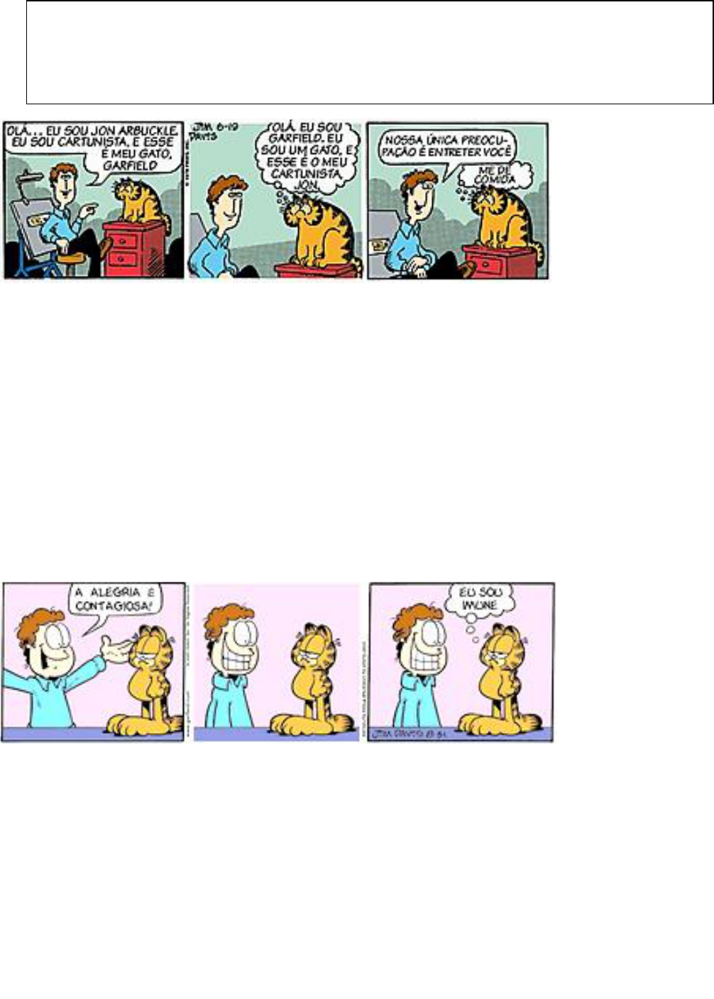 AVALIAÇÃO DE LÍNGUA PORTUGUESA – E. E. DOUTOR ODILON LOURES ALUNO: ________________________________________________________TURMA:___________ PROFESSORA: ________________________ DATA:____/_____/______ 1. Observe as orações do primeiro quadrinho. “Eu sou Jon Arbuckle.” “Eu sou cartunista...” “E esse é meu gato, Garfield.” Identifique o sujeito e o predicado de cada oração. Identifique o núcleo de cada predicado. 2. Os verbos de ligação servem para conectar o sujeito a seu predicativo. Ao contrário dos verbos significativos, esses verbos não acrescentam uma ideia nova ao sujeito nem expressam ação, apenas informam como ele é ou está. Observe a fala de Garfield, no segundo quadrinho: Quais informações a respeito de Garfield são introduzidas pelo verbo de ligação (ser)? 3. A palavra que informa uma característica, qualidade ou estado do sujeito da oração recebe o nome de predicativo do sujeito. Identifique o predicativo do sujeito na fala de Jon, no primeiro quadrinho. 4. O predicativo do sujeito sempre concorda em número com o núcleo do sujeito. Explique essa afirmação, utilizando como exemplo as falas de Jon e Garfield, na tirinha acima. 5 . Indique e classifique o predicativo das frases que seguem: a) A notícia deixou todos aliviados. b) Desencanto é a palavra-chave do Brasil de hoje. c) A ideia parecia simples e estimulante. d) Alguns deputados consideram esta lei ultrapassada. e) Esta lei é considerada ultrapassada por alguns deputados. 6. Identifique e Classifique o Predicado: Marta entrou séria. Os alunos saíram da aula alegres. Choviam flores do helicóptero. À noite, eu e Rodrigo iremos ao cinema. Ele trovejava impropérios sobre a turba. Estavam com fome.
