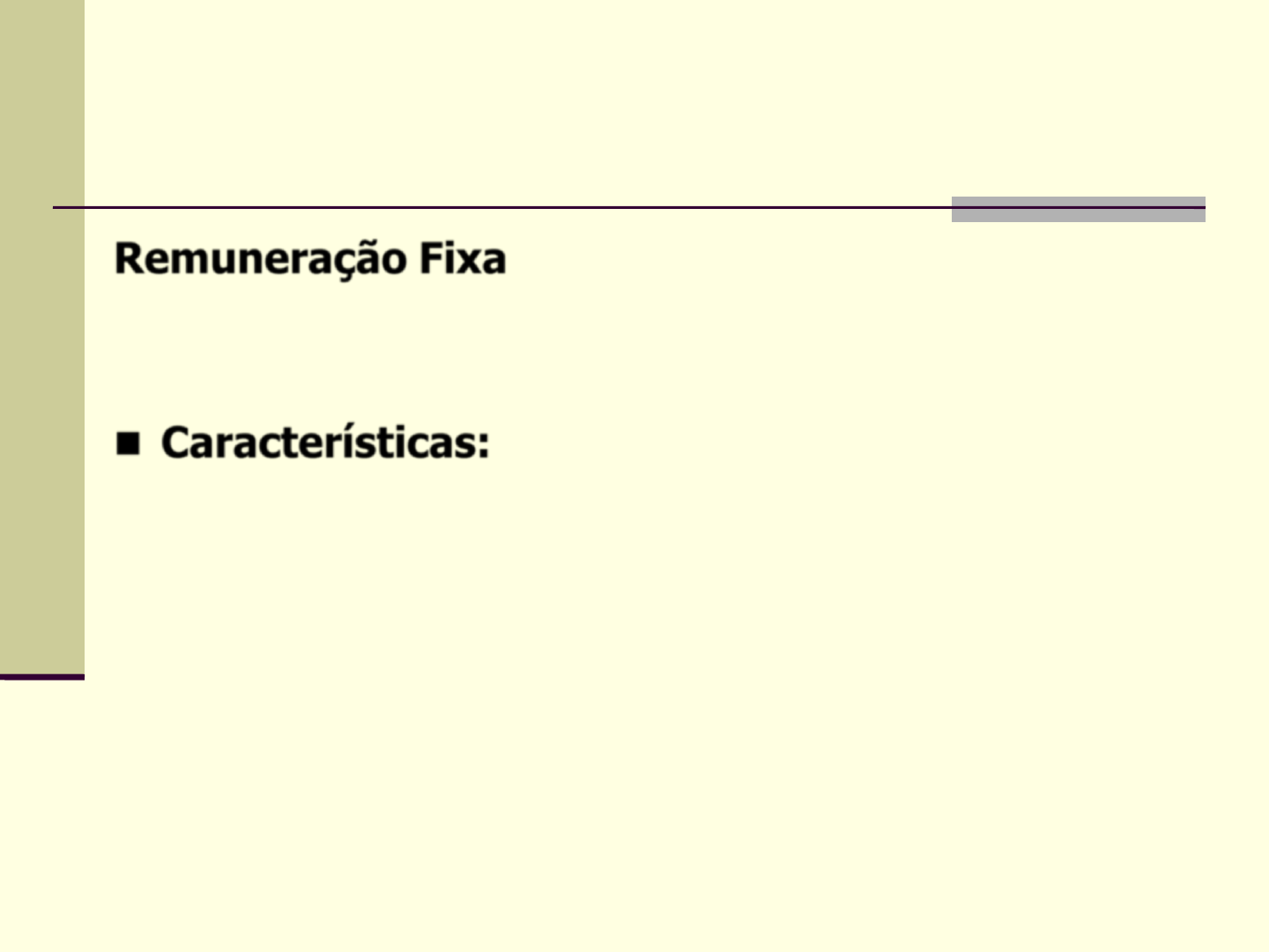 * Recompensando Pessoas Sistemas de Remuneração Remuneração Fixa Ainda predomina na maior parte das organizações Características: Homogeneização e padronização dos salários Facilita equilíbrio interno e externo dos salários Permite controle centralizado da administração salarial Base lógica e racional para a distribuição dos salários Foco na execução das tarefas e na eficiência Afeta diretamente os custos fixos * Recompensando Pessoas Sistemas de Remuneração Remuneração Fixa Desvantagens: Não motiva; funciona apenas como fator higiênico Não incentiva o espírito empreendedor nem a aceitação de riscos e responsabilidades Elemento de conservação da rotina e do status quo Remunera em função do tempo na organização e não pelo desempenho ou alcance de resultados * Recompensando Pessoas Sistemas de Incentivos Remuneração Variável ( ou Flexível) Novo Contexto Competitivo RESULTADOS / CRIATIVIDADE/ INOVAÇÃO/ ESPÍRITO EMPREENDEDOR/ INICIATIVA REMUNERAÇÃO VARIÁVEL * Recompensando Pessoas Sistemas de Incentivos Remuneração Variável ( ou Flexível) Fatores Indicadores de Formas de Determinantes Desempenho Recompensa REMUNERAÇÃO VARIÁVEL Gestão sistêmica de recursos Comportamento organizacional Metas e objetivos Quantitativos Qualitativos Comportamentais Remuneração por Resultados Participação nos Lucros * Recompensando Pessoas Sistemas de Incentivos Remuneração Variável ( ou Flexível) Início na década de 1980 ( EUA e Europa) Parcela da remuneração total paga periodicamente ao colaborador e diretamente relacionada aos resultados da empresa Parceria entre empresa e colaboradores ( lucro ou prejuízo) Características: Remunera as diferenças individuais e o alcance dos resultados Fator motivacional, enfatizando a auto-realização (cont.) * Recompensando Pessoas Sistemas de Incentivos Remuneração Variável ( ou Flexível) Características: Premiação do bom desempenho e incentivo ao desempenho excepcional Foco nos resultados e no alcance de objetivos Permite auto-avaliação, pois funciona como feedback Estabelece uma remuneração adicional e contingencial Sem impacto sobre os custos fixos Flexibilidade da organização para eleger sua meta principal * Recompensando Pessoas Sistemas de Incentivos Remuneração Variável ( ou Flexível) Desvantagens: Alteração das estruturas salariais lógicas e rigidamente estabelecidas Quebra da isonomia dos ganhos na organização Redução do controle centralizado dos salários Queixas de colaboradores não beneficiados e possíveis pressões sindicais * Recompensando Pessoas Sistemas de Incentivos Remuneração Variável ( ou Flexível)- Modelos Plano de Bonificação anual Valor monetário oferecido ao final de cada ano a determinados funcionários, em função da sua contribuição pessoal ao desempenho organizacional ( resultados concretos e mensurados). Mensuração do desempenho da empresa: lucratividade alcançada, aumento da participação no mercado, melhoria da produtividade, etc. (cont.) * Recompensando Pessoas Sistemas de Incentivos Remuneração Variável ( ou Flexível)- Modelos Plano de Bonificação anual Negociação de metas que recebem peso para definir prioridades. Funcionários são submetidos a várias avaliações (Chefes, subordinados e pares). Definição de no. salários mensais, em função do nível hierárquico. Empresa só paga bônus se atingir o resultado global predefinido. * Recompensando Pessoas Sistemas de Incentivos Remuneração Variável ( ou Flexível)- Modelos Distribuição de Ações da empresa aos funcionários Distribuição gratuita a determinados funcionários, como forma de compensação à sua contribuição individual aos resultados anuais. Bônus é substituído por “papéis da empresa”. * Recompensando Pessoas Sistemas de Incentivos Remuneração Variável ( ou Flexível)- Modelos Opção de compra de ações da empresa ( stock options) Oferta de ações vendidas aos funcionários por um preço subsidiado ou transferidas de acordo com regras pré- estabelecidas (preço e prazo). Funcionário se torna acionista da empresa. * Recompensando Pessoas Sistemas de Incentivos Remuneração Variável ( ou Flexível)- Modelos Participação nos Resultados Modelo relacionado com o desempenho dos funcionários no alcance de metas e resultados estabelecidos para um determinado período de tempo. Porcentagem ou fatia de valor com que cada pessoa participa dos resultados - da empresa ou de seu setor de trabalho – que ajudou a atingir, individualmente ou em equipe. Funcionário transforma-se em um pequeno empresário. (cont.) * Recompensando Pessoas Sistemas de Incentivos Remuneração Variável ( ou Flexível)- Modelos Participação nos Resultados – Vantagens Reforça cultura participativa e trabalho em grupo Conduz a uma visão mais abrangente do negócio, bem como à ênfase na melhoria da qualidade e na redução de custos Incentiva a busca de inovações nos produtos, nos processos e no modelo de gestão ( maior eficácia) Reduz a resistência a mudanças (cont.) * Recompensando Pessoas Sistemas de Incentivos Remuneração Variável ( ou Flexível)- Modelos Participação nos Resultados – Fatores Condicionantes para o sucesso Estruturas organizacionais de tamanho que viabilize que o vínculo entre ação e resultado seja claro Objetivos factíveis e sistemas de medição simples, transparentes e eficazes Atitude gerencial favorável à participação e ao trabalho em grupo Grupos maduros e capacitados * Recompensando Pessoas Sistemas de Incentivos Remuneração Variável ( ou Flexível)- Modelos Distribuição de Lucros e Resultados – PLR (Profit-Sharing) Distribuição anual entre os funcionários, de uma certa parcela ou proporção dos lucros da empresa. Funcionários: maior sentido de participação organizacional e predisposição ao aumento da eficácia da empresa. (cont.) * Recompensando Pessoas Sistemas de Incentivos Remuneração