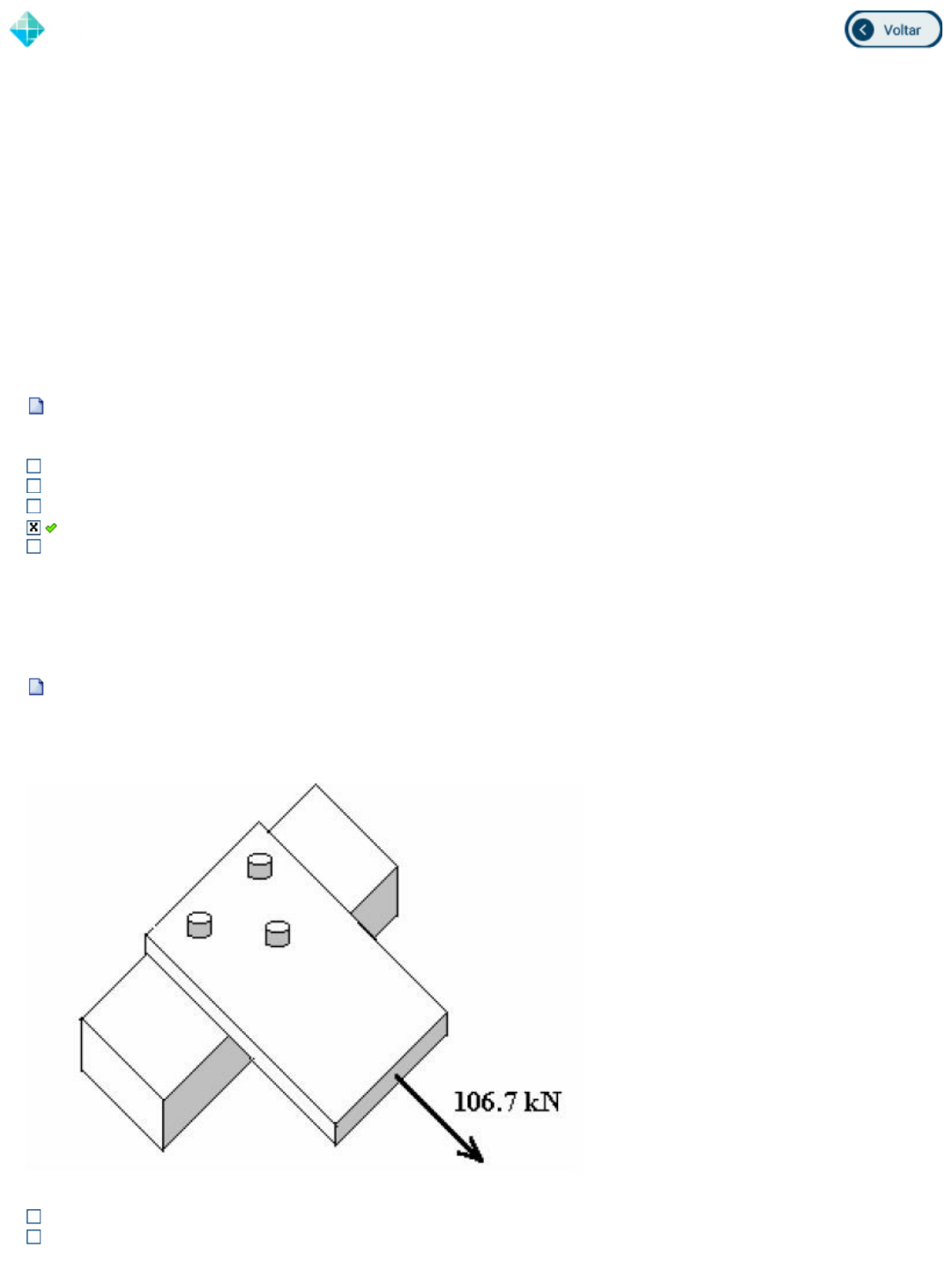 A placa indicada na figura é presa à base por meio de 3 parafusos de aço. A tensão de cisalhamento última do aço é de 331 MPa. Utilizando-se um coeficiente de segurança de 3,5 determine o diâmetro mínimo do parafuso a ser usado.