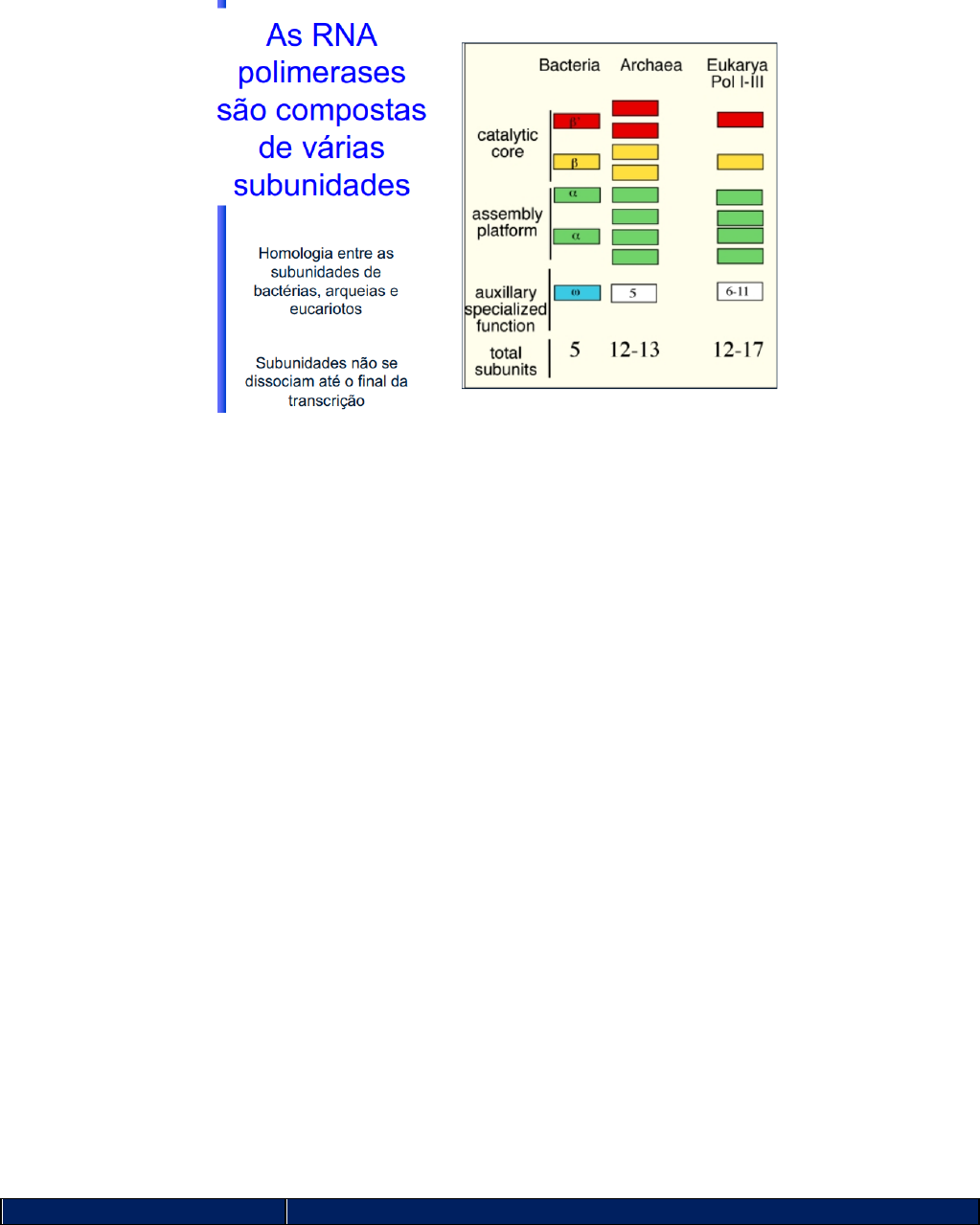TRANSCRIÇÃO EM EUCARIOTOS pág 220 O processo de transcrição dos genes das células eucariotas apresenta diversas peculiaridades em relação à transcrição em bactérias, apesar do mecanismo de síntese de RNA usando o DNA como molde ser praticamente idêntico Transcrição em eucariotos: Em primeiro lugar, o DNA está localizado no núcleo das células, enquanto a grande maioria das moléculas de RNA desempenha seu papel no citoplasma. Nas células eucariotas, os RNAs devem ser transportados do núcleo para o citoplasma. Assim, os processos de transcrição e tradução são completamente separados, ao contrário do acoplamento existente em bactérias Em segundo lugar, os genes eucariotos que codificam proteínas são frequentemente interrompidos por sequências que não fazem parte da mensagem final, traduzida em proteínas. Essas sequências, denominadas íntrons, devem ser retiradas na maturação do RNA mensageiro, que também sofre outras modificações para garantir sua estabilidade na viagem com destino ao citoplasma Em terceiro lugar, o DNA dos eucariotos está num estado de condensação muito mais compacto que o DNA de procariotos, com a presença de nucleossomos e outras proteínas que compõem a cromatina. Para que as RNA polimerases tenham acesso ao DNA, ele precisa ser exposto. O processo de modificação da cromatina é altamente preciso, para que os genes certos sejam expressos no tipo celular e no tempo certos Finalmente, eucariotos apresentam múltiplas RNA polimerases especializadas na transcrição de classes diferentes de genes, ao contrário da única RNA polimerase dependente de DNA presente em procariotos CONCEITOS DEFINIÇÃO E APLICAÇÃO RNA Polimerase Fazem parte das RNA polimerases as subunidades que não se dissociam durante todo o processo de transcrição, da iniciação ao término *Fatores de Transcrição Basal Reconhecem estruturas conservadas nos promotores, formando com a RNA polimerase o complexo de transcrição basal Ativadores de Transcrição São proteínas necessárias para aumentar a frequência com que os genes são transcritos e, na maioria dos casos, são também essenciais para a expressão gênica. Esses fatores reconhecem sequências específicas no DNA e podem se associar diretamente a proteínas do complexo basal de transcrição e à própria RNA polimerase, ligando-se a sítios de ativação localizados nas proximidades do promotor Co-Ativadores Alguns ativadores, entretanto, se ligam a regiões no DNA distantes dos promotores e necessitam de proteínas que funcionam como uma ponte de ligação entre os ativadores e o complexo basal. Essas proteínas intermediárias (as “pontes”) são conhecidas como co-ativadores e não se ligam diretamente ao DNA, mas fazem diversas interações entre proteínas Os co-ativadores podem apenas servir como intermediários entre proteínas distantes, ou ainda podem modular a atividade dos ativadores de transcrição por modificações como a fosforilação ou desfosforilação, por exemplo Fatores de Remodelamento da Cromatina Tornam os promotores mais ou menos acessíveis ao aparato de transcrição Os fatores de transcrição reconhecem a sequência promotora, fazendo com que o RNA Polimerase se liga a ela. Fator Transcrição + RNA II Complexos basais de transcrição Ativadores de transcrição podem se ligar a esses complexos ou simplesmente se ligarem a regiões do DNA, aumentam a frequência de genes a serem expressos. Quando se ligam a regiões distantes do promotor, precisam de proteínas, os chamados co-ativadores para fazerem uma ponte intermediária com os complexos basais *Os fatores de transcrição são necessários porque, assim como as RNA polimerase de procariotos não conseguem reconhecer as sequências iniciadoras. Esses fatores, com função análoga aos fatores sigma de bactéria, são essenciais para o posicionamento correto das polimerases no promotor, mas se dissociam dela assim que a transcrição propriamente dita se inicia Então NÃO FAZ PARTE da RNA Polimerase RNA POLIMERASES TRANSCREVEM DIFERENTES CLASSES DE GENES Existem pelo menos três RNA polimerases nucleares, denominadas I, II e III, em todos os eucariotos estudados até o momento RNA I Transcreve os genes dos RNAs ribossomais 28S e 18S, sendo assim responsável pela maior atividade de síntese de RNA na célula, em termos de quantidade de transcritos gerados Deve ser porque os ribossomos estão em maior quantidade na célula 70% RNA II Responde pela maior diversidade de transcritos. Todos o hnRNAs (RNAs nucleares heterogêneos), que compreendem os mRNAs ainda não processados e diversos RNAs não codificantes 2,5 a 5% RNA HETEROGÊNEO RNA III Sintetiza pequenos RNAs não codificantes, envolvidos na regulação gênica, no processamento de outros RNAs e na tradução, dentre eles o rRNA 5S e os tRNAs 25% Apesar da grande diversidade de promotores de RNA polimerase II, é possível distinguir algumas regiões conservadas na maioria deles, ainda que sejam pequenas. Os promotores mínimos para a RNA polimerase II, ou seja, aqueles que atendem aos requisitos básicos para o início da transcrição, apresentam a região iniciadora (Inr) O que faz com que cada RNA polimerase transcreva apenas seu conjunto particular de genes é a combinação das sequências em cis nos promotores com os fatores de transcrição basal que recrutam a RNA polimerase comprometida com aquele conjunto de genes Transcrição do gene: - Elemento Cis - Elemento Regulador - Enhancer Existem os promotores com sequências TATAA, o TATA-box, geralmente na posição -25, relativo ao início de transcrição. É na sequência TATA-box que se liga a proteína TBP (TATA binding protein), parte do grande fator de transcrição basal TFIID Então, o TATAA / TATA-box são sequências que FAZEM PARTE do promotor, ou seja, não tem só eles de sequência presente no promotor Então pelo o que eu entendi, o TATAA = TATA-box sendo uma sequência qu