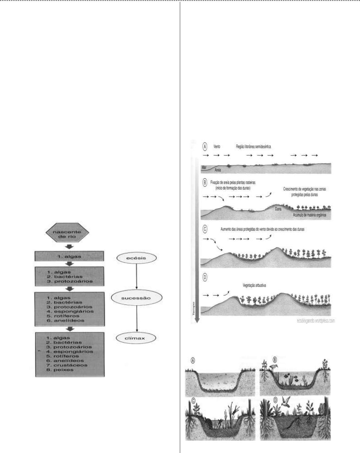ECOLOGIA (DINÂMICA DE COMUNIDADES) - ESTUDO DAS COMUNIDADES: A busca de equilíbrio por uma comunidade passa por várias etapas ecológicas denominadas de Sucessão Ecológica. - O que é Sucessão Ecológica? É o desenvolvimento de biocenoses, desde que se originam até atingirem um estado de equilíbrio dinâmico com o meio ambiente. A sucessão não ocorre repentinamente, de forma abrupta, mas sim através de um aumento no número de espécies de uma comunidade, até se atingir uma situação que não se modifica com o ambiente, denominada clímax. Uma sucessão pode iniciar-se em diversos lugares: numa rocha, numa lagoa, num terreno formado por sedimentação etc. (com formação primária dos seres autótrofos). Há três etapas ecológicas: ecese, seres e clímax. 1. ECESES: O primeiro passo de uma sucessão ecológica é a migração de espécies de outras áreas para a região onde irá iniciar-se a sucessão. As espécies chegam a essa região através dos elementos de reprodução (esporos, semente...) Como nesse lugar não há vida, as condições são desfavoráveis – intensa iluminação, solo muito úmido ou muito seco, temperatura elevada do solo – e só permitem o desenvolvimento de algumas espécies. As espécies que se desenvolvem inicialmente no ambiente inóspito são chamadas pioneiras. São espécies de grande amplitude, isto é, não são exigentes, apenas não tolerando as grandes densidades. Essa vegetação é constituída por liquens, musgos, plantas de dunas etc. Eceses - é a instalação de espécies pioneiras numa área sem vida, onde irão se reproduzir. 2. SERES: (estágio intermediário) A vegetação pioneira prepara o ambiente para o estabelecimento de outras espécies vegetais. No processo de desenvolvimento das comunidades, algumas espécies migram, outras desaparecem, ocorrendo diversas alterações até se atingir o clímax. Na sucessão, as espécies de maior amplitude ecológica são substituídas pela menor amplitude. As populações mais simples precedem as mais complexas; aumenta a diversidade de espécies; as formas herbáceas são substituídas pelas arbóreas. Denominam-se seres as comunidades temporárias que surgem no decorrer de uma sucessão. 3. CLIMÁX: (equilíbrio) As transformações que ocorrem nas comunidades biológicas levam-nas ao equilíbrio final com o meio ambiente, o clímax. Neste estágio,o número de espécies nas comunidades, isto é, sua biodiversidade, é muito grande. Elas também apresentam muita biomassa e um grande número de nichos ecológicos. A floresta Amazônica, a mata Atlântica, o cerrado e a caatinga são exemplos de comunidade Clímax. Assim, a sequência numa sucessão é: Ecese ⇒ Seres ⇒ Clímax - As sucessões podem ser de dois tipos: As Sucessões Primárias: Aquela que ocorre a partir de ambientes predominantemente inorgânicas Ex.: sucessão em dunas As Sucessões Secundárias: Aquela que se processa a partir de ambientes orgânicos, normalmente em ecossistemas alterados Ex: campos de culturas abandonadas, assoreamento. Quadro de resumo: “A evolução das comunidades durante a sucessão” Características de comunidade Tendências na sucessão: do estágio inicial até o clímax. Composição em espécie Muda rapidamente no inicio e mais lentamente nos estágios intermediárias, mantendo-se aproximadamente constante no clímax. As espécies importantes nos estágios iniciais podem não ser importantes nem ocorrer no clímax. Diversidade de espécies (nº de espécies presentes em uma comunidade) A diversidade inicial é baixa, havendo predomínio de autótrofos. Ao longo da sucessão, há aumento na diversidade e no nº de espécies heterótrofas. No clímax, adversidades é alta e estável. Algumas vezes, a diversidade aumenta ao longo da sucessão e declina um pouco no clímax. Biomassa Aumenta, pois o nº de indivíduos aumenta Teia alimentar Torna-se mais complexa, uma vez que surgem novos nichos EXERCÍCIOS. 01. (HA) Julgue as afirmativas sobre sucessão ecológica: ( ) No processo de sucessão, inicialmente as cadeias alimentares são lineares e dominadas por herbívoros e aos poucos tornam-se teias alimentares complexas. ( ) A quantidade de matéria orgânica acumulada no ecossistema passa a ser cada vez menor. ( ) As comunidades pioneiras apresentam a produção primária bruta de matéria orgânica superior ao próprio consumo, assim o saldo orgânico é incorporado a comunidade, garantindo seu desenvolvimento em termos de biomassa. ( ) A medida que a sucessão se desenvolve, o aumento da biomassa vegetal gera um aumento na produtividade bruta que permanece, durante todo o processo, maior que a taxa de respiração. ( ) A produtividade liquida é progressivamente menor, e isso promove o crescimento cada vez mais lento da biomassa. Marque a alternativa que apresenta o julgamento dos itens acima correto: a) F, F, F, F, V. d) V, F, V, F, V. b) V, V, V, V, F. e) V, V, F, V, F. c) F, V, F, V, F. GAB: D 02. (OMEC-SP) Sobre uma sucessão ecológica não será valido afirmar: a)os tipos de plantas e animais mudam continuamente com a sucessão. b)a diversidade de espécies tende a diminuir com a sucessão. c)em uma sucessão heterotrófica, a energia está inicialmente no máximo e declina conforme a sucessão ocorre. d)O homem necessita de estágios iniciais de sucessão como fontes de alimento, pois esses são mais produtivos. e)a sucessão é um resultado da modificação do ambiente físico pela comunidade. GAB: B 03.(UFMG) A sucessão, num ecossistema, pode ser descrita como uma evolução em direção: a)ao aumento da produtividade liquida. b)à diminuição da competição. c)ao grande número de nichos ecológicos. d)à redução do número de espécies. e)à simplificação da teia alimentar. GAB: C 04. (HA) No que se refere à sucessão ecológica, indique as alternativas CORRETAS: 1. Os organismos que conseguem suportar as duras condições para iniciar uma colonização car