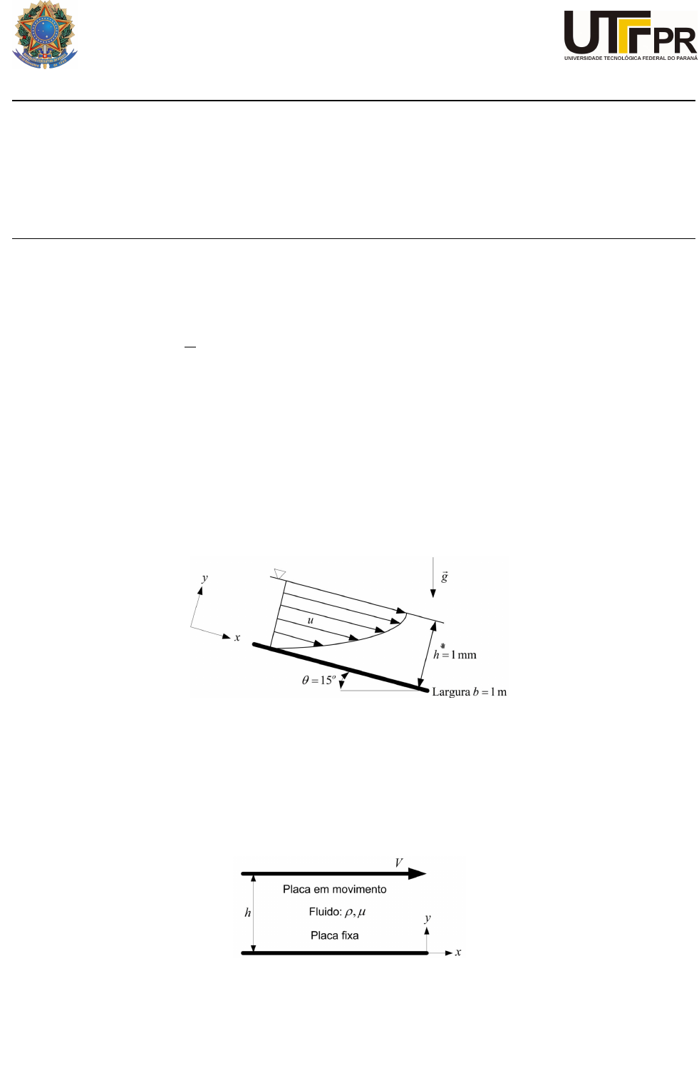 UNIVERSIDADE TECNOLÓGICA FEDERAL DO PARANÁ Campus Cornélio Procópio SEGUNDA LISTA DE EXERCÍCIOS Disciplina: Mecânica dos Fluidos 2 Curso: Engenharia Mecânica Turma: M61 Data: 10/2017 Número de exercícios: 18 Exerc. 1) Um fluido incompressível escoa entre duas placas paralelas estacionárias infinitas. O perfil de velocidade é dado por umáx = Ay2 + By + C, na qual A, B e C são constantes e y é a distância medida para cima, a partir da placa inferior. O espaçamento entre as placas é h. Use as condições de contorno apropriadas para expressar o módulo e as unidades SI das constantes em termos de h. Desenvolva uma expressão para a vazão em volume por unidade de profundidade e avalie a razão V /umáx. Exerc. 2) Um líquido escoa para baixo sobre uma superfície plana inclinada em um filme laminar, permanente, completamente desenvolvido e de espessura h. Determine as expressões para o perfil de velocidade do líquido, a distribuição de tensões de cisalhamento, a vazão volumétrica e a velocidade média, u¯, a partir da Análise Integral, em um volume de controle diferencial. Relacione a espessura do filme de líquido com a vazão volumétrica por unidade de profundidade, Qb, da superfície normal ao escoamento. Calcule a vazão volumétrica em um filme d’água com espessura h = 1[mm], escoando sobre uma superfície com largura b = 1[m], inclinada de 15◦ em relação à horizontal. Determine u(y) via simplificação das Equações de Navier-Stokes e responda se essa abordagem foi mais simples e/ou mais rápida que a primeira. Exerc. 3) Considere o escoamento em regime permanente, incompressível, laminar de um fluido newtoniano no espaço estreito entre duas placas paralelas infinitas. A placa superior está se movendo à velocidade V , e a placa inferior está fixa. A distância entre essas duas placas é h, e a gravidade age na direção negativa do eixo z (para dentro do plano da figura abaixo). Não há nenhuma outra pressão aplicada a não ser a pressão hidrostática em virtude da gravidade. Esse escoamento é chamado de Escoamento de Couette. Calcule os campos de velocidade e pressão, e estima a força de cisalhamento por unidade de área agindo na placa inferior. Exerc. 4) Um óleo viscoso (µ = 0, 5[Ns/m2]) escoa em regime permanente entre duas placas paralelas. O escoamento é laminar e completamente desenvolvido. O gradiente de pressão é 1, 25[kPa/m] e a altura do canal é 1, 25[mm]. Calcule o módulo e o sentido da tensão de cisalhamento na superfície da placa superior. Determine a vazão em volume através do canal. Exerc. 5) Uma grande massa é suportada por um pistão de diâmetro D = 100[mm] e comprimento também de L = 100[mm]. O pistão está assentado em um cilindro fechado no fundo. A folga a = 0, 025[mm] entre a parede do cilindro e o pistão é preenchida com óleo SAE 10 a 20[◦C]. O pistão desliza lentamente devido ao peso da massa, e o óleo é forçado a sair à taxa de 6 × 10−6[m3/s]. Qual o valor da massa em [kg]? L a D M Exerc. 6) Um mancal hidrostático deve suportar uma carga de 50.000[N/m] por unidade de comprimento perpendicu- lar ao diagrama. O mancal é alimentado com óleo SAE 10 W - 30 a 35[◦C] e 700[kPa] através do rasgo central. Q x y W h Como o óleo é viscoso e a folga estreita, o escoamento na folga pode ser considerado completamente desenvolvido. Calcule: a) a largura requerida para a plataforma do mancal; b) o gradiente de pressão resultante, dp/dx; c) a altura h da folga, se Q = 1[mL/min/m] Exerc. 7) Considere a forma modificada do escoamento de Couette na qual há dois líquidos imiscíveis entre duas placas planas, paralelas e infinitamente longas, conforme figura abaixo. O escoamento é permanente, incompressível, paralelo e laminar. A placa superior se move a uma velocidade V para a direita enquanto a placa inferior é estacionária. A gravidade age na direção −z (para baixo na figura). Não há gradiente de pressão empurrando os fluidos através do canal – o escoamento se estabelece somente pelos efeitos viscosos criados pela placa superior em movimento. Você pode ignorar os efeitos da tensão superficial e considerar que a interface seja horizontal. Se a pressão na parte inferior do escoamento do escoamento (z = 0) é igual a p0, pede-se: a) Determinar os campos de velocidade e de pressão nos dois líquidos; b) Sendo o fluido 1 a água e o fluido 2 óleo usado de motor, ambos a 80◦C, faça o gráfico de u como uma função de z através de todo o canal. 2 Exerc. 8) Uma bomba de arrasto viscoso é feita de um invólucro estacionário com um tambor rotativo bem ajustado em seu interior. A folga é pequena quando comparada com o diâmetro do tambor, de modo que o escoamento no espaço anular, entre o invólucro e o tambor pode ser tratado com um escoamento entre placas paralelas. O fluido é arrastado em volta do anel por forças viscosas. Avalie as características de desempenho da bomba de arrasto (diferencial de pressão, potência requerida e eficiência) como funções da vazão volumétricaQ. Considere que a profundidade, normal ao diagrama, é b. R a Exerc. 9) Uma correia contínua, movendo-se com velocidade U0 para cima através de um banho químico, arrasta uma película de líquido de espessura h, massa específica ρ e viscosidade µ. A gravidade tende a fazer com que o líquido desça, mas o movimento da correia impede que ele retorne completamente. Admita que o escoamento seja laminar, completamente desenvolvido, com gradiente de pressão zero e que a atmosfera não produz tensão de cisalhamento na superfíce externa da película. Enuncie claramente as condições de contorno a serem satisfeitas pela velocidade em y = 0 e y = h. Obtenha uma expressão para o perfil de velocidade. g p =patm h dx dy U0 x y Banho Correia Exerc. 10) Considere o escoamento laminar, em regime permanente, incompressível, de um fluido newtoniano em um tubo infinitamente longo de diâmetro D ou rai
