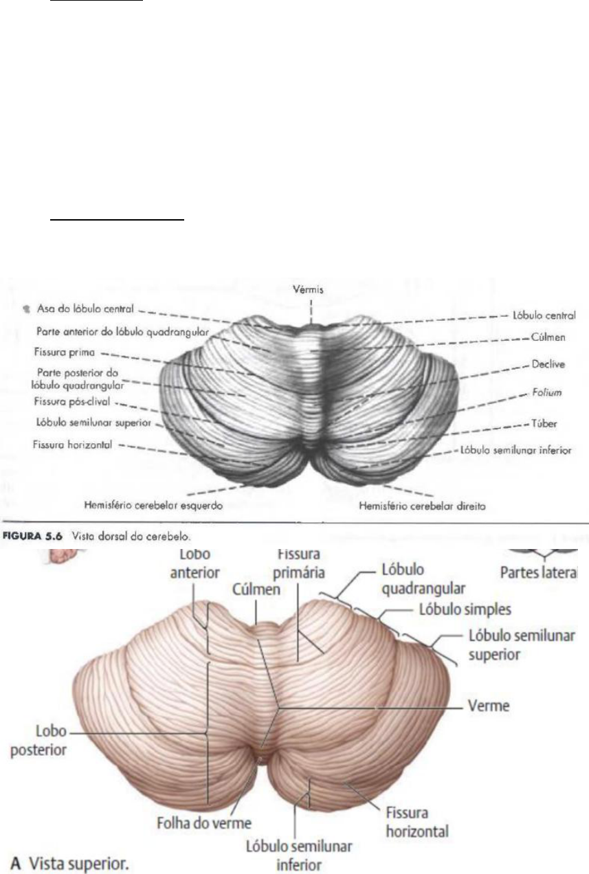ANATOMIA DO CEREBELO – Fonte: MACHADO (3ª edição) Generalidades: Situa-se dorsalmente ao bulbo e à ponte, contribuindo para a formação do IV ventrículo; Está separado do lobo occipital do cérebro por uma prega da dura-máter denominada tenda do cerebelo; Liga-se à medula e ao bulbo pelo pedúnculo cerebelar inferior e à ponte e ao mesencéfalo pelos pedúnculos cerebelares médio e superior, respectivamente; É importante para a manutenção da postura, equilíbrio, coordenação dos movimentos e aprendizagem de habilidades motoras. Embora tenha fundamentalmente função motora, estudos recentes demonstraram que também está envolvido em algumas funções cognitivas. Aspectos anatômicos: Anatomicamente, distingue-se no cerebelo uma porção ímpar e mediana, o VÉRMIS, ligado a duas grandes massas laterais, os hemisférios cerebelares. O vérmis é pouco separado dos hemisférios na face dorsal do cerebelo, o que não ocorre na face ventral, onde dois sulcos bem evidentes o separam das partes laterais A superfície do cerebelo apresenta sulcos de direção predominantemente transversal, que delimitam lâminas finas denominadas folhas do cerebelo. Existem também sulcos mais pronunciados, as fissuras do cerebelo, que delimitam lóbulos, cada um deles podendo conter várias folhas. Os sulcos, fissuras e lóbulos do cerebelo, do mesmo modo como ocorre nos sulcos e giros do cérebro, aumentam consideravelmente a superfície do cerebelo, sem grande aumento do volume. Internamente, vê-se que o cerebelo é constituído de um centro de substância branca, o corpo medular do cerebelo, de onde irradiam as lâminas brancas do cerebelo, revestidas externamente por uma fina camada de substância cinzenta, o córtex cerebelar. Os antigos anatomistas denominaram "árvore da vida" a imagem do corpo medular do cerebelo, com as lâminas brancas que dele irradiam (Figura 5.5). No interior do corpo medular existem quatro pares de núcleos de substância cinzenta (Figura abaixo), que são os núcleos centrais do cerebelo: denteado, interpósito (subdividido em emboliforme e globoso), e o fastigial. Os núcleos centrais do cerebelo têm grande importância funcional e clínica: deles saem todas as fibras nervosas eferentes do cerebelo. LÓBULOS E FISSURAS: Os lóbulos do cerebelo recebem denominações diferentes no vérmis e nos hemisférios. A cada lóbulo do vérmis correspondem dois nos hemisférios (Figura 5.6). São ao todo 17 lóbulos e oito fissuras, com denominações próprias, entretanto, a maioria dessas estruturas não tem isoladamente importância funcional ou clínica e não precisam ser memorizadas embora constem das figuras. São importantes e devem ser identificadas nas peças apenas os lóbulos: NÓDULO, FLÓCULO e TONSILA; e as fissuras posterolaterais e primária. O nódulo é o último lóbulo do vérmis e fica situado logo acima do teto do IV ventrículo (Figura 5.S). O floculo é um lóbulo do hemisfério, alongado transversalmente e com folhas pequenas situadas logo atrás do pedúnculo cerebelar inferior (Figura 5.5). Liga-se ao nódulo pelo pedúnculo do floculo, constituindo o lobo floculo-nodular, separado do corpo do cerebelo pela fissura posterolateral (Figura 5.5). O lobo floculo-nodular é importante por ser a parte do cerebelo responsável pela manutenção do equilíbrio. As tonsilas são bem evidentes na face ventral do cerebelo, projetando-se medialmente sobre a face dorsal do bulbo (Figura 5.4). Esta relação é importante pois, em certas situações, elas podem ser deslocadas caudalmente, formando uma hérnia de tonsila que penetra no forame magno, comprimindo o bulbo, o que pode ser fatal. DIVISÃO ANATÔMICA: Os lóbulos do cerebelo podem ser agrupados em estruturas maiores, os lobos separados pelas fissuras posterolateral e prima; assim, tem-se uma divisão transversal em que a fissura posterolateral divide o cerebelo em um lobo floculo-nodular e o corpo do cerebelo. O corpo do cerebelo é dividido em lobo anterior e lobo posterior pela fissura primária (Figura 5.7). PEDÚNCULOS CEREBELARES: São três os pedúnculos cerebelares: superior, médio e inferior (aparecem seccionados nas Figuras 5.2 e 5.4). -PEDÚNCULO CEREBELAR SUPERIOR: liga o cerebelo ao mesencéfalo. -PEDÚNCULO CEREBELAR MÉDIO: é um enorme feixe de fibras que liga o cerebelo à ponte e constitui a parede dorsolateral da metade cranial do IV ventrículo (Figura 5.2). -PEDÚNCULO CEREBELAR INFERIOR: liga o cerebelo à medula.obs.: Considera-se como limite entre a ponte e o pedúnculo cerebelar o ponto de emergência do nervo trigêmeo.