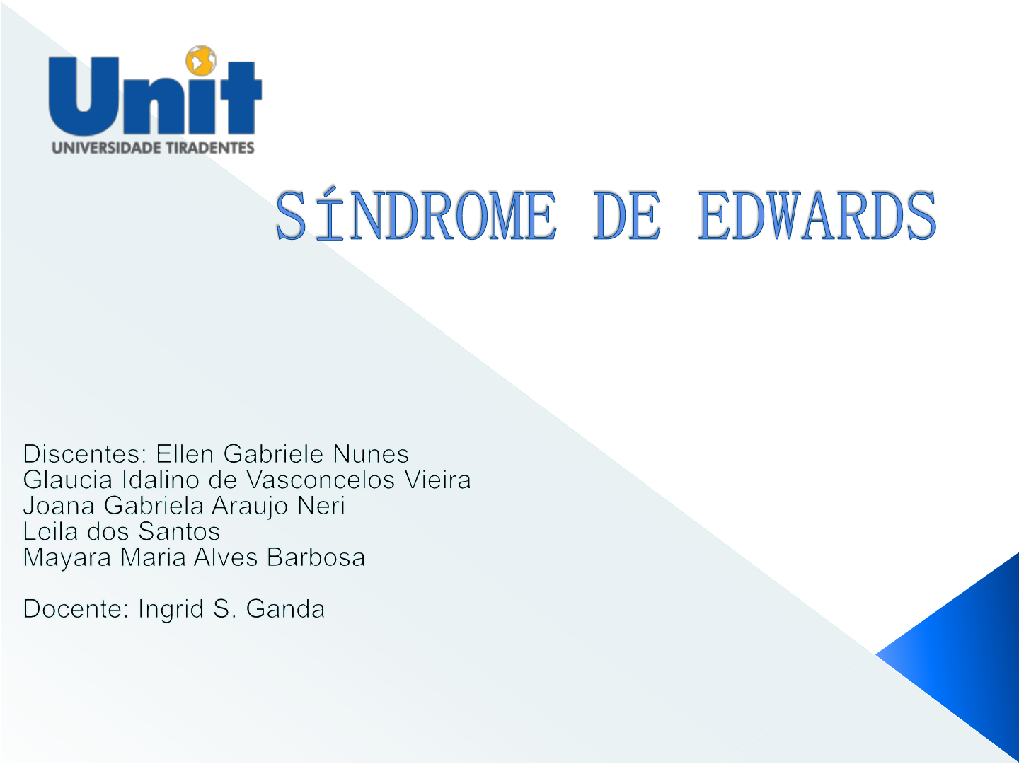 SÍNDROME DE EDWARDS Discentes: Ellen Gabriele Nunes Glaucia Idalino de Vasconcelos Vieira Joana Gabriela Araujo Neri Leila dos Santos Mayara Maria Alves Barbosa Docente: Ingrid S. Ganda INTRODUÇÃO A trissomia do cromossomo 18 foi descrita pela primeira vez em 1960 pelo professor John Edwards. Corresponde à segunda trissomia mais freqüente nos seres humanos. Malformações severas, profundo retardo mental e alta taxa de mortalidade são traços característicos da Trissomia 18. Os acometidos raramente chegam à adolescência, sendo a gravidade das alterações cardiorespiratórias fator determinante do prognóstico. Ocorre na divisão celular Para que a divisão celular aconteça, ou seja, uma célula mãe se divida em duas células filhas, é necessário que o material genético no interior delas (o cromossomo, o DNA) também se multiplique. Quando o cromossomo vai se dividir, acaba não sendo uma divisão exata e uma célula fica com mais cromossomos que a outra, nesse caso temos a trissomia 18. EPIDEMIOLOGIA As trissomias são as alterações cromossômicas mais comuns, estando presentes em até 20% dos abortos espontâneos que tiveram cariótipos analisados. Menos de 1% dos nascidos vivos são portadores de trissomias, dentre as quais as mais importantes são as que envolvem os cromossomos 21, 18 e 13. Um estudo realizado para analisar diagnóstico pré-natal de trissomias detectou 27 fetos portadores de trissomias, sendo 12 portadores de trissomia do 21 (síndrome de Down), 11 portadores de trissomia do 18 e 4 portadores de trissomia do 13 (síndrome de Patau) Manifestações Clínicas A SE caracteriza-se por um quadro clínico amplo, com acometimento de múltiplos órgãos e sistemas. As características fenotípicas comumente presentes na síndrome, de acordo com a topologia, consistem de: achados neurológicos; anormalidades de crescimento, crânio e face, tórax e abdome, extremidades, órgãos genitais, pele e fâneros, além de malformações de órgãos internos. Aspectos Citogenéticos O fenótipo da síndrome de Edwards manifesta-se à partir de diferentes alterações genotípicas que envolvem o cromossomo 18. Na maioria das vezes (90 a 94% dos casos) ocorre uma trissomia completa desse cromossomo. Podemos dividir a genotipagem da síndrome de Edwards em 3 grupos: A) As que ocorrem por trissomia livre, constituindo as aneuploidias; B) As que ocorrem por mosaicismo; C) Aquelas cujas alterações cromossômicas são estruturais, sendo chamadas de rearranjos cromossômicos. Conclusão A Trissomia do 18 apresenta-se como uma doença com alta morbidade e elevadíssimo índice de abortamento e de mortalidade pós-natal. Portanto, a realização do diagnóstico pré-natal é de grande valia tanto para os pais como para a comunidade científica em geral. O uso de métodos invasivos para o diagnóstico torna-se inquestionável quando há chances elevadas de ocorrência de uma síndrome mórbida como a de Edwards. Referências Rafael Fabiano M. Et al. Trissomia 18: revisão dos aspectos clínicos, etiológicos, prognósticos e éticos. Rev Paul Pediatr 2013;31(1):111-20. Filipe Brum Machado. Et al. Edwards Syndrome: a case report. Revista Científica da Faculdade de Medicina de Campos. Vol. 2, nº 1, 2007.