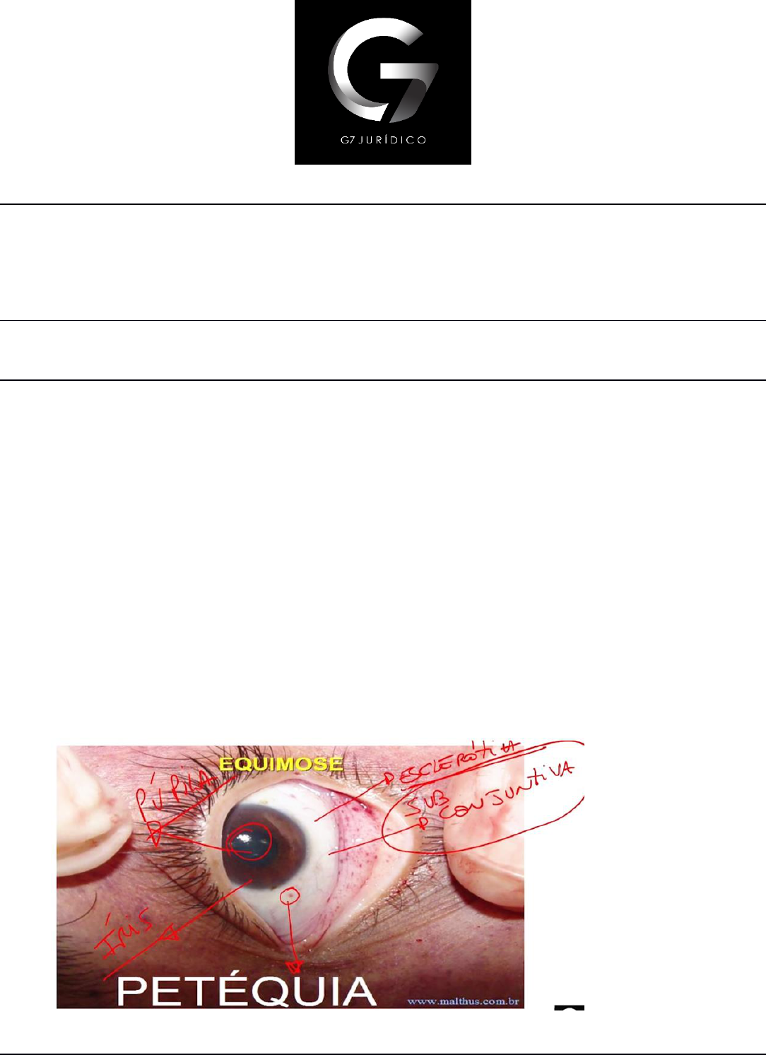 1 www.g7juridico.com.br DELEGADO CIVIL André Uchoa Medicina Legal Aula 03 ROTEIRO DE AULA ◦ Equimoses É uma espécie de lesão, conhecida popularmente por hematoma. É a infiltração do sangue extravasado nas malhas dos tecidos adjacentes à lesão que pode ser visto por transparência da membrana (geralmente é a pele, mas pode ser a pleura, o periósteo, a conjuntiva). - Em geral, deve-se a rotura de capilares, vênulas e arteríolas (mas pode formar-se por diapedese - passagem das hemácias através das paredes dos tecidos; HIGINO) - O sangue está fora dos vasos sanguíneos; - Enquanto nas equimoses o sangue está fora dos vasos sanguíneos, na rubefação o sangue está dentro dos vasos, não houve extravasamento do sangue. ◦ Tipos de Equimoses: 1- Petéquia: tem tamanho de um ponto a uma cabeça de alfinete (Equimose puntiforme). 2 www.g7juridico.com.br Equimoses subconjutivais são comuns em enforcamentos. 2- Sugilação: é formada por confluência de numerosas lesões puntiformes em uma área bem delineada (Milhares de petéquias numa mesma região). Ex: Chupão. 3- Sufusão (equimoma): representa hemorragia mais extensa, de tamanho variado (um grande derramamento de sangue, um lençol hemorrágico). 4- Mancha de Pautaf: são equimoses amplas de coloração azulada no pulmão. 5- Víbices: são equimoses em faixas duplas; paralelas. De acordo com o Prof. Higino, elas são quase paralelas, pois são divergentes na ponta e convergentes no punho. O sangue é jogado para a periferia dos vasos, gerando as faixas duplas. Ex: pancada de cassetete. 3 www.g7juridico.com.br ➔ Enquimose ≠ Equimose ≠ Equimoma: Enquimose é o gênero, é a infiltração do sangue extravasado nas malhas dos tecidos adjacentes à lesão que pode ser visto por transparência da membrana. Já Equimoma é sinônimo de sufusão, é a representação de uma hemorragia mais extensa, de tamanho variado. Enquimose é uma equimose de fundo emocional (Delton Crossi). ◦ Forma: 1 - forma pouco definida (regra); 2 - excepcionalmente pode denunciar o instrumento (lesão com assinatura – olhando o formato da lesão é possível dizer qual o instrumento vulnerante que a causou); 3 – víbices, lesões com assinatura (exceção); Exemplo de lesão com assinatura ➔ Questão de Prova: 1) Quanto a forma, a víbice é uma equimose: a) Em grãos; 4 www.g7juridico.com.br b) Pontilhada; c) De grande extensão; d) Em estrias; e) Em placa R: Estrias – letra D ◦ Alguns Ossos Importantes do Esqueleto Humano: 1- Braço: úmero 2- Antebraço: ulna e rádio 3- 12 costelas 4- Externo (frente do peito, no mediastino, entre os dois pulmões) 5- Escápula (atrás dos ossos da clávicula) 6- 8 ossos no crânio: 1 occipital (atrás), 1 frontal, 2 parietais (lateral superior), 2 temporais (lateral inferior), esfenoide e etmoide (embaixo) 7- 2 ossos Bacia: ilíacos – Junção forma ângulo pubiano; se > 90º - ossada feminina, se < 90º - ossada masculina 8- 4 ossos na Perna: Fêmur (maior osso do corpo, fica na coxa), patela (joelho), tíbia (frente), fíbula (atrás) ◦ Equimoses Traumáticas x Equimoses Espontâneas: Na equimose traumática é aquela em que o extravasamento de sangue é causado por um agente vulnerante externo, já nas equimoses espontâneas o sangue extravasado é causado por outros fatores, sendo eles: 1 – As equimoses espontâneas podem ser causadas por certas doenças hemorrágicas (púrpuras, epilepsia, varíola, etc.) 2 – Pessoas idosas, pele com pouca resistência; 5 www.g7juridico.com.br 3 – Emocionais (enquimoses) pag. 307 livro Delton Crossi.; ◦ Equimoses Post Mortem (Livores Hipostáticos) ≠ Equimoses: Equimoses só ocorrem em vivos, nunca em cadáveres, pois a infiltração de sangue é um sinal vital. Já as equimoses post mortem ou livores hipostáticos são o acúmulo de sangue nos vasos das áreas de maior declive pela ação gravitacional no corpo, após a morte. Os livores são móveis com até 8 horas de morte, depois disso eles se fixam na região de maior declive. - Técnica de Bonnet: é a técnica utilizada em autópsias para determinar se as manchas de sangue apresentadas no cadáver foram produzidas em vida (equimoses) ou post mortem (livores cadavéricos). Consiste em fazer um corte naquele corpo onde está a mancha de sangue e observar se o mesmo está infiltrado nos tecidos (equimoses) ou se está livre, causando sangramento no corte (livores cadavéricos). ◦ Espectro Equimótico de LeGran du Saulle: A hemoglobina tem a porção protéica (globina) separada do núcleo heme, que contém ferro. O núcleo heme, por sua vez, perde o ferro, que é agrupado em moléculas complexas, as ferritinas, para formar grãos de hemossiderina. O resto do heme é transformado em bilivirdina, de cor esverdeada, e bilirrubina, de cor amarelada. Assim, entende-se por que a coloração final da equimose é amarelada. - Evolução Cromática das Equimoses: 1º vermelho 2º aroxeado 3º azulado 4º esverdiado 5º amarelado 6 www.g7juridico.com.br 6º esvaenece 7º reabsorção das hemácias pelos macrófagos (fagocitose) 8º degradação da molécula de hemoglobina 9º nas equimoses conjuntivais o espectro não se verifica; Essa variação cromática da equimose permite aferir o nexo temporal da lesão. - Nas equimoses de conjutivais não se verifica a variação cromática de Legrand du Saulle. Ela começa, evolui e termina vermelho vivo. Existem 2 correntes para explicar esse fenômeno: a 1ª afirma que pelo tecido ser muito vascularizado, muito oxigenado, isso não acontece; 2ª corrente, Prof. Higino, diz que não há explicação médica para o fenômeno (pag. 200 livro Higino). ◦ Equimoses à Distância: Ela aparece num local diverso de onde o trauma ocorreu. Ex.: sofre um trauma do crânio, há extravasamento de sangue que se deposita na região das pálpebras. É o chamado Sinal do Zorro ou do guaxinim. ◦ Mancha de Paltauf: É uma equimose visceral nos pulmões de afogados 