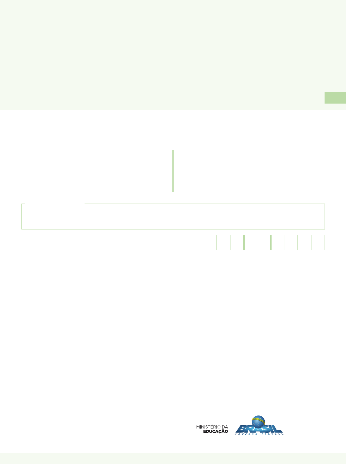 Caderno M0505 MATEMÁTICA Letramento I Nome do aluno(a) Data de Nascimento do aluno(a) NOVO MAIS EDUCAÇÃO 2017 MT5EF Caro(a) aluno(a), Você está participando do Novo Mais Educação. Sua participação é muito importante para sabermos como está a educação em nosso país. • Hoje, você vai fazer atividades de Matemática. • Responda com calma, procurando não deixar nenhuma questão em branco. Bom teste! NOVO MAIS EDUCAÇÃO BL03M05 01) (M052250E4) O gráfico a seguir apresenta o preço de alguns tipos de feijões em um supermercado. Preto Carioca Vermelho Fradinho Tipos de Feijões R$ 7,00 R$ 6,00 R$ 5,00 R$ 4,00 R$ 3,00 R$ 2,00 R$ 1,00 V a lo r d o q u il o g ra m a e m r e a is R$ 8,00 R$ 9,00 R$ 3,28 R$ 1,98 R$ 7,96 R$ 3,56 De acordo com esse gráfico, qual desses feijões é o mais barato? A) Preto. B) Carioca. C) Vermelho. D) Fradinho. 02) (M050504ES) Uma das decomposições do número 41 098 é A) 41 unidades de milhar e 98 unidades. B) 41 unidades de milhar e 98 dezenas. C) 41 unidades de milhar, 9 centenas e 8 unidades. D) 41 dezenas de milhar, 9 centenas e 8 unidades. 03) (M052222E4) Ivan é marceneiro e recebeu uma encomenda para fazer um armário. Ele levou 5 semanas para deixar esse armário pronto. Quantos dias Ivan levou para deixar o armário pronto? A) 5 B) 7 C) 25 D) 35 04) (M051558E4) Observe a reta numérica abaixo. Ela está dividida em segmentos de mesma medida. 4 8 20 32 J O ponto J representa qual número nessa reta? A) 31 B) 30 C) 24 D) 21 M0505 1 BL03M05 05) (MEF0086PC) Observe o retângulo destacado na malha quadriculada abaixo. Cada lado do quadradinho dessa malha equivale a 1 cm. Qual é a medida do perímetro desse retângulo? A) 18 cm B) 12 cm C) 6 cm D) 3 cm 06) (M050722A9) Marcelo foi a uma lanchonete em que o cliente monta seu próprio sanduíche. O cliente pode escolher entre 3 variedades de pães e 6 tipos de recheios. De quantas maneiras diferentes Marcelo pode montar um sanduíche escolhendo uma variedade de pão e um tipo de recheio? A) 2 B) 3 C) 9 D) 18 07) (M090203C2) Para a venda de seus produtos, uma indústria fabrica caixas com tampa, na forma de um paralelepípedo retângulo, conforme o desenho abaixo. Qual é a figura que melhor representa o molde dessa caixa? A) B) C) D) 08) (MEF0055PC) Norma usou 23,85 m de renda branca e 17,5 m de renda azul para fazer uma cortina. Quantos metros de renda, no total, Norma usou para fazer essa cortina? A) 41,35 B) 40,35 C) 25,60 D) 24,50 M0505 2 BL07M05 09) (M050028EX) Observe abaixo a casa que Ana desenhou usando 8 figuras geométricas. Quantos triâgulos aparecem nessa casa? A) 1 B) 2 C) 3 D) 4 10) (M050436ES) Na malha quadriculada abaixo, está pintado de cinza o desenho que Mariana obteve reduzindo uma figura. Em qual das malhas quadriculadas abaixo está representada a figura que originou a redução desenhada por Mariana? A) B) C) D) M0505 3 BL07M05 11) (M050178A8) Marcelo foi ao supermercado com uma lista de compras. Ao comprar os produtos, ele anotou o valor de cada um. Arroz R$ 7,70 Manteiga R$ 2,30 Pão de forma R$ 3,15 1 litro de leite R$ 1,40 Ao passar pelo caixa, quanto Marcelo pagou por essa compra? A) R$ 13,55 B) R$ 14,50 C) R$ 14,55 D) R$ 14,60 12) (M050051H6) Na última campanha de vacinação, uma veterinária colou um cartaz na bancada da recepção de sua clínica, conforme representado abaixo. 150 cm Qual é a altura aproximada, em centímetros, do cartaz que a veterinária colou nessa bancada? A) 16 B) 50 C) 100 D) 150 13) (M052244E4) Priscila foi à feira e comprou 5 peras, 4 maçãs, 6 mamões e 3 laranjas. Qual é a fração que representa o número de laranjas em relação ao total de frutas compradas por Priscila nessa feira? A) 3 18 B) 18 15 C) 15 3 D) 18 3 M0505 4 BL07M05 14) (M050059ES) Veja uma das decomposições de um número no quadro abaixo. 3 x 1 000 + 4 x 100 + 5 x 10 Qual é esse número? A) 3 450 B) 3 410 C) 3 405 D) 3 400 15) (M050617ES) O prefeito de uma cidade resolveu reformar a praça da igreja, construindo um jardim ao redor dessa praça. O jardim corresponde à área destacada na malha quadriculada abaixo. Considerando que o lado de cada quadrado dessa malha corresponde a 1 m, qual é a medida da área total desse jardim? A) 64 m2 B) 50 m2 C) 46 m2 D) 28 m2 16) (MEF0104PC) Resolva a operação abaixo. 136 ÷ 4 Qual é o resultado dessa operação? A) 50 B) 34 C) 31 D) 26 M0505 5 BL05M05 17) (M080443E4) Certo dia, voltando da escola, as crianças estavam dispostas no transporte escolar, conforme representado no desenho abaixo. M ara R aul R ian Sara C aio José Leila Júlia A na M otorista Nesse dia, a última criança a chegar em casa foi a que estava sentada mais perto do motorista. Qual foi a última criança a chegar em casa nesse dia? A) Ana. B) Leila. C) Mara. D) Rian. 18) (M060321E4) Em um grupo de dez crianças, sete delas gostam de andar de bicicleta. Qual é a fração que representa o número de crianças que gostam de andar de bicicleta em relação a esse total de crianças? A) 10 3 B) 10 7 C) 7 10 D) 3 10 19) (M050190B1) Para fazer um tapete, Maria usou 1,34 m de barbante preto, 8,5 m de barbante vermelho e 1,55 m de barbante verde. Quantos metros de barbante ela usou ao todo para fazer esse tapete? A) 2,89 m B) 9,84 m C) 10,05 m D) 11,39 m M0505 6 BL05M05 20) (M050533A9) Fátima dividiu o retângulo desenhado na malha quadriculada abaixo em duas partes iguais e pintou de cinza uma delas. Quanto mede a área dessa parte pintada de cinza? A) 6 m2 B) 7 m2 C) 8 m2 D) 12 m2 21) (M052236E4) Observe a conta no quadro abaixo. 12 008 + 5 096 Qual é o resultado dessa conta? A) 17 014 B) 17 094 C) 17 103 D) 17 104 22) (M031971E4) A tabela abaixo apresenta a quantidade de alunos que se matricularam em um curso de natação em 2013. Mês Número de alunos Março 10 Abril 12 Maio 16 Junho 15 Julho 13 Agosto 11 De acordo com essa tabela, a quantidade de alunos matriculados no mês de junho foi A) 16 B) 15 C) 13 D) 12 M0505 7 BL05M05 23) (M052231E4) O