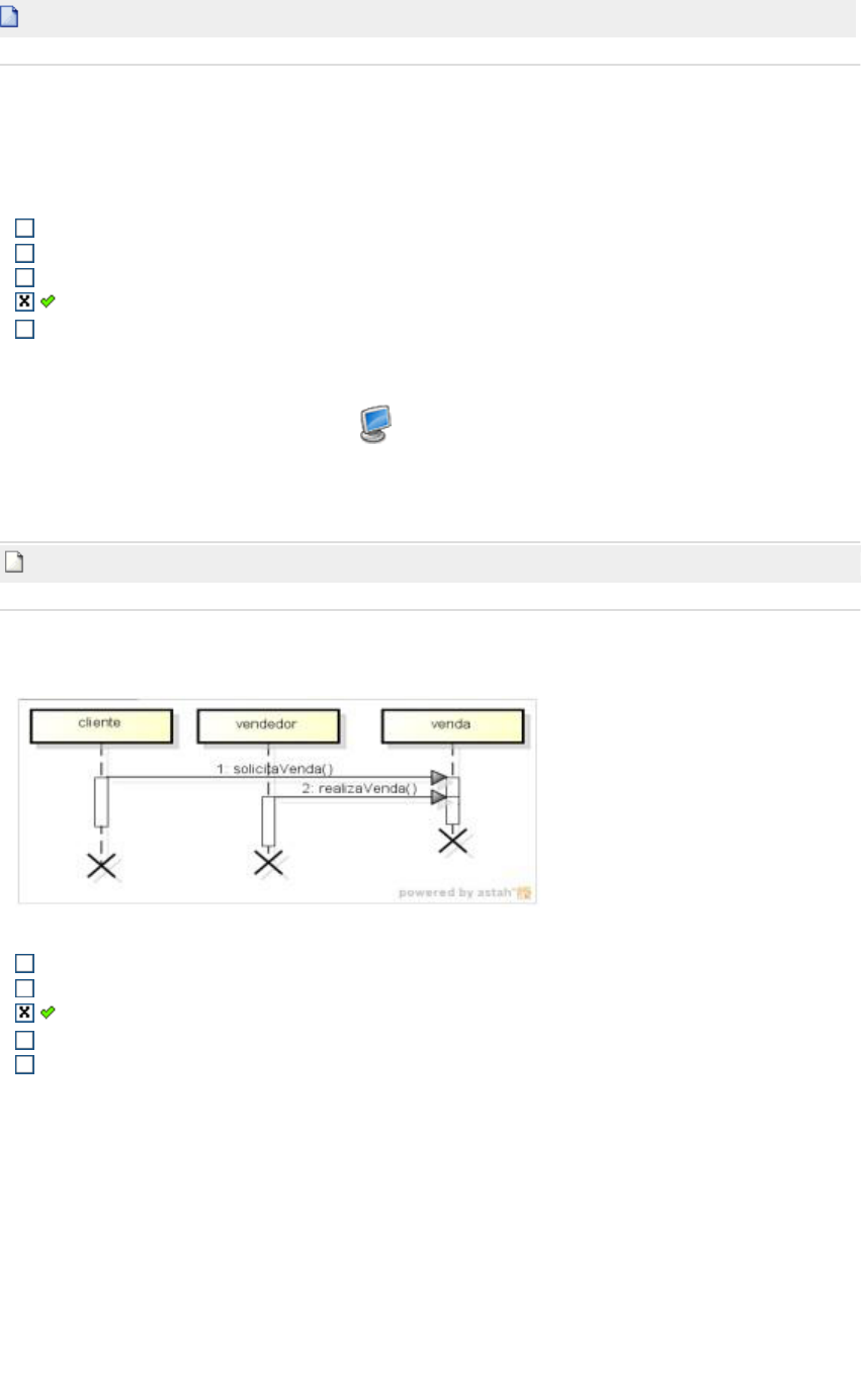 1a Questão Um padrão controlador é o primeiro objeto além da camada de interface com o usuário que é responsável por receber ou tratar uma mensagem de operação do sistema, Este é um padrão de projeto de delegação, pois, normalmente um controlador deve delegar a outros objetos o serviço que precisa ser feito. Dentre os conceitos abaixo, assinale aquele que complementa o objtivo deste padrão. ele controla ou coordena os métodos; ele coordena ou controla a recursividade; ele coordena ou controla as generalizações; ele coordena ou controla a atividade; ele coordena ou controla as classes; Respondido em 11/06/2019 23:25:45 Gabarito Coment. 2a Questão Dado o diagrama de sequência identifique o padrão GRASP Information Expert Polymorphis Controller Indirection Pure Fabrication Respondido em 11/06/2019 23:25:55 Explicação: O padrão controlador atribui a responsabilidade de manipular eventos do sistema para uma classe que não seja de interface do usuário (UI) que representa o cenário global ou cenário de caso de uso. Um objeto controlador é um objeto de interface não-usuário, responsável por receber ou manipular um evento do sistema. 3a Questão (FCC - 2012) O componente Controller do MVC: Define o comportamento da aplicação, as ações do usuário para atualizar os componentes de dados e seleciona os componentes para exibir respostas de requisições. Notifica os componentes de apresentação das mudanças efetuadas nos dados e expõe a funcionalidade da aplicação. Envia requisições do usuário para o controlador e recebe dados atualizados dos componentes de acesso a dados. Responde às solicitações de queries e encapsula o estado da aplicação. É onde são concentradas todas as regras de negócio da aplicação e o acesso aos dados. Respondido em 11/06/2019 23:26:19 Explicação: Temos os seguintes Padrões GRASP: Expert (Especialista), Creator (Criador), High Coesion, Low Coupling (Baixo Acoplamento), Controller. Padrões GRASP descrevem princípios fundamentais de atribuição de responsabilidade a objetos. Controller (Controlador) - Padrão bastante utilizado no MVC, no Servlet. O padrão controlador atribui a responsabilidade de manipular eventos do sistema para uma classe que não seja de interface do usuário (UI) que representa o cenário global ou cenário de caso de uso. Um objeto controlador é um objeto de interface não-usuário, responsável por receber ou manipular um evento do sistema. Atribuir a responsabilidade do tratamento de um evento do sistema a uma classe que representa uma das seguintes escolhas: Representa o ¿sistema¿ todo (controlador fachada) Representa um tratador oficial de todos os eventos de sistema de um caso de uso (controlador de caso de uso). 4a Questão Com relação à arquitetura MVC, considere: I. O MODEL representa os dados da empresa e as regras de negócio que governam o acesso e atualização destes dados. II. O VIEW acessa os dados da empresa através do MODEL e especifica como esses dados devem ser apresentados. É de responsabilidade do VIEW manter a consistência em sua apresentação, quando o MODEL é alterado. III. O CONTROLLER traduz as interações do VIEW em ações a serem executadas pelo MODEL. Com base na interação do usuário e no resultado das ações do MODEL, o CONTROLLER responde selecionando uma VIEW adequada. IV. Permite uma única VIEW para compartilhar o mesmo modelo de dados corporativos em um fluxo de comunicação sequencial. Está correto o que se afirma em II, III e IV, apenas. I, II, III e IV. I e II, apenas. II e III, apenas. I, II e III, apenas. Respondido em 11/06/2019 23:26:31 Explicação: A afirmativa IV é incorreta porque o padrão de arquitetura MVC (Model-View- Controller) é uma combinação de padrões centrada no padrão Observer e consiste de três participantes: Model: representa os dados da aplicação e regras de negócio associadas com os dados. Notifica o View sobre alterações. View: é um Observer para o Model. Notifica o Controller sobre eventos iniciados pelo usuário e lê dados do Model. Controller: é um Observer para o View. Encapsula lógica de controle que afeta o Model e seleciona View. O MVC é utilizado em muitos projetos devido à arquitetura que possui, o que possibilita a divisão do projeto em camadas muito bem definidas. Cada uma delas, o Model, o Controller e a View, executa o que lhe é definido e nada mais do que isso. A utilização do padrão MVC trás como benefício isolar as regras de negócios da lógica de apresentação, a interface com o usuário. Isto possibilita a existência de várias interfaces com o usuário que podem ser modificadas sem que haja a necessidade da alteração das regras de negócios, proporcionando assim muito mais flexibilidade e oportunidades de reuso das classes. 5a Questão (CESPE - 2010 - INMETRO) A coesão e o acoplamento são formas de se avaliar se a segmentação de um sistema em módulos ou em componentes foi eficiente. Acerca da aplicação desses princípios, assinale a opção correta. Um benefício da alta coesão é permitir realizar a manutenção em um módulo sem se preocupar com os detalhes internos dos demais módulos. Os componentes ou os módulos devem ser fortemente coesos e fracamente acoplados. O baixo acoplamento pode melhorar a manutebilidade dos sistemas, pois ele está associado à criação de módulos como se fossem caixas-pretas. A modularização do programa em partes especializadas pode aumentar a qualidade desses componentes, mas pode prejudicar o seu reaproveitamento em outros programas. Os componentes ou os módulos devem apresentar baixa coesão e um alto grau de acoplamento. Respondido em 11/06/2019 23:26:47 6a Questão Qual padrão GRASP tem como um de seus objetivos minimizar o impacto na camada de negócio referente às alterações nos requisitos da interface com o usuário? Alta Coesão Especialista da Informação Controlador Indireção Mediador Respondido em 11/0