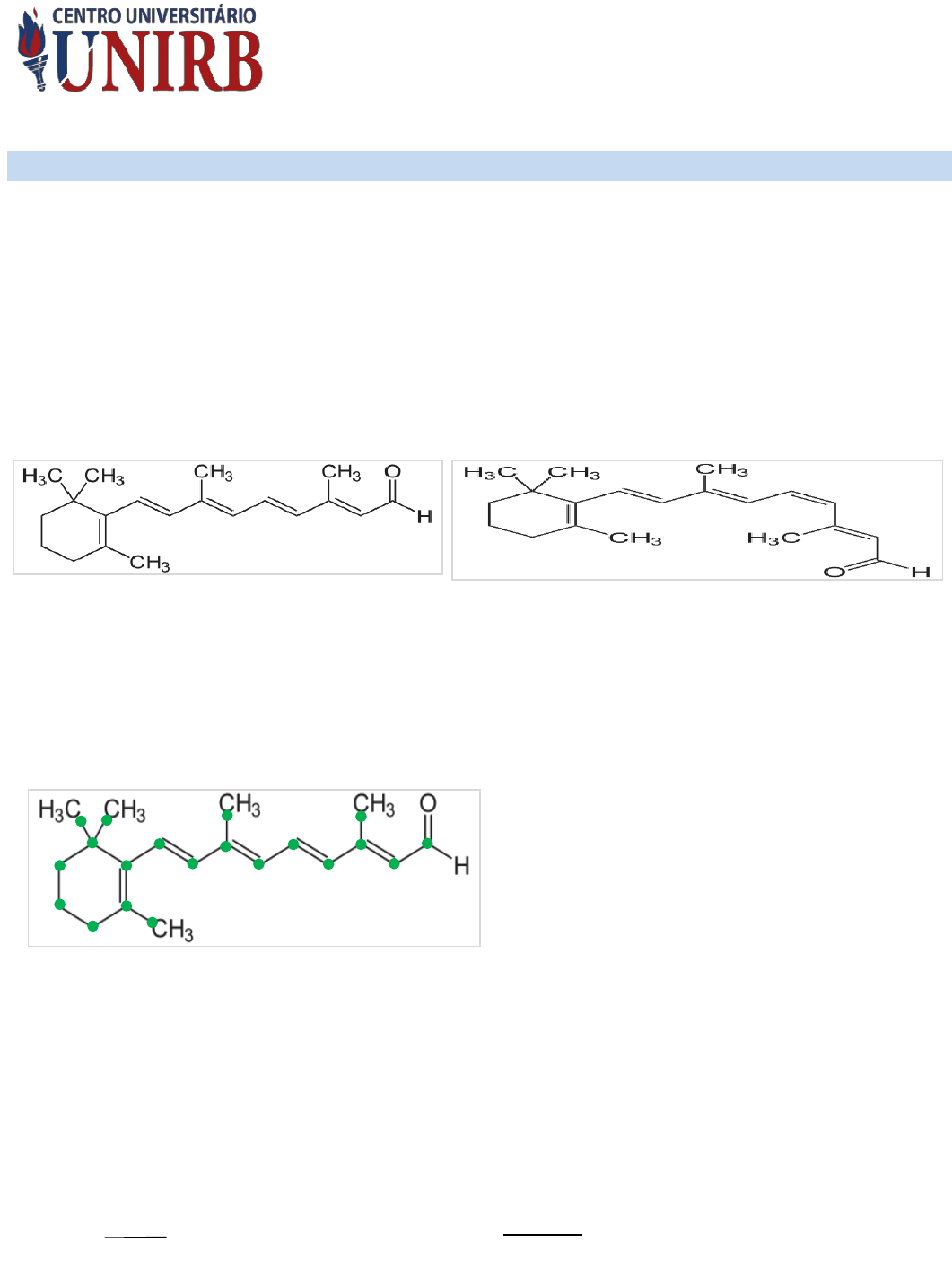 Centro Universitário UNIRB Disciplina: Química Geral Professor: Thiago Fontes Algo interessante para os químicos investigarem é como o olho funciona. Qual química está envolvida na detecção da luz e na transmissão dessas informações para o cérebro? A retina do olho é composta de dois tipos de células fotorreceptoras: bastonetes (responsáveis pela visão mediante pouca luz) e cones (responsáveis pela visão de cores na luz brilhante). Cada bastonete contém vários milhões de moléculas de rodopsina, que é um complexo de uma proteína, a opsina, e de uma molécula derivada da vitamina A, cis-retinal 11 (C20H28O). A detecção da luz envolve a conversão inicial de cis-retinal para seu isômero trans. É essa a função da luz: a elevada energia de um quantum de luz visível promove a quebra na ligação entre os carbonos 11 e 12. cis-retinal 11 Essa transformação gera um impulso elétrico, que é enviado ao cérebro. Dessa forma, as imagens são interpretadas pelo cérebro e compõem o que estamos vendo. Depois de formar a imagem, o trans-retinal terá de ser novamente convertido em cis-retinal, para que possamos receber mais luz e, assim, formar mais imagens. Esse processo é feito por meio de uma enzima chamada retinal-isomerase. 1ª QUESTÃO – Quantos elementos há na molécula do cis-retinal? Quantos átomos de cada elemento estão presentes? 2ª QUESTÃO – Qual tipo de ligação atômica existente entre os átomos do cis-retinal? ➢ É uma ligação covalente, entre ametais e ametal e hidrogênio, usando de mesmo elétrons por intermédio de compartilhamento para alcançarem à estabilidade. 3ª QUESTÃO – Sabendo que o cis-retinal possui massa molar igual a 284.4 g/mol, qual a porcentagem em massa de carbono no cis-retinal? ➢ Quantidade de elementos da molécula cis- retinal 11: 3 elementos, C (carbono), H (hidrogênio), O (oxigêncio) ➢ Quantidade de átomos: C20H28O A QUÍMICA DA VISÃO Valor: 4,0 pontos trans-retinal Disciplina: Química Geral Professor: Thiago Fontes Aluno: Everton da Rocha Dias Curso: Optometria – I Semestre ➢ 20 átomos C ----------- X 01 átomos C ----------- 12g/mol X= 240 X= 240g/mol de carbono 1 ➢ 100% ----------- 284,4g/mol de cis-retinal X ----------- 240,0g/mol de Carbono X= 24000 X= 84,3% de massa de carbono 284,4 H H H H H H H H H H H H A vitamina A, contém retinol, é uma molécula com várias insaturações (ligações duplas), e um grupo hidroxila, sendo, portanto, um álcool (e por isso possui a terminação -ol). O retinol sofre uma oxidação se transformando no retinal. Percebam que mudamos a terminação -ol por -al? Isto significa que o álcool foi convertido num aldeído. Mas … se a forma trans do retinal não forma a rodopsina, o que acontece quando todo cis-retinal é convertido em trans-retinal? Ficamos cegos? Ficaríamos…, mas toda a vez que o trans-retinal é formado, a enzima retinal isomerase transforma-o em cis-retinal novamente, e este por sua vez se religa a opsina para formar uma nova rodopsina, e aí reinicia-se o ciclo. 4ª QUESTÃO – Escreva a fórmula molecular do retinol. ➢ ➢ C20H30O Fórmula molecular do retinol ➢ CH3O molécula do grupo álcool Bom … que a vitamina A é importante no processo da visão nós já vimos. Infelizmente nosso organismo não produz vitamina A do nada (nem vitamina A, nem nenhuma outra vitamina!!!!). Nós precisamos obter a vitamina A na alimentação. E aí entra a cenoura em cena. A cenoura é uma das nossas principais fontes de vitamina A. O mais interessante é que a cenoura não tem um grama de retinol. Como assim? Se não tem retinol como é fonte de vitamina A? Para que comer então? Calma … eu explico. A cenoura tem a matéria prima da vitamina A. 5ª QUESTÃO – Pesquise qual composto presente na cenoura é transformado em vitamina A. Como e onde ocorre a transformação desse composto em retinol? ➢ A vitamina A é um micronutriente essencial, pertencente ao grupo de vitaminas lipossolúveis. Os compostos que formam a vitamina A (ou vitâmeros) são o retinol, o ácido retinoico, retinal e os carotenoides, sendo este últimos considerados provitaminas. Todos estes compostos possuem em sua estrutura um anel acetônico de beta-ionona por onde se liga uma cadeia de isoprenoides, chamado grupo retinil. O caroteno é um hidrocarboneto percursor da vitamina A, altamente presente nas cenouras. Esse composto desempenha um importante papel como potente antioxidante, eliminando radicais peróxidos, ele é então absorvido pelas células do intestino e armazenado, lá, sofrem outras modificações que permitem que se liguem à quilomícrons e sejam transportados pela corrente sanguínea até o fígado, onde são armazenados. As reservas de vitamina A no fígado sofrem hidrólise, quando é necessário que a vitamina A volte para a corrente sanguínea e chegue até determinada região do corpo. Certos carotenoides podem ser convertidos em vitamina A (provitaminas), no entanto, diferentemente do que se pensava, a eficiência dessa conversão é baixa, então a quantidade de vitamina A obtida H H H H H H H H H H H H H H H H H H H H H H C H C H C H C H C H C de frutas e vegetais que contém carotenoides é baixa. É importante o conhecimento dos valores indicados para consumo de cada vitamina. No caso da vitamina (A) a quantidade ideal é de 700 μg/ dia para mulheres e 900 μg/ dia para homens. Além de ser fundamental para a visão, a vitamina A ajuda no desenvolvimento ósseo, protege a pele, ajuda no sistema imunológico, e várias outras funções. E é claro, a falta de vitamina A, provoca várias doenças da visão, em vários estágios, podendo chegar à cegueira permanente. Fontes: https://www.infoescola.com/bioquimica/vitamina-a/ http://www.conhecer.org.br/enciclop/2011a/agrarias/cenoura.pdf