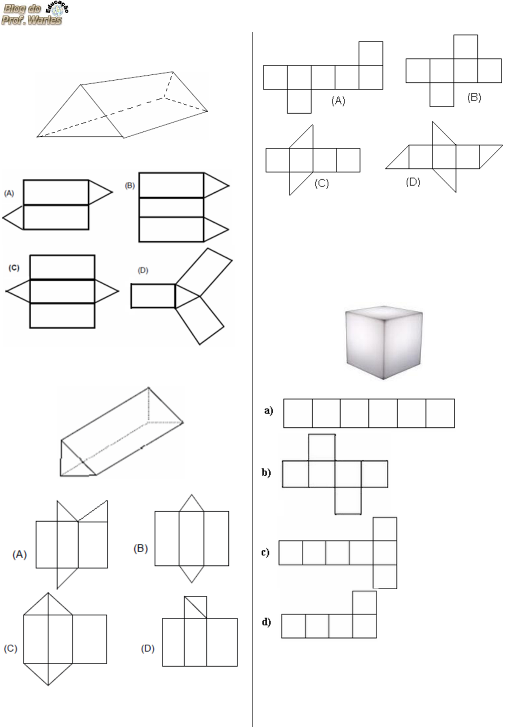 �D2 - Identificar propriedades comuns e diferenças entre figuras bidimensionais e tridimensionais, relacionando-as com suas planificações. (Prova Brasil). É comum encontrar em acampamentos barracas com fundo e que têm a forma apresentada na figura abaixo. (☻☻) Qual desenho representa a planificação dessa barraca? ******************************************** (Prova Brasil). O desenho abaixo representa um sólido. (☻☻) Qual é a planificação deste sólido. *************************************** Observe as figuras abaixo: Entre elas, a planificação de uma caixa em forma de cubo é a figura; (A) A (B) B (C) C (D) D ************************************************** Uma embalagem tem o formato de um cubo, como mostra a figura abaixo: Uma possível planificação desta embalagem é: ************************************************** A fazer um molde de um copo, em cartolina, na forma de cilindro de base circular qual deve ser a planificação do mesmo. *************************************************** Observe a representação de um tetraedro regular. Qual das seguintes planificações é a desse tetraedro regular? Resp. B ***************************************** Glória quer fazer um molde para construir caixas sem tampa, em forma de bloco retangular. Como mostra a figura abaixo. (☻☻) Para obter o molde, ela desmontou a caixa. O desenho que representa essa caixa desmontada é: Resp. A. *************************************** (SPEACE). Observe o dado representado pela figura abaixo. Que planificação corresponde a esse dado? Res. C ****************************************************** (SPAECE). A figura abaixo representa um cubo em que as faces opostas têm o mesmo símbolo. A planificação correta desse cubo é: Resp. C *************************************** Na aula de geometria, Letícia fez um molde para construir um poliedro, como mostra a figura abaixo. Qual poliedro Letícia poderá construir com esse molde? A) Uma pirâmide. B) Um paralelepípedo. C) Uma esfera. D) Um cubo. ******************************************************* (SPAECE). Observe, abaixo, a representação de um prisma e sua respectiva planificação, em que as faces estão numeradas. Nessa planificação, os pares de faces paralelas são A) 1 e 2, 4 e 6, 5 e 8. B) 1 e 2, 6 e 8, 7 e 4. C) 2 e 3, 4 e 7, 5 e 8. D) 3 e 6, 4 e 7, 5 e 8. *************************************** (PROEB). Observe o bloco retangular representado no desenho. Dentre as planificações abaixo, a que corresponde à planificação desse bloco retangular é: Resp. B *************************************** (SIMAVE). Veja a planificação do poliedro abaixo. Quantas arestas esse poliedro possui? A) 5 B) 7 C) 8 D) 12 ************************************** A figura abaixo representa a planificação de um sólido geométrico. Qual é esse sólido? A) Pirâmide da base hexagonal B) pirâmide de base triangular C) Prisma de base hexagonal D) Prisma de base triangular *************************************** Veja o prisma reto abaixo. A planificação desse prisma é Resp. D ************************************** Observe esta figura: Para construir uma caixa fechada com a forma desse poliedro, Marina precisa recortar algumas figuras geométricas em papelão e colar umas às outras usando fita adesiva. Então, as figuras que Marina precisa recortar são, no mínimo, (A) 1 triângulo e 2 retângulos. (B) 1 triângulo e 3 retângulos. (C) 2 triângulos e 2 retângulos. (D) 2 triângulos e 3 retângulos. ************************************** (PB 2011). Uma empresa confecciona embalagens para acondicionar um determinado produto. Veja a planificação desta embalagem abaixo. A embalagem depois de pronta é ******************************************************* (PB 2011). Juliana fez algumas figuras planas em papel cartão, como mostra abaixo. Ao juntar todas essas partes forma o sólido chamado (A) cone (B) prisma (C) cilindro (D) pirâmide *************************************** (PB – 2011). Um dado (cubo) foi desmontado da seguinte forma: Qual das letras é oposta a letra T quando montar o dado (cubo). (A) P (B) R (C) V (D) U *************************************************** (Saresp 2002). Observe os diferentes tipos de caixas utilizadas por uma loja de presentes: (☻☻) A vendedora monta de acordo com a escolha do cliente. Se ela utilizar os modelos que aparecem abaixo, vai obter caixas do tipo: (A) 4 e 1 (B) 3 e 4 (C) 2 e 3 (D) 1 e 2 ************************************************* (Saresp 2005). Abaixo estão desenhadas as vistas superior e frontal de uma figura. (☻☻) Dentre as opções abaixo, a única figura com essas vistas é: ****************************************************** (Saresp 2005). Bia montou a figura abaixo e, em seguida, fez uma colagem para obter um sólido de papelão. O sólido que Bia obteve foi: ******************************************************* (Saresp 2007). Melissa fez uma caixinha para guardar seus brincos. A planificação da caixinha está representada na figura abaixo. Como ficou a caixinha de Melissa depois de colada? ******************************************************* � PAGE �1�