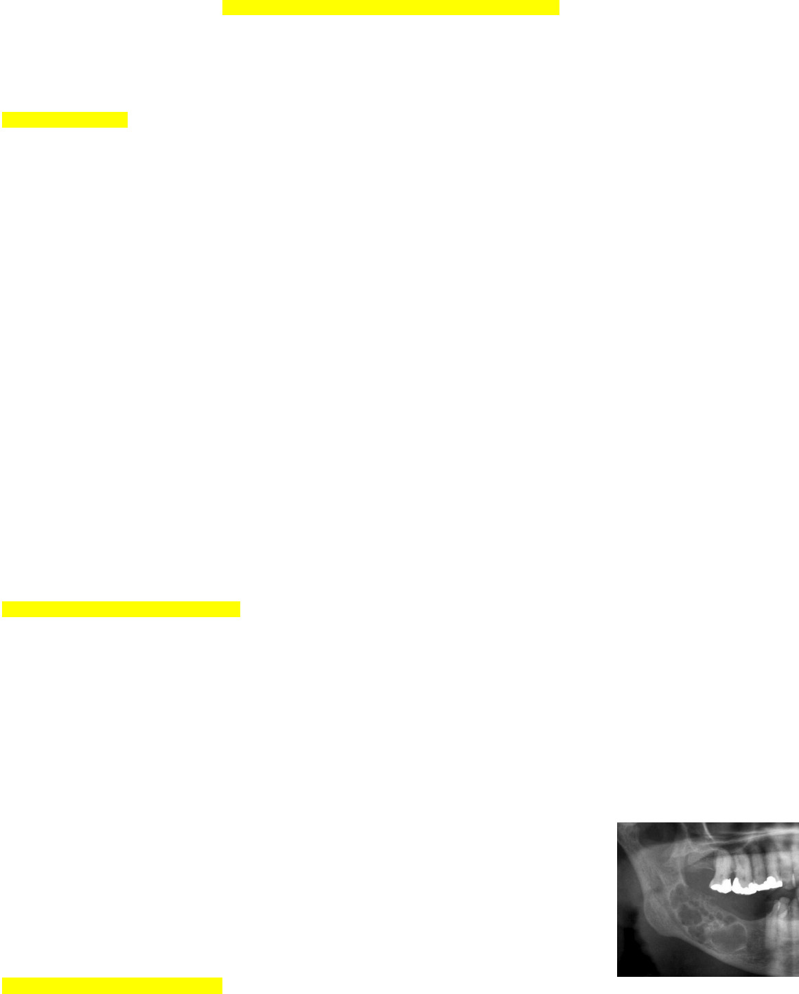 AULA 1: TUMORES ODONTOGÊNICOS (BENIGNOS) Origem das neoplasias: Tecidos dentais. Essa origem pode ser: Epitelial, mesenquimal e mista O cirurgião dentista deve reconhecer todas as variações biológicas e diagnosticar e tratar o paciente. AMELOBLASTOMA: Um dos tumores mais comuns, é agressivo Características clínicas: É benigno, agressivo e persistente Tem origem epitelial, de células derivadas do esmalte Comum em adultos aos 40 anos O corpo e ramo da mandíbula são os mais afetados Seu crescimento é lento É descoberto por achados radiográficos Normalmente assintomático, podendo ocorrer deslocamento de alguns dentes; dificuldade para movimentar a boca e Sensação de formigamento no rosto. Tratamento: é feito através de cirurgia para retirar o tumor, a parte do osso que foi afetada, nos casos mais graves, em que é necessário remover muito osso, o odontologista pode fazer uma reconstrução da mandíbula para manter a estética e funcionalidade dos ossos do rosto, usando pedaços de osso retirados de outra parte do corpo. O Ameloblastoma é dividido em 3: Ameloblastoma 1: Sólido, convencional ou multicistico Ameloblastoma 2: Cístico ou unicístico Ameloblastoma 3: Periférico ou extraósseo Ameloblastoma unicístico: caracteriza-se por estar dentro de um cisto e frequentemente é um tumor mandibular; Ameloblastoma multicístico: é o tipo de ameloblastoma mais comum, surgindo principalmente na região dos molares; Ameloblastoma periférico: é o tipo mais raro que afeta apenas os tecidos moles, sem afetar o osso. 1: AMELOBLASTOMA MULTICÍSTICO (ou intraósseo, ou sólido ou convencional) Características clínicas: Variação de idade, raro em crianças Não há predileção por sexo A dor e parestesia são comuns 80% na região da mandíbula Ocorre um aumento de volume Indolor Expansão dos ossos gnáticos (ossos da face) Características radiográficas: Apresenta-se como uma lesão radiolúcida multilocular bem delimitada Pode haver reabsorção de dentes adjacentes Limites bem definidos de forma semelhante a “favos de mel” ou “bolhas de sabão- são grandes”. A lesão multicística a imagem é difusa (RL + RO) Diagnóstico diferencial: Pode-se confundir com uma lesão cística Diagnóstico: Radiográfico e biópsia 2: AMELOBLASTOMA UNICISTICO (ou cístico) Características clínicas: Ocorre mais em jovens Assintomático e indolor Ocorre mais na parte posterior da mandíbula Características radiográficas: Imagem radiolúcida bem circunscrita Pode envolver a coroa de um 3º molar não erupicionado Diagnóstico diferencial: pode-se confundir com o Cisto dentígero, diferenciando histopatologicamente Tratamento: Enucleação Prognóstico: Recidiva 10% a 20% 3: AMELOBLASTOMA PERIFÉRICO (EXTRAÓSSEO) Características clínicas: Indolor, não ulcerada Pode ser séssil (sem elevação) ou pediculada (com elevação) Acomete mais a mucosa alveolar ou gengival Diagnóstico diferencial: Fibroma ou granuloma piogênico Tratamento: Excisão local (remove o local) Prognóstico: Recidiva rava TUMOR ODONTOGÊNICO EPITELIAL CALCIFICANTE (OU TUMOR PINDBORG) Características Clínicas: Não tem predileção por sexo Crescimento lento Aumento indolor Na parte posterior da mandíbula, no ramo Não é comum (menos de 1%) Características radiográficas: Imagem radiolúcida uni ou multilocular, podendo encontrar defeitos de estruturas calcificantes (imagem radiopaca), associado a dente impactado Tratamento: Ressecção local conservadora Prognóstico: Bom (recidiva 15%) TUMOR ODONTOGÊNICO ADENOMATOIDE (TOA) Características Clínicas Ocorre mais em jovens, acima de 30 anos Mais em maxila Aparece uma tumefação séssil no vestibular da maxila Assintomático Características radiográficas: Lesão radiolúcida circunscrita Envolve a coroa de um dente não erupicionado (comum em canino) Diagnóstico diferencial: Cisto dentígero Tratamento: Remoção dele por completo (fácil de remover por causa de uma cápsula que possui) Prognóstico: Bom, recidiva rara MIXOMA Características Clínicas: Comum em adulto Podem ser assintomáticos Diferencia-se por seu crescimento rápido Lesões menores descobertas por Raio X Características Radiográficas: É uma lesão radiolúcida uni ou multilocular Comum reabsorver/ deslocar dentes Grandes mixomas parecem bolhas de sabão e aspectos de raquetes de tênis Diagnóstico diferencial: TOA (diferença no histopatológico) Tratamento: Pequenos mixomas: Curetagem e cuidadosa reavaliação Grandes mixomas: Ressecções extensas Prognóstico: Em casos grandes é desfavorável pq faz ressecção mandibular (aspecto de raquete de tênis) CEMENTOBLASTOMA Característica Clínicas: Lesão fibro-óssea/ cementária; Adultos Jovens; Mais comum na mandíbula; Substitui a raiz do dente; O Espaço do Ligamento periodontal envolve a lesão; Características Radiográficas: Imagem radiopaca fundida a um ou mais dentes; Circundada por um fino halo radiolúcido; Causa reabsorção radicular. Características Histopatológicas: Fusão do tumor ao dente; Lençóis e trabéculas de material mineralizado; Tecido Fibrovascular celularizado; Periferia da lesão: matriz não calcificada. Tratamento e Prognóstico: Exodontia do dente e da massa calcificada; Excisão da massa com amputação da raiz e tratamento endodôntico; Prognóstico favorável (potencial baixo de recorrência). Obs: Cuidado no implante pq o local não tem vascularização!! ODONTOMA Característica Clínica: Um dos mais comuns É um achado radiográfico (pra saber o motivo do dente não ter erupcionado) – associado a um dente não erupcionado; Idade média de 14 anos; adolescentes Etiologia desconhecida / pode ser um distúrbio de desenvolvimento (Hamartoma) = malformação parecida c/ tumor benigno mas que não é uma neoplasia. Assintomático; Mais na maxila e acomete ambos os sexos. 2 subtipos de Odontoma: Odontoma Composto; (dentes de vários tamanhos e formas) Odontoma Complexo. Caracterís