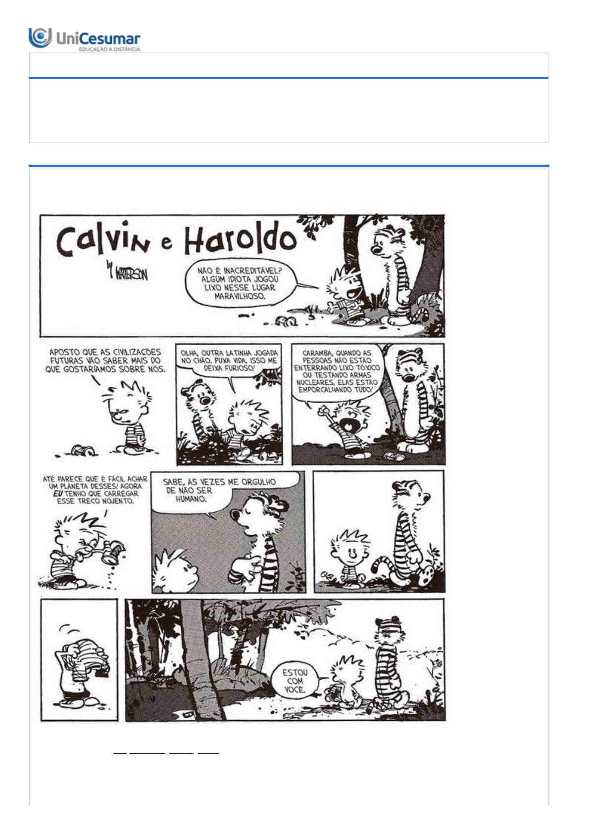 17/06/2019 Unicesumar - Ensino a Distância 1/11 ATIVIDADE - SEMANA DE CONHECIMENTOS GERAIS - 2019B Período:11/06/2019 20:30 a 30/06/2019 23:59 (Horário de Brasília) Status:ABERTO Nota máxima:1,00 Gabarito:Gabarito será liberado no dia 01/07/2019 00:00 (Horário de Brasília) Nota obtida: 1ª QUESTÃO Analise os quadrinhos a seguir, assinados pelo artista Bill Watterson. Disponível em: <https://bit.ly/2JWyK4N > Acesso em: 04 jun. 2019. 17/06/2019 Unicesumar - Ensino a Distância 2/11 A partir da narrativa apresentada na história das personagens Calvin e Haroldo, analise as afirmações que seguem: I. Os quadrinhos abordam uma crítica à poluição ao meio ambiente, sendo lembrada, inclusive, a poluição por radioatividade. II. Calvin ressalta o fato de que o lixo dispensado incorretamente no meio ambiente trará impactos para as próximas gerações. III. A partir da fala de Haroldo, Calvin tira suas roupas em uma atitude simbólica, visando “despir-se” de sua identidade como humano. É correto o que se afirma em: ALTERNATIVAS III, apenas. I e II, apenas. I e III, apenas. II e III, apenas. I, II e III. 2ª QUESTÃO O efeito estufa é, certamente, uma das principais preocupações na atualidade em se tratando dos problemas que afetam o meio ambiente. O gráfico a seguir apresenta a taxa de emissão de gases do efeito estufa pelos países que mais têm contribuído para essa problemática. Gráfico - Os maiores emissores de gases do efeito estufa do mundo 17/06/2019 Unicesumar - Ensino a Distância 3/11 Disponível em:< https://www.bbc.com/portuguese/geral-46424720> Acesso em: 10 jun. 2019. Considerando as informações apresentadas, analise as afirmações a seguir: I. Estados Unidos e China, respectivamente, são os principais responsáveis pela emissão de gases do efeito estufa. II. Somados, os 10 maiores responsáveis pela emissão de gases do efeito estufa correspondem a mais de 60% da taxa de emissão no mundo. III. Mesmo somando-se os dados de Brasil, Rússia Indonésia, México, Japão, Índia, Irã e Canadá, não se ultrapassa a taxa de emissão de gases da China. É correto o que se afirma em: ALTERNATIVAS 17/06/2019 Unicesumar - Ensino a Distância 4/11 I, apenas. II, apenas. I e II, apenas. I e III, apenas. II e III, apenas. 3ª QUESTÃO Em 1961 precisávamos apenas de 63% da Terra para atender as demandas humanas. Em 1975 já necessitávamos de 97% da Terra. Em 1980 exigíamos 100,6%, portanto, precisamos mais de uma Terra. Em 2005 já atingíamos a cifra de 145% da Terra. Quer dizer, precisávamos de quase uma Terra e meia para estar à altura do consumo geral da humanidade. Em 2001 nos aproximamos a 170%, portanto, próximos a dois planetas Terra. A seguir este ritmo, no ano de 2030 precisaremos de pelo menos três planetas Terra iguais a este que temos. Se hipoteticamente quiséssemos universalizar o nível de consumo que os países ricos como os Estados Unidos, a União Europeia e o Japão desfrutam, dizem-nos biólogos e cosmólogos, seriam necessários cinco planetas Terra, o que é absolutamente irracional. BOFF, Leonardo. Sustentabilidade: o que é, o que não é. Petrópolis - RJ: Editora Vozes Ltda, 2017. Assim, com base nesta informação analise as asserções abaixo e a relação proposta entre elas. I. Tendo em vista os dados apresentados, na visão de Leonardo Boff, as políticas de desenvolvimento social não devem ambicionar uma equalização do padrão de consumo dos países mais pobres ao das grandes potências econômicas tal como estas apresentam hoje. PORQUE II. Desde os anos 1980, adentramos em uma crescente extrapolação de uso dos recursos naturais de nosso planeta, assim, é preciso pensar em modelos de desenvolvimento mais sustentáveis para atender as necessidades humanas a fim de não degradarmos mais o meio ambiente. A respeito dessas asserções, assinale a opção correta. ALTERNATIVAS As asserções I e II são proposições verdadeiras, e a II é uma justificativa correta da I. As asserções I e II são proposições verdadeiras, mas a II não é uma justificativa correta da I. A asserção I é uma proposição verdadeira, e a II é uma proposição falsa. A asserção I é uma proposição falsa, e a II é uma proposição verdadeira. As asserções I e II são proposições falsas. 4ª QUESTÃO 17/06/2019 Unicesumar - Ensino a Distância 5/11 Nove em cada dez pessoas respiram ar contaminado no mundo de acordo com o mais recente relatório da OMS, publicado em 2018. A agência da ONU estima que sete milhões de pessoas morram anualmente em decorrência da má qualidade do ar. E no Brasil? O mesmo levantamento fala em 50 mil mortes por ano, mas alguns pesquisadores acreditam que o número pode ser maior. De acordo com pesquisas do médico patologista Paulo Saldiva, professor da Faculdade de Medicina da USP, o morador de São Paulo, por exemplo, perde em média um ano e meio de vida por causa da poluição. Viver na capital paulista seria equivalente a fumar quatro cigarros por dia. As mortes ocorrem principalmente devido à inalação dos gases e à exposição a partículas finas que penetram profundamente nos pulmões e no sistema cardiovascular, podendo causar acidentes vasculares cerebrais, doenças cardíacas, câncer de pulmão, doenças pulmonares obstrutivas crônicas e infecções respiratórias, incluindo pneumonia. No final de maio, a greve dos caminhoneiros ajudou a ilustrar como a qualidade do ar é afetada pelos transportes. De acordo com Saldiva, houve uma redução de 50% na poluição do ar em São Paulo durante o sétimo dia de paralisação. “Esse é um episódio raro e vamos estudar suas consequências na saúde pública. Quem sabe essas evidências quantitativas sirvam de argumento para a criação de políticas públicas”, disse. FELIN, Bruno. Qual o impacto da poluição do ar na saúde?. Disponível em: <https://wribrasil.org.br/pt/blog/2018/07/qual-o-impacto-da-poluicao-do-ar-na-saude> Acesso em: 