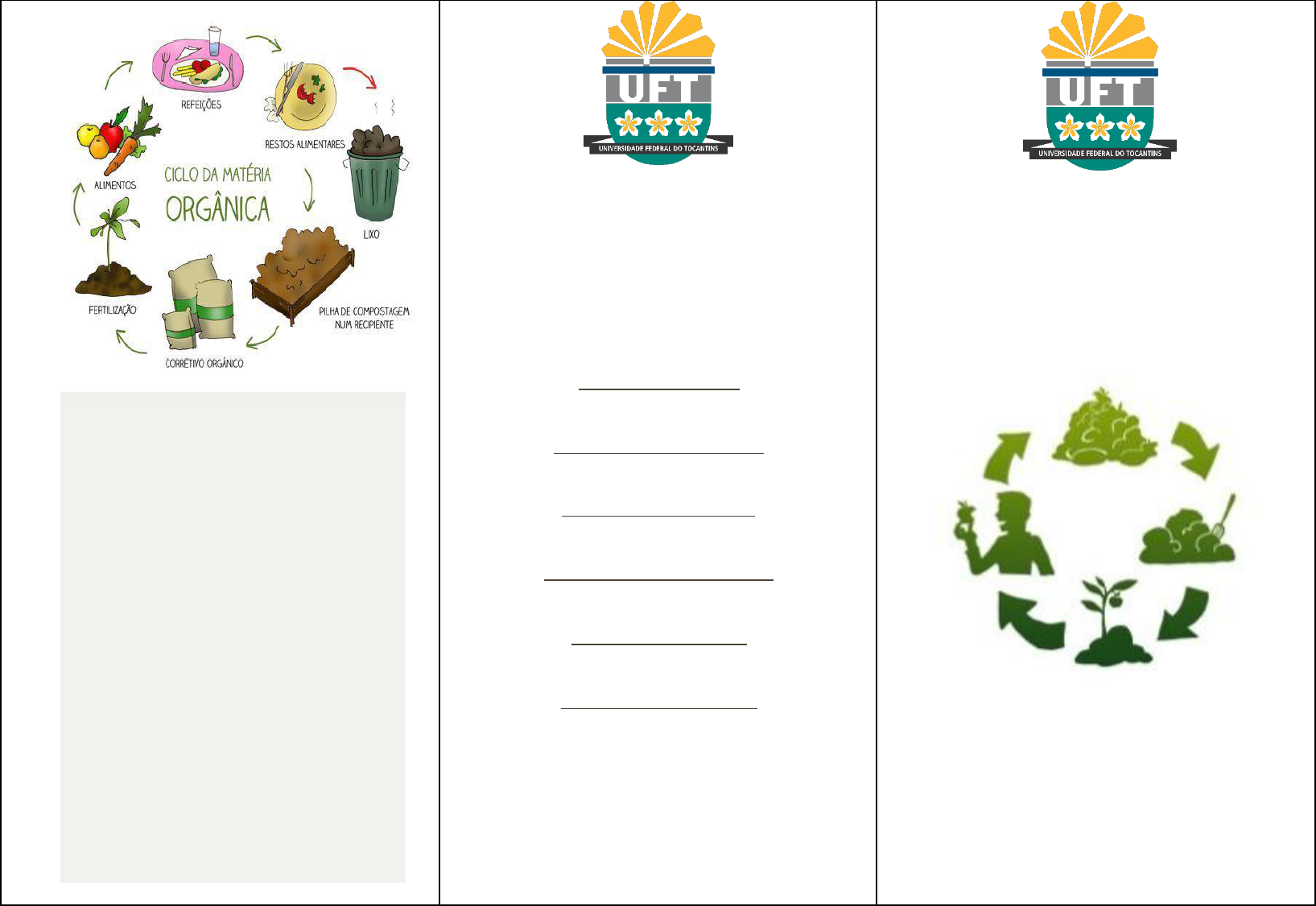 Você Sabia? O Brasil produz 24,84 toneladas de isopor das quais 76% são depositados a céu aberto em lixões e 8% são depositados em aterros controlados. Do total do lixo urbano, 60% são formados por resíduos agrários. Todo esse material quando é jogado em locais inapropriados além de contaminar o lençol freático, produz metano durante sua fermentação. Somos universitários com o propósito de divulgar a importância desse assunto aos trabalhadores rurais que possam se beneficiar com a realização do mesmo. Aelton Camargo de Oliveira Filho aelton_tr@hotmail.com Igor Morais dos Reis igormoraisdosreis@gmail.com João Pedro Junqueira joaopedro_jpj@hotmail.com Murillo Fernandes Moreira murillo_moreira30@hotmail.com Steffany de Oliveira Passos steffany.17@outlook.com Vitor Barros Santiago Lellis vitor.projecto08@gmail.com Coordenadora Dra. Lilian França Borges Chagas Compostagem Doméstica Mas o que é compostagem? Nada mais é do que a decomposição da matéria orgânica realizada por microrganismos como fungos e bactérias. Esse processo é fundamental na reciclagem dos elementos que constituem a matéria orgânica possibilitando que sejam novamente absorvidos pelas plantas na forma de nutrientes. Nas condições ideais e na presença de oxigênio, a compostagem não libera o gás metano. O resultado é um composto de alta qualidade que pode ser colocado em vasos, hortas, jardins, mudas, árvores, entre outros. Fonte: Ciclo Vivo Como fazer em casa? Você pode fazer compostagem em pilhas sobre o solo em locais protegidos do sol e da chuva ou em baldes com furos laterais. Fonte: Agricultura Sustentável Fonte: Altoga Green “O tempo de decomposição pode variar de acordo com o tipo de material orgânico utilizado, porém a média é de 2 a 3 meses. “ O segredo é alternar matéria seca e úmida para dar o aspecto ideal à composteira, ou seja, não fique nem muito seca e nem muito úmida. Quais materiais posso usar na compostagem? Restos de legumes, verduras, frutas, borra de café e cascas de ovos são os mais utilizados. Não devem ser colocados na composteira materiais tratados com quaisquer produtos químicos, vidro, metal, óleo, tinta, plásticos, fezes, entre outros. Deve-se evitar também gorduras animais, pois são de difícil decomposição, como também restos de carne por atrair animais domésticos.