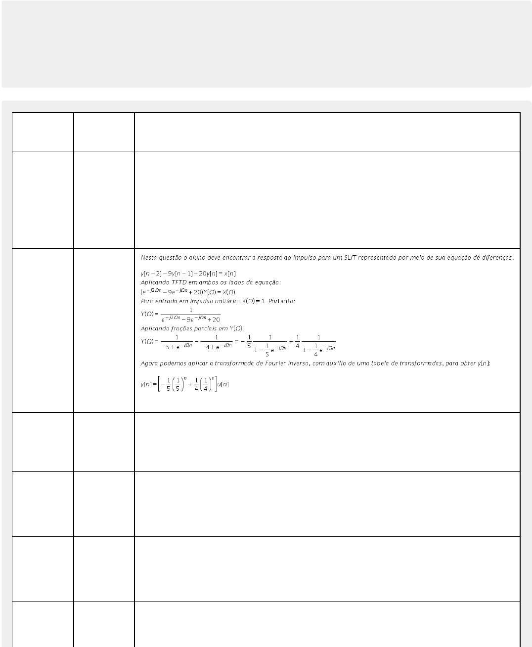 Disciplina: Análise e Processamento de Sinais Modelo de Prova: INTERATIVAS Tipo de Prova: B2 Versão da Prova: 1 Código da Prova: 103016 Questão Respostacorreta Gabarito Comentado 1 E Nesta questão, aborda-se o teorema da amostragem de Nyquist. Para o sinal x(t) apresentado, temos: ωmax = 10 rad/s O teorema da amostragem de Nyquist fornece: ωs > 2ωmax Logo: ωs>20 rad/s 2 E 3 B O conversor em questão possui 8 bits, portanto: 2N níveis de quantização 2N = 28 = 256 níveis de quantização 4 A A única sentença verdadeira é a I, nas sentenças II e III as afirmativas são falsas> Um sistema inversível faz a recuperação e não a degradação como afirmado. A afirmativa III é válida somente para sistemas COM memória e não SEM como dito. 5 C Nesta questão o aluno deve apresentar conhecimento a respeito da FFT. A asserção I é verdadeira. A asserção II é falsa, pois a FFT não calcula a TZ para chegar na DFT, mas sim um algoritmo butterfly. Nesta questão o aluno deve aplicar transformada de Fourier de tempo discreto a um sinal x[n] apresentado: 6 B 7 C Nesta questão o aluno deve estar familiarizado com a representação de Fourier adequada a cada tipo de sinal: - Para sinais periódicos de tempo contínuo: Série de Fourier de tempo contínuo; - Para sinais não periódicos de tempo contínuo: Transformada de Fourier de tempo contínuo. O sinal apresentado no gráfico é de tempo contínuo e periódico (período de 1 segundo). Portanto, para realizar análises de Fourier neste sinal, utiliza-se a Série de Fourier de tempo contínuo. Alternativa Correta. 8 C Equipamentos modernos utilizam técnicas de processamento de sinais mais eficientes, através de componentes analógicos (digitais). Equipamentos modernos utilizam técnicas de processamento de sinais que dispensam (amostragem é o primeiro passo após a aquisição do sinal) a amostragem digital, para conferir maior eficiência aos processos. Equipamentos modernos utilizam técnicas de processamento de sinais que iniciam com a amostragem digital, que converte um sinal de tempo contínuo em uma sequência de tempo discreto. (Alternativa correta) Equipamentos modernos utilizam técnicas de processamento de sinais que iniciam com a amostragem digital, que converte um sinal de tempo discreto em um sinal de tempo contínuo (converte um sinal de tempo contínuo em um sinal de tempo discreto). Equipamentos modernos utilizam técnicas de processamento de sinais que iniciam com a amostragem digital, que converte um sinal de tempo discreto (contínuo) em uma sequência de tempo discreto. Nesta questão espera-se que o aluno seja familiar com o sinal básico 9 D impulso unitário, e consiga realizar um deslocamento no tempo para o mesmo. A partir deste deslocamento, é necessário que se faça um produto com um sinal senoidal y[n], para obter z[n]. Esta operação é facilitada notando que o produto de um sinal qualquer por um sinal impulso (deslocado ou não) será igual a zero para todos os valores, exceto para o valor unitário da função impulso. Em x[n], o impulso deslocado terá amplitude igual a 1 para n=3, e zero para n≠3. (Portanto afirmativa I está correta). O sinal y[n] é um sinal cosseno, portanto suas amplitudes variam de -1 a 1. (Portanto afirmativa II está incorreta). O sinal z[n], obtido multiplicando-se x[n] e y[n] termo a termo, será igual a zero para todo n≠3, devido à característica analisada anteriormente sobre x[n]. Em n=3, temos: (Portanto a afirmativa III está incorreta). Alternativa correta, pela argumentação apresentada acima. 10 D O nível de sofisticação envolve técnicas de taxa múltipla, usando mais de uma taxa de amostragem no mesmo sistema. Funciona assim para o exemplo do gravador de voz digital. Primeiro, passe o sinal de voz através de um filtro passa-baixa RC simples e experimente os dados a 64 kHz. Os dados digitais resultantes contém a faixa de voz desejada entre 100 e 3000 hertz, mas também possui uma banda inutilizável entre 3 kHz e 32 kHz. Em segundo lugar, remova essas frequências inutilizáveis no software, usando um filtro passa-baixa digital a 3 kHz. Em terceiro lugar, reescreva o sinal digital de 64 kHz a 8 kHz simplesmente descartando cada sete de oito amostras, um procedimento chamado de dizimação. Os dados digitais resultantes são equivalentes aos produzidos por filtragem analógica agressiva e amostragem direta de 8 kHz.