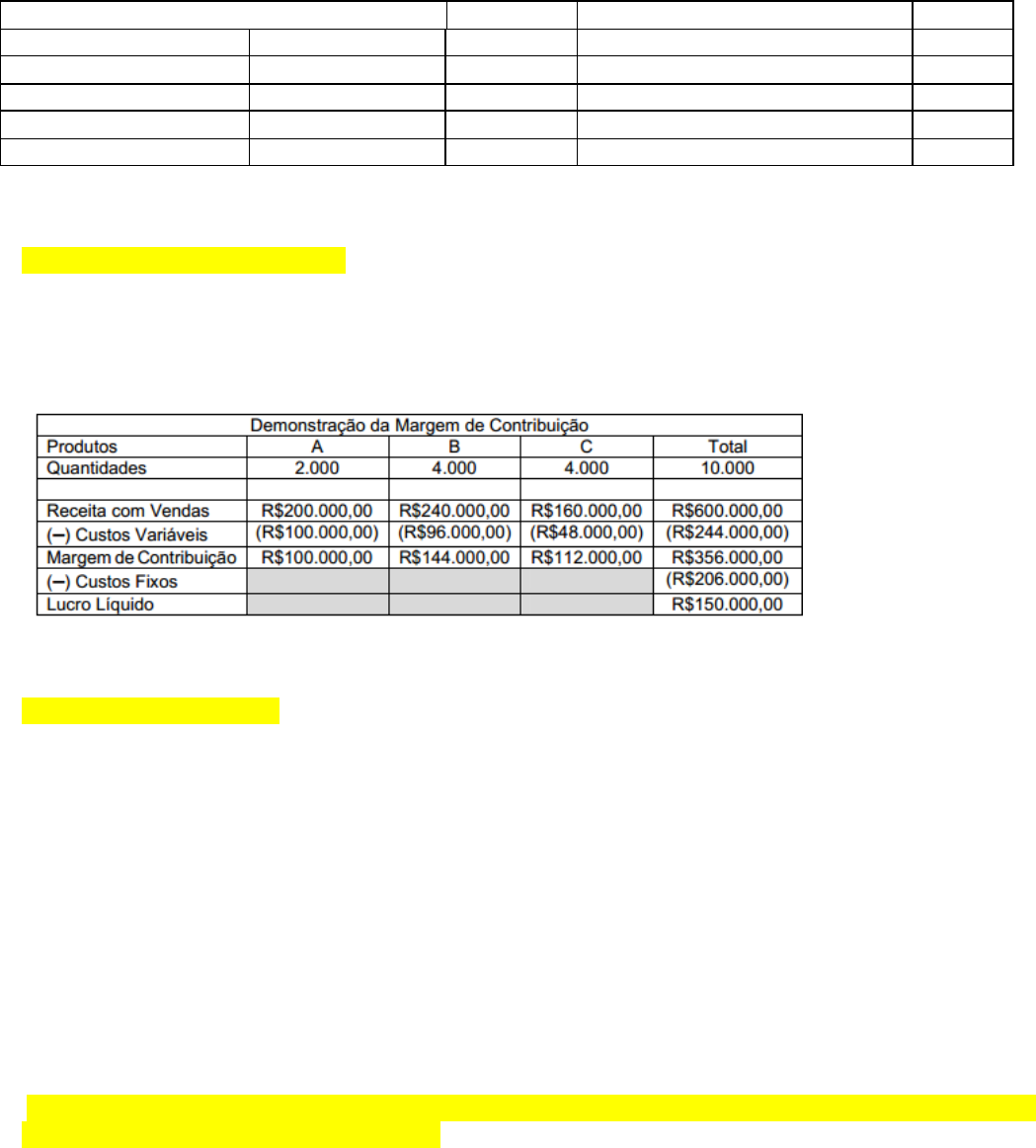 Faculdade de Ciências Econômicas Departamento de Ciências Contábeis e Atuariais Profª Ângela Rozane Leal de Souza QUESTÕES DOS EXAMES DE SUFICIÊNCIAS Bacharel em Ciências Contábeis Nome: Fabricio Natanael Martha Uma empresa apresenta duas propostas de orçamento para o segundo semestre de 2012. (Questão 23 – 2ª) Orçamento 1 % Orçamento 2 % Vendas R$8.550.000,00 100 R$14.400.000,00 100 Custos Variáveis R$5.130.000,00 60 R$5.760.000,00 40 Margem Contribuição R$3.420.000,00 40 R$8.640.000,00 60 Custos Fixos R$1.795.500,00 21 R$4.752.000,00 33 Lucro Líquido R$1.624.500,00 19 R$3.888.000,00 27 Os pontos de equilíbrio contábil dos Orçamentos 1 e 2, em valores monetários, são, respectivamente: a) R$9.450.000,00 e R$17.600.000,00. b) R$7.735.714,29 e R$11.781.818,18. c) R$4.488.750,00 e R$7.920.000,00. d) R$4.061.250,00 e R$6.480.000,00. Uma empresa produz e vende três modelos diferentes de produtos, conforme apresentado abaixo. (questão 25 - ano 2014) A Média Ponderada da Margem de Contribuição unitária e o Ponto de Equilíbrio Contábil em unidades, desconsiderando as casas decimais no resultado final são respectivamente: a) R$20,60 e 10.000 unidades. b) R$35,60 e 5.786 unidades. c) R$45,00 e 12.640 unidades. d) R$60,00 e 3.433 unidades. 3.1 ) Uma indústria apresenta os seguintes dados: (Questão 13 – 1ª prova exame suficiência 2011) Aluguel de setor administrativo R$ 80.000,00 Aluguel do setor de produção R$ 56.000,00 Depreciação da área de produção R$ 38.000,00 Mão de Obra Direta de produção R$ 100.000,00 Mão de Obra Direta de vendas R$ 26.000,00 Material requisitado: diretos R$ 82.000,00 Material requisitado: indiretos R$ 70.000,00 Salários da diretoria de vendas R$ 34.000,00 Seguro da área de produção R$ 38.000,00 Analisando-se os dados acima, assinale a opção CORRETA. a) O custo de transformação da indústria totalizou R$ 302.000,00, pois o custo de transformação é a soma da mão de obra direta e custos Indiretos de fabricação. b) O custo do período da indústria totalizou R$ 444.000,00, pois o custo da empresa é a soma de todos os itens de sua atividade. c) O custo do período da indústria totalizou R$ 524.000,00, pois o custo da empresa é a soma de todos os itens apresentados. d) O custo primário da indústria totalizou R$ 208.000,00, pois o custo primário leva em consideração a soma da mão de obra e do material direto. 3.2 ) No mês de setembro de 2010, foi iniciada a produção de 1.500 unidades de um determinado produto. Ao final do mês, 1.200 unidades estavam totalmente concluídas e restaram 300 unidades em processo. O percentual de conclusão das unidades em processo é de 65%. O custo total de produção do período foi de R $558.000,00. O Custo de Produção dos Produtos Acabados e o Custo de Produção dos Produtos em Processo são respectivamente: (Questão 14 - – 1ª prova exame suficiência 2011) a) R$ 446.400,00 e R$111.600,00. b) R$ 480.000,00 e R$78.000,00. c) R$ 558.000,00 e R$ 0,00. d) R$ 558.000,00 e R$ 64.194,00. Uma determinada empresa apresentou os seguintes dados referentes ao ano de 2010: (Questão 17– 1ª prova exame suficiência 2011) - Estoque inicial igual a zero. - Produção anual de 500 unidades com venda de 400 unidades. - Custo Variável unitário de R$ 15,00. - Preço de Venda unitário de R$ 20,00. - Custo Fixo anual de R$ 2.000,00. - Despesas Fixas anuais de R$ 350,00. - Despesa Variável unitária de R$ 1,50 para cada unidade vendida. Sabendo-se que a empresa utiliza o Custeio por Absorção, seu Lucro Bruto e o Resultado Líquido em 2010, são, respectivamente: a) Lucro Bruto de R$ 2.000,00 e Lucro Líquido de R$ 1.050,00. b) Lucro Bruto de R$ 2.000,00 e Prejuízo de R$ 950,00. c) Lucro Bruto de R$ 400,00 e Lucro Líquido de R$ 50,00. d) Lucro Bruto de R$ 400,00 e Prejuízo de R$ 550,00. Uma determinada empresa, no mês de agosto de 2010, apresentou custos com materiais diretos no valor de R$30,00 por unidade e custos com mão de obra direta no valor de R$28,00 por unidade. Os custos fixos totais do período foram de R$160.000,00. Sabendo-se que a empresa produziu no mês 10.000 unidades totalmente acabadas, o custo unitário de produção pelo Método do Custeio por Absorção e Custeio Variável é, respectivamente: (Questão 18) a) R$ 46,00 e R$ 44,00. b) R$ 58,00 e R$ 46,00. c) R$ 74,00 e R$ 58,00. d) R$ 74,00 e R$ 74,00. ) Uma empresa industrial aplicou no processo produtivo, no mês de agosto de 2010, R$50.000,00 de matéria-prima, R$40.000,00 de mão de obra direta e R$30.000,00 de gastos gerais de fabricação. O saldo dos Estoques de Produtos em Elaboração, em 31.7.2010, era no valor de R$15.000,00 e, em 31.8.2010, de R$20.000,00. O Custo dos Produtos Vendidos, no mês de agosto, foi de R$80.000,00 e não havia Estoque de Produtos Acabados em 31.7.2010. Com base nas informações, assinale a opção que apresenta o saldo final, em 31.8.2010, dos Estoques de Produtos Acabados: (Questão 19 – 1ª prova exame suficiência 2011) a) R$ 35.000,00. b) R$ 55.000,00. c) R$ 120.000,00. d) R$ 135.000,00. ) Uma empresa de treinamento está planejando um curso de especialização. Os custos previstos são: Custos Variáveis de R$1.200,00 por aluno e Custos Fixos de R$72.000,00, dos quais R$4.800,00 referem-se à depreciação de equipamentos a serem utilizados. O curso será vendido a R$6.000,00 por aluno. O Ponto de Equilíbrio Contábil se dá com: (Questão 23– 1ª prova exame suficiência 2011) a) 10 alunos. b) 12 alunos. c) 14 alunos. d) 15 alunos. ) Uma fábrica de camisetas produz e vende, mensalmente, 3.500 camisetas ao preço de R$5,00 cada. As despesas variáveis representam 20% do preço de venda e os custos variáveis são de R$1,20 por unidade. A fábrica tem capacidade para produzir 5.000 camisetas por mês, sem alterações no custo fixo atual de R$6.000,00. Uma pesquisa de mercado revelou que ao preço de R$4,00 a unidade, haveria demanda no mercado para 6.00