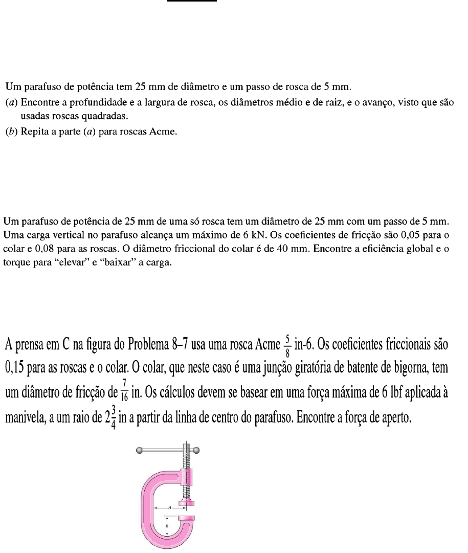 Lista de exercícios em duplas – Entregar no dia da Avaliação Assunto: PARAFUSOS Exercício 1 Resp.: a) profundidade e largura – 2,5mm; dm = 22,5 mm; dr = 20 mm; l = p = 5mm; b) iguais. Exercício 2 Resp.: TR= 16,23 N.m; TL = 6,622 N.m; e = 0,294 Exercício 3 Resp.: F = 170 lfb Exercício 4 Resp.: a) 1,25 in; b) 1,109 in; c) 0,4375 in; d) 1,5465 in….1,75 in; e) ld = 0,5 in lt = 0,609 in. Exercício 5 Resp.: a) 34 mm; b) 31,5 mm; c) 12,8 mm; d) 44,3 mm….50 mm; e) ld = 16 mm lt = 15,5 mm. Exercício 6 Resp.: 1,11 ; 1,08 Exercício 7 Resp.: a) 476 N.m; b) Fb = 136,9 kN Fm = 116,9 kN Exercício 8 Duas placas, uma de aço e a outra de ferro fundido, estão engastadas por parafuso de porca ½ in – 20 UNF x 1 ½ in SAE grau 5 com ½ in N de diâmetro de arruela frontal. a) Determine Km para as placas de aço e ferro fundido; b) Determine Km considerando duas placas de aço; c) Usando a Eq. 8-23, determine Km para duas placas de aço e compare com o resultado da letra (b); d) Determine Kb. Resp.: a) K1 = 30,80 . 106 lbf/in; K2 = 285,5 . 106 lbf/in; K3 = 14,15 . 106 lbf/in; Km = 9,378 . 106 lbf/in b) Km = 14,64 . 106 lbf/in c) Km = 14,92 . 106 lbf/in d) Kb = 3,69 . 106 lbf/in Exercício 9 Resp.: n = 4,73 Exercício 10 Quando o problema se refere ao problema 8-22, entenda-se que é o problema 9. Resp.: n = 5,84 Exercício 11 Na figura para o problema 8-20, os parafusos de porca tem um diâmetro de ½ in e a placa de cobertura é de aço, com D = ½ in. O cilindro é de aço fundido, com espessura de 5/8 in e um módulo de elasticidade de 18 Mpsi. A arruela de ½ in da SAE a ser usada sob a porca tem um diâmetro externo de 1,062 in e 0,095 in de espessura. Encontre as rigidezes do parafuso de porca e dos membros, bem como a constante de junção C. Resp.: Kb = 3,936 Mlbf/in; Km = 10,79 Mlbf/in; C = 0,267 Exercício 12 9 Resp.:Fl = 4 kN; M = 2.400 N.m; Fll A = FllB = 37,5 kN; Fo = 4 kN; τ = 334 MPa; σ = -393 MPa; I = 1,48.106 mm4; σ = 110 MPa