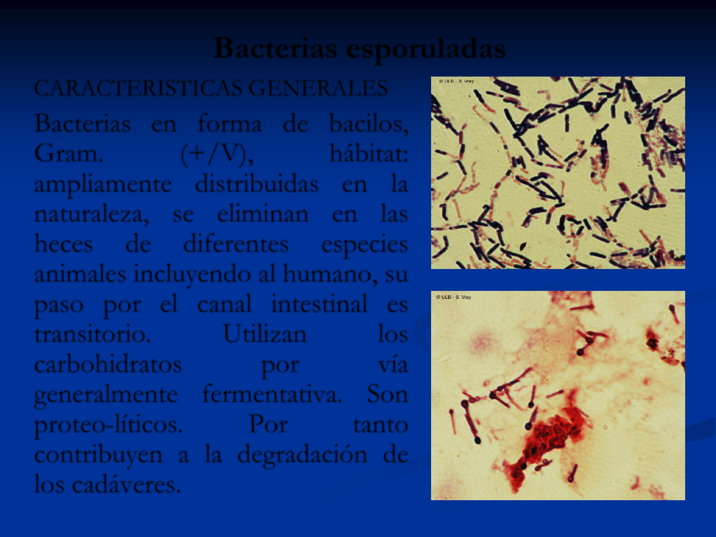 * Bacterias esporuladas CARACTERISTICAS GENERALES Bacterias en forma de bacilos, Gram. (+/V), hábitat: ampliamente distribuidas en la naturaleza, se eliminan en las heces de diferentes especies animales incluyendo al humano, su paso por el canal intestinal es transitorio. Utilizan los carbohidratos por vía generalmente fermentativa. Son proteo-líticos. Por tanto contribuyen a la degradación de los cadáveres. * ESPORAS * GENERO CLOSTRIDIUM Bacterias en forma de bastón Gram. +, motilidad +, catalasa negativa, esporulada, algunas especies toxigenicas, anaerobias estrictas, microaerofilicas. * PATOGENICIDAD DE CLOSTRIDIUM * PATOGENICIDAD DE CLOSTRIDIUM * * * * * Tipo Alfa Beta Epsilon Iota Toxinas * Clostridium perfringes * LIPASA NEGATIVA POSITIVA * LECITINASA * * LECHE TORNASOL * PRODUCCION DE ACIDO SULFHIDRICO POSITIVA NEGATIVA * GENERO BACILLUS Bacterias en forma de bacilo Gram. +/V, catalasa +, motilidad +, aerobias, algunas crecen en total anaerobiosis esporuladas, toxigenicas, colonias tipo rizoide. hemolíticas beta. * COLONIA DE BACILLUS MICOIDES * Bacillus megaterium * Bacillus subtilis * PATOGENICIDAD DE BACILLUS * ANTRAX CUTANEO Postula maligna