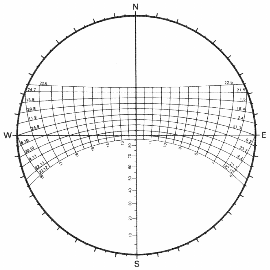 CARTA SOLAR (PROJEÇÃO ESTEREOGRÁFICA) PARA LATITUDE DE 20O SUL (BELO HORIZONTE) Representa a trajetória aparente do sol durante o ano sobre o plano do horizonte do observador, para a latitude considerada. Para outras latitudes, ver Frota e Schiffer (2001). Carta solar de Belo Horizonte Extraído de: FROTA, A. B.; SCHIFFER, S. Manual de Conforto Térmico. 5ª Ed., São Paulo: Nobel, 2001. DIAGRAMA DE RADIAÇÃO SOLAR INCIDENTE PARA CONDIÇÕES DE NEBULOSIDADE MÉDIA = 5 DÉCIMOS Estima as condições de radiação solar incidente sobre as superfícies horizontais, perpendiculares à direção da radiação incidente e sobre as superfícies verticais em condições de céu parcialmente encoberto. Deve ser usado sobreposto à carta solar e, no caso das superfícies verticais, convenientemente orientado. Diagrama de radiação solar incidente para nebulosidade média de 5 décimos. Extraído de: KOENIGSBERGER, O. et al. Viviendas y Edificios en Zonas Calidas y Tropicales. Madrid: Paraninfo, 1977. TRANSFERIDOR AUXILIAR PARA O TRAÇADO DE MÁSCARAS DE OBSTRUÇÃO DA ABÓBADA CELESTE Indica, segundo Frota e Schiffer (1995), as projeções estereográficas sobre o plano do horizonte, para um observador situado em uma superfície vertical, dos planos definidos pelos ângulos (determinação das retas horizontais paralelas ao plano de horizonte do observador), (determinação das retas verticais perpendiculares ao plano de horizonte do observador) e (determinação das retas horizontais perpendiculares à superfície vertical). Transferidor auxiliar de ângulos Adaptado de: CHICHIERCHIO, L. C. Manual Técnico de Iluminação Zenital. São Paulo: COLORPLAST, s/ data.