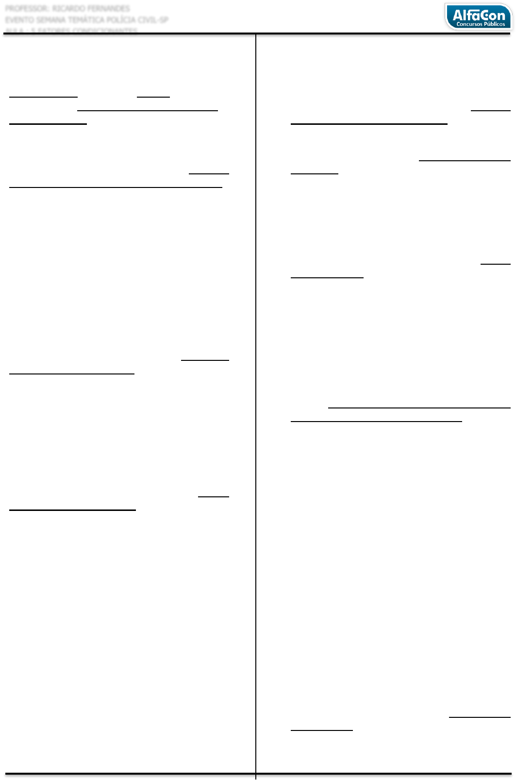 PROFESSOR: RICARDO FERNANDES EVENTO SEMANA TEMÁTICA POLÍCIA CIVIL-SP AULA : 5 FATORES CONDICIONANTES “FORÇA, MULTIFOCO E FÉ” 1 CRIMINOLOGIA FATORES CONDICIONANTES DO CRIME ETIOLOGIA CRIMINAL: é a ciência que estuda a criminogênese, que são as causas do crime, ou seja, os fatores condicionantes ou impulsionadores do crime. Segundo Pablo de Molina a moderna criminologia para explicar o comportamento criminal se utiliza de 3 grandes grupos de modelos teóricos: modelos de cunho biológico, psicológico e sociológico. FATORES CONDICIONANTES BIOLÓGICOS: (TEORIAS BIANTROPOLÓGICAS) Estudo denomina-se: BIOCRIMINOGÊNESE (teorias bioantropológicas). Explicação para o comportamento criminal, se dá através de variáveis congênitas (relativas a estrutura orgânica do indivíduo). Fatores como sexo, idade, raça, ritmo cerebral, genética, são conhecidos também como orientações biológicas ou FATORES SOMÁTICOS. FATORES CONDICIONANTES PSICOLÓGICOS (PSICOLOGIA FORENSE) No campo da medicina legal envolvem dois grandes ramos: a psicologia criminal (ou psicologia forense) e a psiquiatria criminal (ou psicopatologia forense). A preocupação com a natureza humana e o desvio de comportamento normal, causou os estudos psicológicos e tem por objetivo estudos da personalidade “normal” e os fatores que podem influenciar seja de índole biológica ou mesológica. No desenvolvimento da personalidade inclui fatores ambientais que determinam o comportamento criminoso, por imitação ou por influências dos modelos no contexto em que se desenvolve a personalidade. PSICANÁLISE: fundada no início do século XX, por SIGMUND FREUD (1856 - 1939), propôs que a nossa mente é dividida em consciente e inconsciente. INCONSCIENTE: são os instintos “reprimido”, acessível através de sonhos, lapsos, e gera sua importância porque é o lugar onde vão todas as coisas inúteis, traumáticas ou prejudiciais. A descoberta abriu um mundo de exploração para criminologia, que qualquer delito tem um inconsciente, uma motivação profunda. ID: núcleo original do aparelho psíquico, ficam os instintos, as paixões, impulsos, componente completamente inconsciente regido pelo prazer. SUPEREGO: formado por normas morais da sociedade, governado pelo princípio de que deve ser. A parte que age contra o ID, representa os pensamentos morais éticos e civilizados. EGO: regido pelo princípio da realidade, determinam a adaptação do indivíduo ao meio social. Equilíbrio entre o id e o superego ao mundo externo. Localiza-se na zona consciente. O ego toma a decisão. Freud reconhece dois instintos principais na dinâmica da personalidade: o de VIDA (EROS), principal basicamente sexual e a oposta a este é o de MORTE (THANATOS), dois aspectos que são combinados na dinâmica da personalidade onde se movemos a procura da vida ou da morte, a ideia de instintos foi essencial para criminologia, o que leva o ser humano a destruir, matar e cometer crimes. Freud explica que um ato criminoso foi cometido por um princípio de prazer. FATORES CONDICIONANTES PSICOPATOLÓGICOS (PSIQUIÁTRICOS) Estudos dos transtornos anormais de personalidade, doenças mentais, retardos, demências, esquizofrenia e transtornos psiquiátricos. Psicopatologias: estudo do comportamento disfuncional na personalidade, processos psicológicos anormais, estudos dos distúrbios de personalidade, que degeneram em crimes. FATORES CONDICIONANTES SOCIOLÓGICOS (SOCIAIS/ MESOLÓGICOS/ ENTORNO FÍSICO/ EXTERNOS/ AMBIENTAIS) A vertente sociológica da criminalidade alcança níveis de influência altíssimos na gênese delitiva. Segundo Nestor Sampaio (2012), entre fatores mesológicos (meios, externos, sociais, exógenos) destaca-se; infância abandonada, pobreza, emprego, desemprego, subemprego, má PROFESSOR: RICARDO FERNANDES EVENTO SEMANA TEMÁTICA POLÍCIA CIVIL-SP AULA : 5 FATORES CONDICIONANTES “FORÇA, MULTIFOCO E FÉ” 2 CRIMINOLOGIA distribuição de renda, desordem social, latifúndios improdutivos, meios de comunicação, condições desfavoráveis de moradia, como proliferações de favelas propiciando a promiscuidade e outros crimes, migração, crescimento populacional desorganizado, preconceito, mal vivência, guerras, industrialização e formas de governo. FATORES CONDICIONANTES BIOLÓGICOS PALARA CHAVE: NEGABAS Neurofisiologia Moderna (Neurociência- doenças do cérebro-neurológicas; eletroencefalograma, exame que registra o ritmo cerebral/atividade elétrica, permitindo uma série de investigações científicas). Endocrinologia (relação do comportamento delitivo com determinadas disfunções hormonais). Hipertireoidismo: glândula tireoide produz hormônio em excesso, provocando alterações comportamentais. Hipotireoidismo: baixa produção de hormônio. Genética Criminal (estudos sobre hereditariedade, relação do delito com genealogias criminais, malformações cromossômicas e comportamento criminal). Busca identificar a relação de certas anomalias genéticas e propensão ao crime. Estudos de famílias criminais. Estudo de gêmeos em 1929 e pré-disposição ao crime. Malformações cromossômicas: O ser humano possui em sua composição biológica 46 cromossomos que carregam as informações genéticas e fenótipas (características como cabelo, pele, altura e sexo), sendo 23 pares tiveram origem materna e os outros 23 pares origem paterna, totalizando 46 cromossomos recebidos, onde 44 são autossomos (encontrados em todas células somáticas e dois são cromossomos sexuais, sendo (X) o cromossomo feminino e o Y (cromossomo masculino). A herança ligada ao sexo as mulheres apresentam (XX) e os homens (XY), qualquer tipo de alteração nos cromossomos origina a mutação. Ex: síndrome de Down, causada pela presença de um cromossomo extra no par 21. Conhecida como trissomia 21. Estudos de diversos pesquisadores relacionaram criminalidade com determinadas má formações cromossômicas. Síndrome de Turner; oco