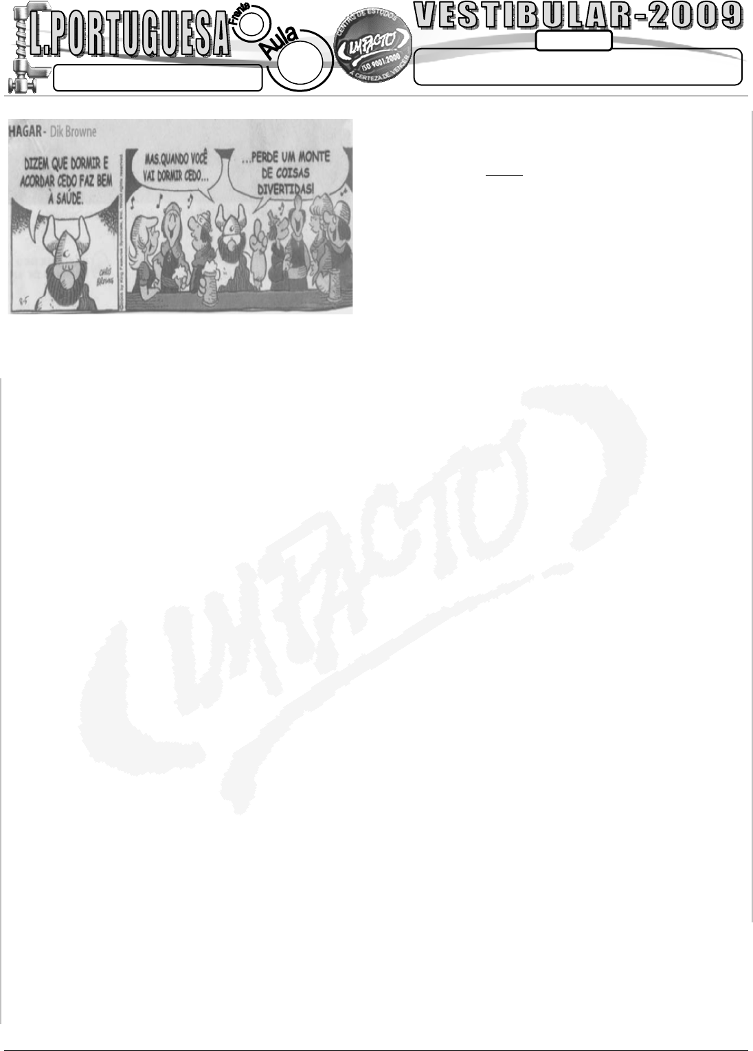 KL 040308 CONTEÚDO DO TEXTO 2 FAÇO IMPACTO - A CERTEZA DE VENCER!!! PROFº: ÉRICA Fa le c on os co w w w .p or ta lim pa ct o. co m .b r VE ST IB UL AR – 2 00 9 CONTEÚDO A Certeza de Vencer 04 2 Texto I 01. A forma verbal “dizem” no primeiro quadrinho indica a: a) certeza do enunciador em relação ao que enuncia. b) intenção do enunciador de não se comprometer com o que enuncia. c) indiferença do enunciador em relação ao que enuncia. d) inexistência de um autor para o que é enunciado. e) não-certeza do enunciador em relação ao enunciado. Texto II O grande amor Tom Jobim e Vinícius de Moraes Haja o que houver Há sempre um homem para uma mulher E há de sempre haver Para esquecer um falso amor E uma vontade de morrer Seja como for Há de vencer o grande amor Que há de ser no coração Como um perdão para quem chorou. 02. Sobre o texto acima, é correto afirmar que: a) possui interdependência entre elementos argumentativos e descritivos, os quais são transformados em poesia. b) narra, poeticamente, a história de um personagem que conseguiu esquecer um falso amor quando encontrou um grande amor. c) apresenta um narrador que expõe seu ponto de vista sobre o relacionamento amoroso, usando o procedimento de auto-referência. d) expressa a idéia, por meio de elementos discursivos, arranjados numa linguagem poética-argumentativa, de que o verdadeiro amor sempre vence. e) refere-se a um grande amor perdido e que não a menor chance de recuperação Texto III Elas vivem pedindo para que os outros repitam o que falaram e podem até passar a impressão de que seu sistema auditivo não funciona bem. Freqüentemente chamadas de desligadas, pessoas com esse tipo de comportamento podem sofrer de um problema que, nos meios científicos, é chamado de déficit de processamento auditivo e de atenção. “As pessoas simplesmente não sabem mais ouvir com atenção, e isso dificulta o processamento e o armazenamento das informações”, afirma uma especialista. Testes recentes mostraram que a capacidade de memorização auditiva pode começar a falhar cedo, mesmo em indivíduos que ouvem bem. De acordo com a pesquisadora, o problema atinge pessoas cada vez mais jovens, principalmente por causa do estilo de vida atual. “Basta observar os programas de TV voltados para o público jovem. A maioria tenta mostrar tudo ao mesmo tempo, deixando o espectador aturdido com o excesso de informações, sem conseguir fixar a atenção em nada.” Adaptado de folha equilíbrio sobre a educação dos jovens. 03. Assinale a alternativa que apresenta título adequado para o texto III, por expressar corretamente o que a notícia informa. a) Sistema auditivo: problemas do mau funcionamento b) Desligados, na verdade, ouvem “mal” c) Hereditariedade e problemas auditivos d) Nova conquista da ciência e) Surdez: questão de inteligência FAÇO IMPACTO – A CERTEZA DE VENCER!!! Fa le c on os co w w w .p or ta lim pa ct o. co m .b r VE ST IB UL AR – 20 09 04. Os programas de TV foram citados no texto III a) porque, com grande audiência, influenciam cada vez mais os jovens. b) para comprovar que os jovens são, cada vez mais, alvo de interesse da mídia. c) como exemplo do que provoca baixo nível de memória auditiva. d) como alerta contra o efeito negativo desse meio sobre a educação dos jovens. e) como meio, atual, de treinar a memória pela exposição a muitos dados informativos. 05. Assinale a alternativa correta sobre o texto III. a) Elas (no começo do texto) antecipa o que será referido como pessoas com esse tipo de comportamento. b) vivem pedindo para que os outros repitam o que falaram significa: solicitam, algumas vezes, que os outros reforcem o que afirmavam. c) mesmo em indivíduos que ouvem bem tem o mesmo sentido de: a não ser que os indivíduos ouçam bem. d) Em o problema atinge pessoas, o pronome que corresponde corretamente ao termo destacado é: Ihes. e) Está corretamente grafado, como excesso, o vocábulo excessão. Texto IV 06. O pressuposto instaurado pela fala de Tranta: a) O médico foi antiético; b) Luke nunca foi a um ginecologista; c) Luke e Tranta não vão ao mesmo ginecologista; d) Tranta assim com Luke estão apaixonadas pelo ginecologista; e) Tranta nunca havia ido a um ginecologista; Texto V 07. Leia a alternativas abaixo: I - O cartum recorre ao uso de figuras geométricas, assim denominadas (da sua esquerda para direita): círculo – quadrado – triângulo. II - A expressão “bom humor” (anúncio publicitário) está para “mau humor” assim como “faz bem” está para “faz mau”. III - Em “o nosso dia-a-dia” a expressão em destaque desempenha o mesmo papel morfossintático e semântico que em: “Dia a dia a situação do senador se complicava com o surgimento de novas provas.” IV - O humor do cartum decorre da incapacidade da personagem em se decidir por uma das cestas, apesar do formato do objeto (bola) que traz nas mãos. V - O anúncio da Companhia Athletica se vale do cartum para mostrar a academia como um lugar em que o bom humor também é oferecido. 09 - Assinale a alternativa correta em relação ao que se afirma do texto. a) I, II, III, IV, V d) III, IV e V b) I, IV e V e) I, III, e IV c) II, III e V 08. Leia a alternativas abaixo: I - Em todas as suas ocorrências no anúncio da academia, a palavra “gente” pode ser substituída, sem alterar o sentido, pelo pronome nós (1ª. pessoa do plural). II - A figura do burro, que remete ao tema da falta de inteligência, reforça o humor veiculado no cartum. III - Tanto no cartum quanto no texto publicitário, critica-se o culto ao corpo tão difundido e valorizado na sociedade atual. IV - No anúncio, ocorrem três impropriedades gramaticais: o uso de “pra” em lugar de “para”, a repetição de termos em “gente cuidando de gente” e a grafia incorreta da palavra atlética. V - Do ponto de vista espacial, o anúncio opõe o aqui (na revista) ao lá (na academia). 