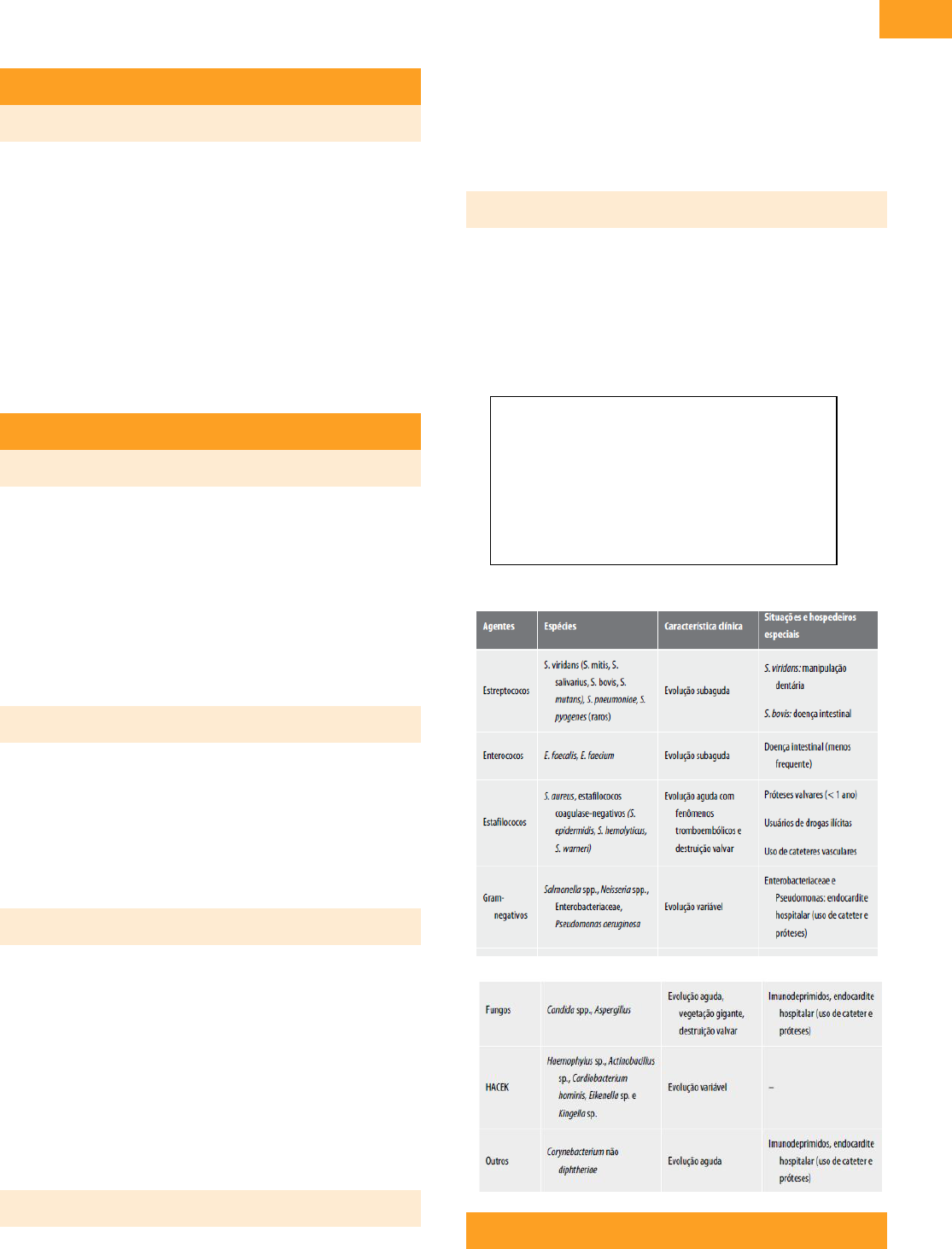 1 Camila Oliveira – D.I.P. ENDOCARDITE INFECCIOSA INTRODUÇÃO ❖ Infecção na superfície endocárdica no coração; ❖ Considera-se também como endocardite infecciosa as infecções de shunts arteriovenosos, arterioarteriais, coarctação da aorta, infecção de cabos de marca-passo e de valvas prostéticas; ❖ A apresentação clínica varia de acordo com o agente causal. ETIOLOGIA ESTREPTOCOCOS ❖ É o gênero mais frequentemente encontrado; ❖ A maioria é causada pelo grupo viridans e a minoria por S. penumoniae e S. pyogenes; ❖ Tem evolução subaguda, acometendo geralmente uma valva com lesão preexistente. ENTEROCOCOS ❖ E. faecalis e E. faecium; ❖ Tem evolução subaguda; ❖ Maior dificuldade de erradicação em relação aos estreptococos pela necessidade de associação de mais de um antibiótico. ESTAFILOCOCOS ❖ Causam a maioria dos casos de endocardite em usuários de drogas ilícitas intravenosas (S. aureus) e em próteses valvares (S. epidermidis e outros estafilococos coagulase negativos); ❖ Tem evolução aguda, com fenômenos embólicos frequentes e maior grau de lesão valvar. BACTÉRIAS GRAM-NEGATIVAS ❖ Com exceção de endocardites causadas por Salmonella e N. goorrhoeae, a maioria das infecções por gram-negativas são hospitalares; ❖ A necessidade de tratamento cirúrgico é regra. OUTROS AGENTES ❖ Fungos (principalmente Candida), ocorrem em usuários de drogas ilícitas endovenosas e em populações de pacientes internados com fatores de risco definidos; ❖ Agentes do grupo HACEK. FISIOPATOLOGIA ❖ A alteração anatômica do endocárdio ou uma superfície naturalmente irregular, como NOTA: Geralmente há uma lesão prévia nas valvas predispondo à colonização por microrganismos. A valva mitral é a mais frequentemente acometida. 2 Camila Oliveira – D.I.P. próteses ou alterações anatômicas congênitas são fatores determinantes iniciais da endocardite infecciosa; ❖ Defeito cardíaco → aumento da pressão entre dois compartimentos → turbilhonamento sanguíneo → lesão endotelial (em drogaditos, podem ocorrer repetidas lesões endoteliais) → depósito de plaquetas e fibrina → formação do trombo → bactérias se ligam ao trombo por terem fatores de adesão → bacteriemia → vegetação; ❖ A bacteriemia ocasiona febre, que terá taquipneia como consequência; QUADRO CLÍNICO ❖ O intervalo de tempo entre uma bacteriemia e o início das manifestações pode ser curto (15 dias); ❖ As manifestações clínicas são mais evidentes conforme for maior o tempo de evolução da doença; ❖ ACOMETIMENTO VALVAR: sopros cardíacos que não existiam antes (nas endocardites de valvas pulmonar e tricúspide os sopros podem estar ausentes); Insuficicência aguda é uma das principais indicações de tratamento cirúrgico; ❖ FENÔMENOS AMBÓLICOS: Podem ocorrer AVCs, IAM, infarto esplênico ou renal, etc. As infecções estafilocócicas são as mais responsáveis pelos fenômenos embólicos; ❖ BACTERIEMIA INTERMITENTE: febre, calafrios e tremores, além de perda de peso, anorexia e sudorese noturna, principalmente nas endocardites de evolução subaguda; ❖ IMUNOCOMPLEXOS CIRCULANTES: lesão de Janeway em regiões palmar e plantar; nódulos de Osler em dedos das mãos e pés; petéquias em pele e conjuntiva ocular; manchas de Roth na retina; esplenomegalia; insuficiência aguda como resultado de uma glomerulonefrite por deposição de imunocomplexos. (nódulos de Osler) DIAGNÓSTICO ❖ Deve-se utilizar os critérios de Duke, que combinam os critérios maiores e os critérios menores; 3 Camila Oliveira – D.I.P. HEMOGRAMA ❖ A maioria das vezes apresenta anemia proporcional ao tempo de evolução da doença, plaquetopenia, leucocitose, níveis elevados de PCR, mucoproteínas e aumento do VHS. SEDIMENTAÇÃO URINÁRIA ❖ Proteinúria, hematúria, decorrendo geralmente do depósito de imunocomplexos. TRATAMENTO ENDOCARDITES ESTREPTOCÓCICAS ❖ Penicilina cristalina ou ampicilina são os fármacos de escolha; ❖ Pode-se associar com algum aminoglicosídeo; ❖ Em algumas situações de resistência, pode- se usar ceftriaxona ou vancomicina. ESTAFILOCOCOS ❖ Oxacilina + aminoglicosídeos; ❖ Vancomicina deve ser reservada para cepas resistentes à oxacilina, o que é regra em endocardites de próteses, em que esta deve ser o tratamento inicial. ENTEROCOCOS ❖ Aminoglicosídeo + beta-lactâmicos (penicilina ou ampicilina); ❖ Se existir resistência aos aminoglicosídeos e às penicilinas, o fármaco de escolha é Vancomicina. FÚNGICAS ❖ Anfotericina B. TRATAMENTO CIRÚRGICO ❖ É regra em pacientes com endocardite de valva prostética; ❖ Outros fatores que podem levar à cirurgia: o Insuficiência cardíaca; o Insuficiência renal aguda; o Agentes resistentes aos antibióticos disponíveis; o Embolização séptica; o Agentes específicos (ex.: S. aureus); o Complicações intracardíacas (abcessos); o Choque séptico. GRUPOS DE RISCO 4 Camila Oliveira – D.I.P. PROCEDIMENTOS CONSIDERADOS DE RISCO