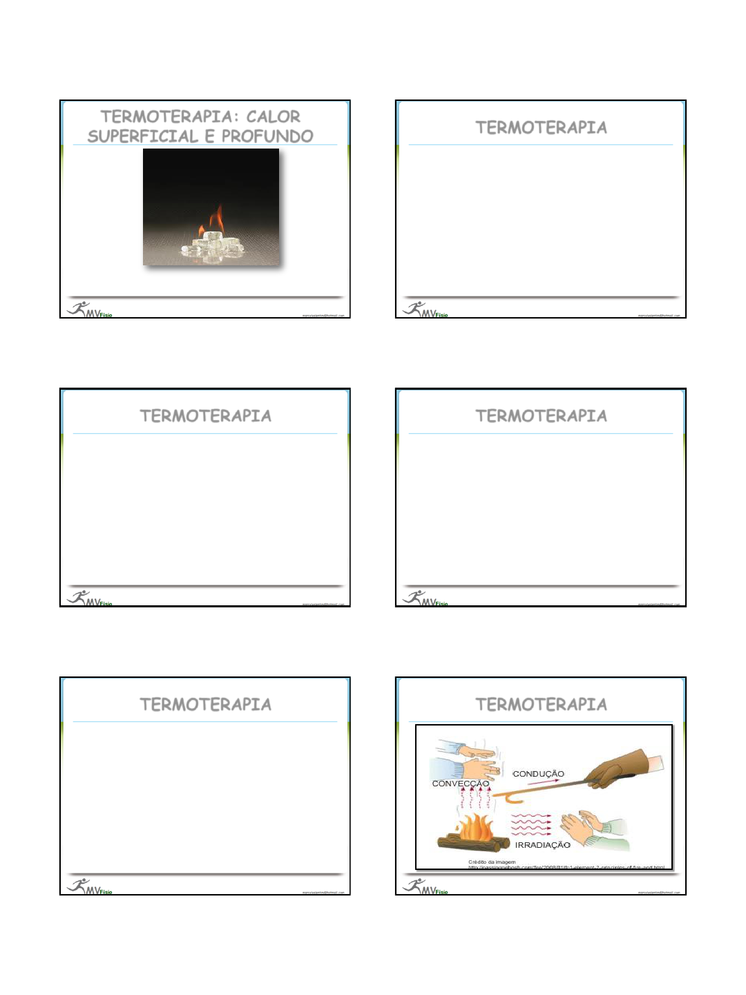 07/08/2014 1 TERMOTERAPIA: CALOR SUPERFICIAL E PROFUNDO Prof.: Msc. Rodrigo Marcel Valentim da Silva TERMOTERAPIA “O que não pode ser curado pela Medicina, Pode ser curado pela cirurgia; O que não pode ser curado pela cirurgia, Pode ser curado pela hipertemia; O que não pode ser curado pela hipertemia É, provavelmente, incurável” (Hipócrates) TERMOTERAPIA • O mais antigo procedimento de reabilitação física • Período Pré-Histórico • Usado para redução do frio • Preparação para realização de outras atividades TERMOTERAPIA • Efeitos da Termoterapia( Calor) – Elevação do Metabolismo – Aumento da Circulação – Redução da Cronaxia nervosa – Diminuição da resistência viscolelástica do músculo e tendões – Aumento da Produção de líquido sinovial – Aumento da FC e do ritmo respiratório TERMOTERAPIA • Temperatura Corporal: 36 à 37°C • Temperatura da Pele: 29 à 34°C • Mecanismo de Regulação da Temperatura Corporal – Temogênese – Termólise TERMOTERAPIA 07/08/2014 2 CONDUÇÃO CONDUÇÃO CONVECÇÃO IRRADIAÇÃO IRRADIAÇÃO EVAPORAÇÃO 07/08/2014 3 MODALIDADES TERMOTERAPEUTICOS Modalidades de Calor Condução Convecção Conversão/ Irradiação Superficial Compressas Envolturas Almofadas Elétrica Bolsas Quentes Areia Quente Parafina Banhos Ducha Quente Sauna Infravermelho Profunda Ondas Curtas Microondas Ultrassom Radiofrequência* PRECAUÇÕES DA TERMOTERAPIA Regiões com alteração de sensibilidade; Pacientes Inconscientes; Patologias Isquêmicas; Regiões Hemorrágicas; Suspeita de Processos Neoplásicos; Próximo ao Útero Gravídico; Próximo aos Testículos; Regiões com Placas Metálicas. CALOR SUPERFICIAL • Compressas • Envolturas • Almofadas Elétrica • Bolsas Quentes • Areia Quente • Forno de Bier e Parafina CALOR SUPERFICIAL • Efeitos – Aplicação: 20-30 minutos – Relaxamento Muscular – Alívio de dor – Preparação para Cinesioterapia ( Alongamento,exercício) – Mobilização Osteomiarticular CALOR SUPERFICIAL • Indicação – Lombalgia – Dor Crônica – Rigidez articular – Espasmo Muscular INFRAVERMELHO (IV) • Infravermelho (IV) – Radiação Eletromagnética(770 a 10.000 nm) – Faixa Terapêutica ( 1.000 nm) – Propagação do Calor: Irradiação – Calor Superficial – Propagam-se no ar – Fração do Espectro Eletromagnético 07/08/2014 4 INFRAVERMELHO (IV) INFRAVERMELHO (IV) – Todos os matérias aquecidos emitem radiação infravermelha – Penetração: 5 a 10 mm abaixo da pele – Potência: Emissão da lâmpada ( em Watts) – Distância Lâmpada x Pele ( 40 a 100 cm)a – Tempo de Duração ( 20 a 30 min) – Dose: Subjetividade de cada paciente INFRAVERMELHO (IV) INFRAVERMELHO (IV) – Efeito Local • Eritma de rápido aparecimento( até 1 hora) • Vasodilatação Cutânea • Efeito anti-inflamatório e cicatrização • Relaxamento muscular • Preparação para o exercício – Efeito Geral • Vasodilatação Superficial com redução da PA • Sedação e relaxamento geral CALOR ÚMIDO • Compressas Quentes • Relaxamento Muscular • Alívio de Dor Crônica • Uso comum pela população • Pouca Fundamentação Científica 07/08/2014 5 FORNO DE BIER • Equipamento em formado de “U” invertido • Aplicação em Membros e no tronco • Introdução do segmento a ser aquecido dentro do forno de bier • Tempo aproximado de 30 minutos FORNO DE BIER BANHOS DE PARAFINA(PA) • Parafina: Substância branca, em forma de cera, obtida pela destilação do petróleo – Gera calor por condução – Grande condutibilidade térmica – Grande Maleabilidade – Ponto de Fusão: 50 a 53 °C BANHOS DE PARAFINA(PA) • Método de Aplicação – Direto ou Imersão – Pincelamento – Enfaixamento ou compressas – Batida BANHOS DE PARAFINA(PA) BANHOS DE PARAFINA(PA) 07/08/2014 6 BANHOS DE PARAFINA(PA) • Indicação: – Artites, artroses,edemas, alterações periféricas – Contra-Indicação • Flebite, febre,alterações de sensibilidade,processos inflamatórios agudos ou subagudos,lesões dermatológicas,escaras TURBILHÃO • Calor Superficial • Associação com os movimentos da água; • Hidromassagem • Banho de 20-30 minutos • Muito Utilizado na Prática • Poucos efeitos( Científicos) TURBILHÃO OBRIGADO!!!!!! “O amor é uma planta de origem divina que deve ser cultivada entre nós” (Ellen G.White)