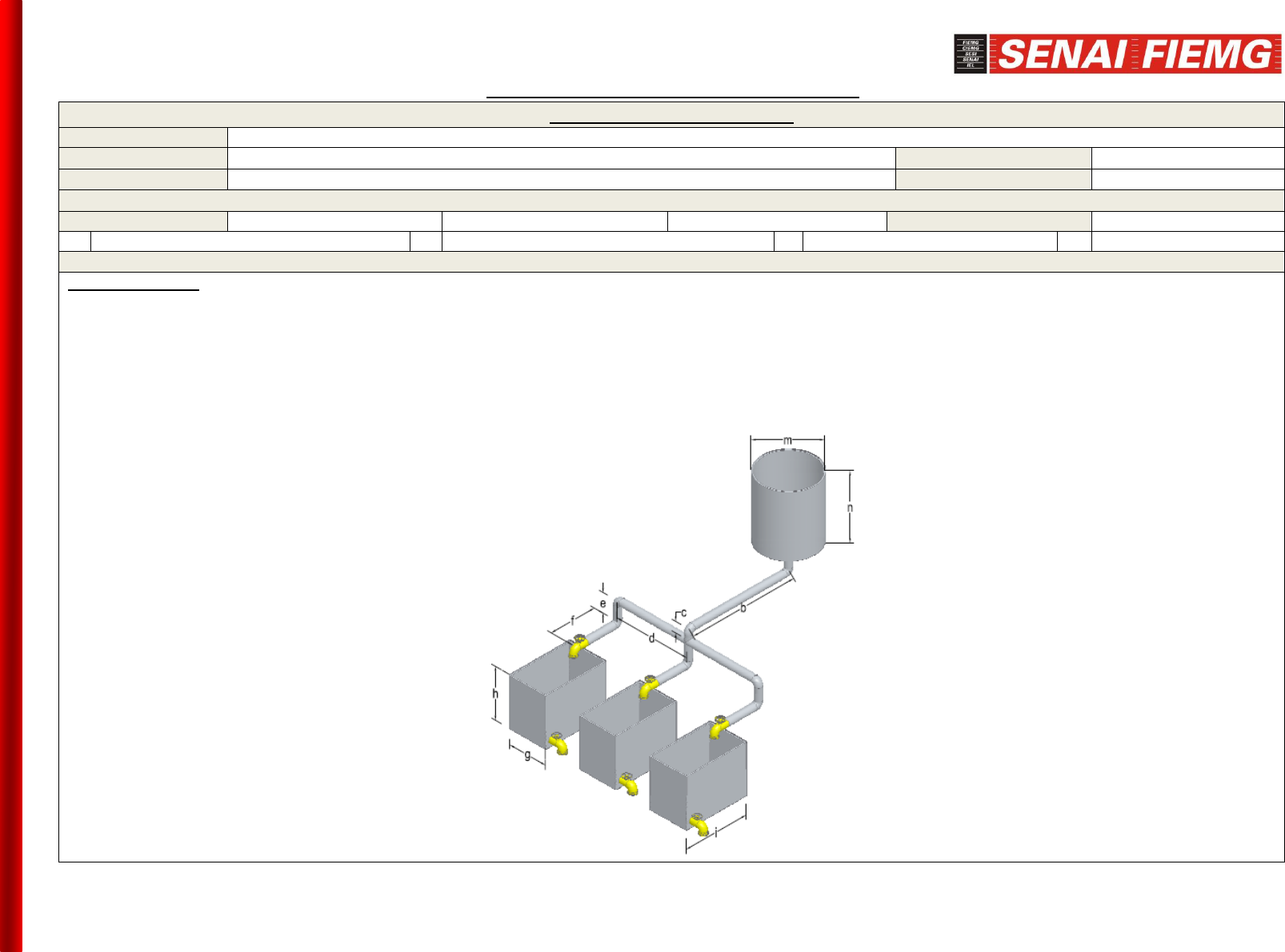 Curso Técnico em Eletroeletrônica Unidade Curricular: Cálculo Aplicado Versão do Itinerário: 05 N° da S.A.: 01 S.A. elaborada por: Lilian_Nelson_Saulo_Rafael Nome da S.A.: Dimensionando o tanque de distribuição Escola : CFPACH_CFPDRCC_ CDTSVE-SBS_UISS-JBNJ Versão do Plano de Curso: 01 Ano: 2017 Página 1 de 2 DESCRIÇÃO DA SITUAÇÃO DE APRENDIZAGEM SITUAÇÃO DE APRENDIZAGEM Curso Técnico em Eletroeletrônica Unidade Curricular Cálculo Aplicado Carga horária da U.C. 40 horas / 54 aulas Nome da S.A. Dimensionando o tanque de distribuição Nº da S.A. 01 ESTRATÉGIA DE APRENDIZAGEM DESAFIADORA Valor da S.A. 80 pontos CH Prevista da S.A. 40 horas / 54 aulas Período de Realização x Situação Problema Estudo de Caso Projeto Pesquisa Aplicada DESCRIÇÃO DA ESTRATÉGIA DE APRENDIZAGEM DESAFIADORA Contextualização: A matemática é impressionante, não é mesmo? Ela nos oferece um conjunto de métodos poderosos, capazes de nos fazer compreender e transformar o mundo em que vivemos. Nas empresas, é por meio da matemática que muitos problemas são resolvidos. Um exemplo se aplica na Engeclamp. Ela tem por valor o comprometimento com a preservação do meio ambiente e seus recursos e por isso investiu num projeto de construção de um sistema de coleta de água da chuva num tanque cilíndrico e sua distribuição em tanques menores de igual capacidade, para reuso em alguns setores da empresa, como mostra a figura abaixo. Curso Técnico em Eletroeletrônica Unidade Curricular: Cálculo Aplicado Versão do Itinerário: 05 N° da S.A.: 01 S.A. elaborada por: Lilian_Nelson_Saulo_Rafael Nome da S.A.: Dimensionando o tanque de distribuição Escola : CFPACH_CFPDRCC_ CDTSVE-SBS_UISS-JBNJ Versão do Plano de Curso: 01 Ano: 2017 Página 2 de 2 Dados do sistema de conexão dos tanques foram levantados e são mostrados a seguir: VARIÁVEIS MEDIDAS TANQUE SUPERIOR m 300 cm TUBULAÇÕES b 8 m c 500 mm d 3000 mm e 100 cm f 0,002 km TANQUES INFERIORES g 150 cm h 2 m i 300 cm Desafio: Você, técnico em eletroeletrônica da empresa, foi convocado para participar desse projeto a fim de levantar outros dados para estimar a capacidade de armazenamento do tanque de distribuição e garantir o seu aproveitamento máximo. Aproveite a oportunidade e bom trabalho! Resultados/Entregas Esperados: Ao final, você deverá entregar um trabalho escrito que contenha a justificativa para o uso da unidade de medida padronizada escolhida e os cálculos realizados ao longo da unidade curricular para determinar: 1) A distância entre os tanques. 2) A altura da água no tanque superior, considerando que ele possui capacidade para encher os três tanques inferiores e ainda manter um volume reserva de 30%. 3) No tanque superior existe uma boia fixada, no centro e no fundo, que monitora o volume de água nas paredes laterais do tanque. Determine a distância da boia até o ponto onde ela está fixada, no momento que em que o tanque acaba de abastecer os tanques inferiores e represente-a nas formas de coordenada polar e retangular. 4) A distância estimada entre as válvulas no tanque inferior, apresentando-a nas formas de coordenada polar e retangular. 5) A quantidade de chapa necessária para a construção do tanque cilíndrico, considerando o seu diâmetro externo e sabendo que a espessura da chapa utilizada é de 3,2 mm. Como medida de segurança, considere ainda que o tanque trabalha enclausurado e deve ter 0,2 m de altura acima do nível máximo de água em seu interior. 6) O nível do reservatório é controlado por um sistema onde cada centímetro de altura da água armazenada é identificada como 20 mV. Determine a tensão no sistema de controle quando o reservatório está com seu volume mínimo.