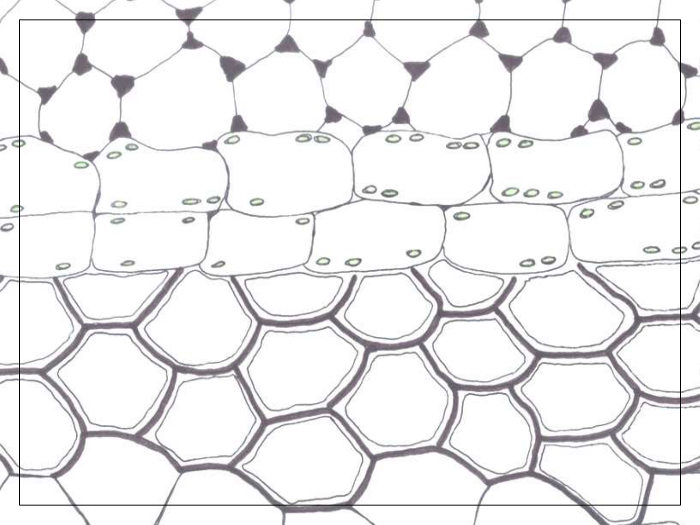 Parênquima Colênquima Esclerênquima Parênquima Parênquima fundamental - Características Tecido que preenche o corpo da planta Se desenvolve a partir do meristema fundamental A parede celular é primária e delgada – celulose Solanum lycopersicum Linum usitatissimum Parênquima - Considerações Gerais Em plantas primitivas as células eram essencialmente parenquimáticas Os diversos tipos de tecidos que constituem o corpo dos vegetais se originaram a partir do parênquima Em briófitas, a maior parte do parênquima é fotossintetizante Parênquima fundamental - Características As células estão ligadas por pontuações primárias Protoplasto é vivo Vacúolo é amplo Possuem capacidade meristemática - Totipotente Piptadenia gonoachanta Capsicum annuum Parênquima fundamental - Ocorrência Nos frutos – contendo cromoplastos Solanum lycopersicum Parênquima fundamental - Ocorrência Esta presente em todos os órgãos da planta No caule – córtex e medula Phaseolus vulgaris Na raiz – córtex Parênquima fundamental - Ocorrência Na folha – pecíolo e mesofilo Plectranthus amboinicus Piptadenia gonoachanta Parênquima clorofiliano ou clorênquima – Características Possui morfologia adequada para realizar fotossíntese Piptadenia gonoachanta Parênquima clorofiliano ou clorênquima – Características Vacúolo central amplo Cloroplastos juntos à parede celular (camada periférica) Piptadenia gonoachanta Parênquima de reserva – Aquífero Características Células grandes A água é acumulada no vacúolo Phormium sp. Aerênquima – Características Espaços intercelulares grandes Ocorre principalmente em plantas aquáticas Pinus sp. Parênquima plicado Ocorre nas gimnospermas Parênquima de reserva – Características Comum em sementes, raízes e tubérculos Normalmente acumulam amido, proteínas ou lipídeos Classifique os tipos de parênquima como: Parênquima fundamental Parênquima clorofiliano – Parênquima paliçádico e parênquima lacunoso Parênquima de reserva Parênquima aquífero Aerênquima Parênquima plicado Parede celular Espaço intercelular Pecíolo de aipo - Apium graveolens 1 Raiz – Mandevilla velutina 2 Folha – Nymphoides indica 3 a b Caule – Ricinus communis 4 Folha - Croton floribundus 5 a b c 6 Caule – Miriophyllum sp. Caule - Michelia fuscata (figo) 7 Folha Elodea sp. 8 9 Folha Pinus sp. Colênquima Considerações Gerais Células com protoplasto vivo Parede primária espessa desigualmente Campos de pontuação primária nas regiões menos espessas Possuem capacidade de retomar a atividade meristemática - Totipotente Coleus sp. Colênquima – Distribuição A posição periférica é característica Normalmente esta localizado logo abaixo da epiderme Biden pilosa Colênquima – Distribuição No caule e no pecíolo - cilindro contínuo ou cordões individuais, geralmente nas arestas do órgão Nas folhas ocorre nas nervuras acompanhado os feixes vasculares, ocorrendo em ambos os lados ou em um só (quase sempre o inferior) Colênquima – Forma e função Tecido de sustentação Paredes celulares forte e flexível Ocorre em órgão sujeitos a movimentos constantes O desenvolvimento do colênquima pode ser mais rápido em plantas sujeitas a situações de estresse Colênquima – Forma e função Um feixe de colênquima pode suportar de 10 a 12 kg por mm2 As células pode chegar a 2mm de comprimento Vitis sp. (X 285) Tipos de colênquima Lamelar Angular Lacunar Colênquima - Lamelar Espessamento ocorre nas paredes tangenciais Pouco comum O espessamento das paredes se dá normalmente pela adição de celulose, pectina mas não lignina (parede primária) Taraxacum officinale Colênquima - Angular Maior espessamento nos vértices Comum em pecíolos e caules de Cucurbitaceae e Asteraceae Coleus sp. Colênquima - Angular Beta vulgaris Colênquima - Lacunar Possui espaços intercelulares Artemisia absinthium Esclerênquima Esclerênquima - Considerações gerais Parede celular elástica - Se um órgão maduro fosse constituído apenas por paredes plásticas as deformações seriam permanentes O esclerênquima atua no suporte do vegetal Pode não mantém o protoplasto vivo Parede secundária lignificada com espessamento uniforme Origem primária Ocorrem na forma de esclereídes ou fibras primárias Esclerênquima - Características A lignina é uma substância amorfa (não possuem estrutura atômica definida) formada pela polimerização de vários álcoois A lignina é uma substância inerte (não reage químico- biologicamente e nem se deteriora) que evita ataque físico, químico e biológico A passagem da água é mais lenta nas paredes secundárias composto orgânicos que possui um ou mais grupos de hidroxilas (-OH) ligados a carbonos saturados Esclerênquima - Ocorrência Raízes e caules Folhas Cascas de frutos Envoltório de sementes Esclerênquima - Ontogênese Crescimento intrusivo não coordenado Tipos celulares: esclereídes e fibras primárias Esclereídes se originam do meristema fundamental Se formam a partir da diferenciação de uma células parenquimática As fibras primárias se originam do procâmbio Tipos de Esclerênquima Esclereídes Parede muito espessa Muitas pontuações Quanto ocorrem isoladas -idioblastos Tipos de Esclereídes Colunar Presentes no mesofilo das folhas Ocorre em plantas xerófitas Fornecem suporte Osmanthus sp. Camellia sp. Tipos de Esclereídes Osteoesclereídes (colunar) Dilatadas ou ramificadas nas extremidades Recobre sementes Ocorre em plantas xerófitas Tipos de Esclereídes Braquiesclereídes Agrupadas Muitas pontoações Encontrado em partes macias de alguns frutos Pyrus sp Tipos de Esclereídes Astroesclereídes Possui formato de estrela Encontrada nos pecíolos e folhas Tipos de Esclereídes Tricoesclereídes Semelhante aos tricomas com formato ramificado Tipos de Esclereídes Macroesclereídes ou células de Malpighi Ocorrem nas sementes das leguminosas Phaseolus vulgaris Tipos de Es