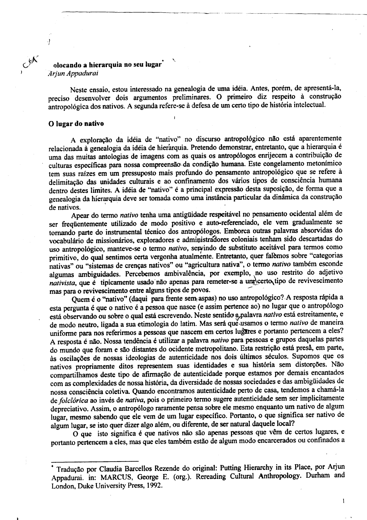 Cássio Júnio Nota APPADURAI, Arjun. 1992. “colocando a hierarquia em seu lugar. Tradução por Claudia Barcellos Rezende.nullnullnullnull
