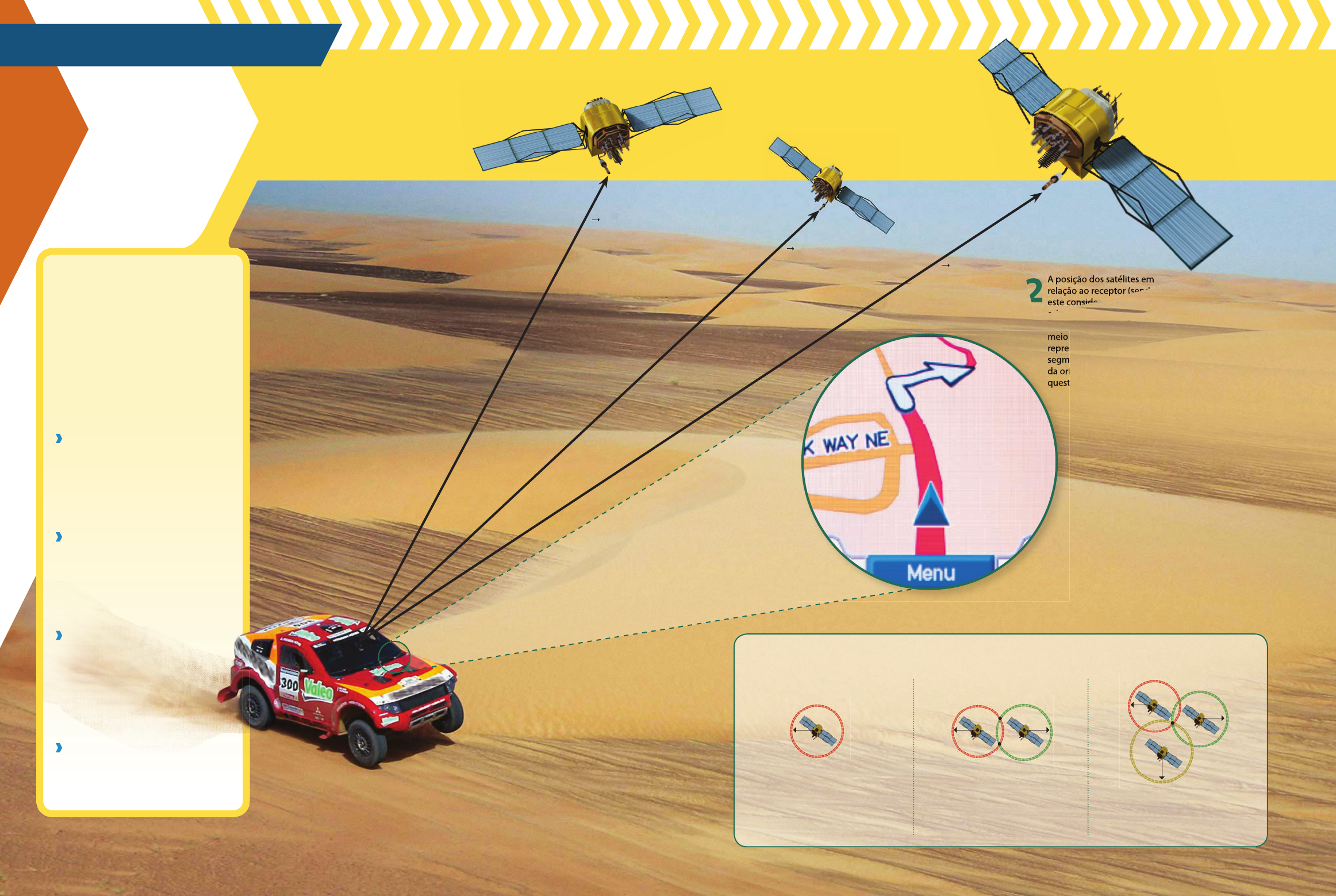 OSistema de Posicionamento Global – GPS, na sigla em inglês – é um sistema de radionavegação baseado em satélites que permite ao usuário saber a sua localização em qualquer ponto do globo terrestre através de sua posição relativa a um determinado grupo desses satélites. Um receptor capta sinais de rádio enviados do sistema de satélites. Sabendo o tempo que o sinal leva para ir e voltar a um satélite, pode-se calcular a que distância o receptor está da fonte emissora. 1 Capítulo 7 Vetores UNIDADE C Vetores e grandezas vetoriais: Cinemática vetorial Os vetores são entes matemáticos amplamente utilizados em Física. Eles representam grandezas que só ficam definidas quando são conhecidos seu módulo, sua direção e seu sentido. Grandezas desse tipo são denominadas grandezas vetoriais. 7.1 Introdução Algumas grandezas físicas podem ser definidas apenas por um valor numérico e uma unidade; outras precisam, além disso, de uma direção e um sentido. 7.2 Vetores Vetor é o ente matemático caracterizado pelos elementos módulo, direção e sentido, sendo representado por um segmento de reta orientado. 7.3 Operações com vetores A adição vetorial pode ser feita pela regra da linha poligonal ou pela regra do paralelogramo. A subtração de dois vetores corresponde à adição de um vetor com o oposto do outro. 7.4 Componentes de um vetor É frequente o uso da Trigonometria em problemas que envolvem vetores. R1 V1_P1_UN_C_CAP_07.indd 116 20.07.09 10:21:25 Como é feita a localização A posição dos satélites em relação ao receptor (sendo este considerado como origem do eixo cartesiano) pode ser representada por meio de um vetor posição – representado por um segmento orientado que parte da origem até o ponto em questão. 2 Quando se deseja chegar a um determinado local, o cálculo é feito também para o destino, e então é traçada uma rota, que indica, por meio de vetores, a direção a ser tomada. 3 meio de um representado por um segmento orientado que parte da origem até o ponto em questão. Um segundo satélite encontra uma distância R2 do receptor: a posição fica restrita a dois pontos (as intersecções das duas circunferências). Com o cálculo da distância R3 do receptor ao terceiro satélite, sua posição é encontrada na intersecção das três circunferências centradas nos satélites. Sendo R1 a distância do receptor ao primeiro satélite. O receptor pode estar em qualquer ponto da circunferência de centro neste satélite. São necessários no mínimo 3 satélites para uma localização exata do receptor. Um quarto satélite faz o ajuste do tempo. S1 R1 R1 R2S1 S2 S1 S2S3 R1 R2 R3 A posição dos satélites em relação ao receptor (sendo este considerado como origem do eixo cartesiano) 2 R2 R3 118 U n id a d e C • Ve to re s e gr an de za s ve to ri ai s: C in em át ic a ve to ri al R ep ro d uç ão p ro ib id a. A rt .1 84 d o C ód ig o P en al e L ei 9 .6 10 d e 19 d e fe ve re iro d e 19 98 . O ângulo J que as retas do feixe formam com a reta s determina a direção de r e de todas as retas paralelas a r. Sendo assim, direção é o que há de comum num feixe de retas paralelas. Numa mesma direção podemos ter dois sentidos possíveis. Por exemplo, na direção horizontal, temos o sentido da esquerda para a direita e o da direita para a esquerda; na direção vertical, temos o sentido de cima para baixo e o de baixo para cima. É muito comum o uso de placas indicativas, que fornecem direções e sentidos de vários destinos, como mostra a foto ao lado. Figura 1. s r θθθθ Seção 7.1 Objetivos Diferenciar grandezas escalares de grandezas vetoriais. Distinguir os conceitos de direção e de sentido. Termos e conceitos • grandezas escalares • grandezas vetoriais Introdução Considere um feixe de retas paralelas a uma dada reta r (fig. 1). Grandezas escalares e grandezas vetoriais Muitas grandezas ficam perfeitamente definidas quando conhecemos seu valor numérico e a correspondente unidade. Tais grandezas são de- nominadas grandezas escalares. É o caso, por exemplo, da massa e do volume de um corpo. Quando dizemos que a massa de um corpo é igual a 20 kg e que seu volume é de 10 litros, nada mais precisamos acrescentar para definir essas grandezas. Existem, porém, grandezas que, além do valor numérico e da unidade, necessitam de direção e sentido para que fiquem definidas. Por exemplo, a distância em linha reta de São Paulo a Belo Horizonte é de aproxima- damente 510 km (fig. 2A). Para chegarmos a Belo Horizonte partindo de São Paulo, devemos percorrer aproximadamente 510 km na direção sudoeste-nordeste, no sentido de sudoeste para nordeste. Grandezas que necessitam, além do valor numérico e da unidade, de direção e de sentido para serem definidas são chamadas grandezas vetoriais, sendo representadas matematicamente por vetores. O deslocamento entre dois pontos é uma grandeza vetorial. Um vetor pode ser representado como na figura 2B, por meio de um segmento orientado. Figura 2B. A representação vetorial do deslocamento de São Paulo a Belo Horizonte. 1 cm 0 135 km ESTADO DE SÃO PAULO São Paulo Belo Horizonte ESTADO DE MINAS GERAIS N S O E NO SO SE NE Figura 2A. A localização de São Paulo e Belo Horizonte no mapa. V1_P1_UN_C_CAP_07.indd 118 21.07.09 10:51:05 119 C a p ít u lo 7 • Ve to re s R ep ro d uç ão p ro ib id a. A rt .1 84 d o C ód ig o P en al e L ei 9 .6 10 d e 19 d e fe ve re iro d e 19 98 . Objetivos Definir vetor. Identificar vetores iguais e vetores diferentes. Termos e conceitos • módulo • direção • sentido • vetor Seção 7.2 Vetores Os segmentos orientados da figura 3 têm o mesmo comprimento e, por serem paralelos, têm a mesma direção. Têm ainda o mesmo sentido. Vetor* é o ente matemático caracterizado pelo que há de comum ao conjunto dos segmentos orientados acima descrito: o mesmo com- primento, a mesma direção e o mesmo sentido. O comprimento
