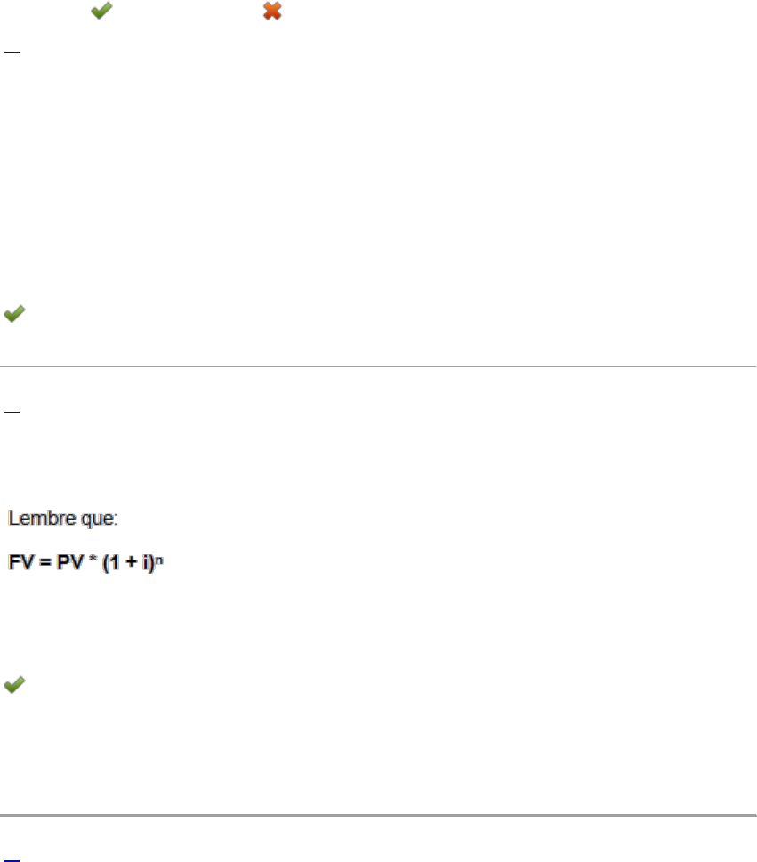 Acadêmico: Queli Levandowski (1203849) Disciplina: Matemática Financeira (MAT15) Avaliação: Avaliação Final (Objetiva) - Individual FLEX ( Cod.:423811) ( peso.:3,00) Prova: 8087212 Nota da Prova: 10,00 Legenda: Resposta Certa Sua Resposta Errada Parte superior do formulário 1. Nas operações calçadas em juros simples, o cálculo do juro de cada período é sempre calculado com base no capital inicial. Nesse contexto, uma situação em que um capital é aplicado a juros simples durante 2 anos, sob a taxa de juros de 3% ao mês, gerou juros de R$ 1440,00. Com base nessa situação, assinale a alternativa CORRETA: Lembre que: J = C * i * n a) O montante apurado no cálculo é de R$ 2.880,00. b) O prazo utilizado no cálculo é de 36 meses. c) As parcelas de pagamentos anuais serão de R$ 720,00. d) O capital aplicado é de R$ 2.000,00. 2. Um devedor quitou suas obrigações junto a uma instituição financeira, com 3 meses de atraso, pelo valor de R$ 5.151,50. Considerando que contratualmente estava prevista a taxa juros mensal de 1,00%, pelo regime de capitalização composta, para situações de atraso, assinale a alternativa CORRETA: a) Os juros pagos no momento da liquidação da dívida foram de aproximadamente R$ 450,00. b) A operação gerou juros mensais de aproximadamente R$ 150,00. c) O valor da dívida, na data em que deveria ser quitada, era de aproximadamente R$ 5.000,00. d) Considerando o regime de juros compostos, dobrando o prazo do atraso, os juros dobrariam na mesma proporção. 3. Em um empréstimo pessoal realizado no valor de R$ 1.000,00, como demonstrado no esquema a seguir, observou-se a evolução do capital apresentado na tabela. Partindo do pressuposto que um sistema de capitalização é a forma matemática de se determinar a evolução de um valor monetário no tempo, classifique V para as sentenças verdadeiras e F para as falsas: ( ) A taxa de juros aplicada na operação é de 5,00 % a.m. ( ) Os juros apurados na demonstração somam R$ 1.150,00. ( ) A operação foi realizada pelo regime de juros compostos. ( ) Ao final do 4º mês, os juros acumulados serão de R$ 200,00. Agora, assinale a alternativa que apresenta a sequência CORRETA: a) V - F - F - V. b) F - V - F - F. c) V - V - V - F. d) F - F - V - V. 4. Eduardo, cliente de uma empresa, em uma operação comercial, quitou com seu credor, uma duplicata, com 2 meses de atraso, pelo valor de R$ 6.000,00. Considerando que, conforme combinado entre as partes, em caso de atraso, seriam acrescidos juros mensais de 3% pelo regime de capitalização composta, analise as sentenças a seguir: I- O valor original da dívida era de R$ 5.000,00. II- Se a taxa de juros fosse diária, o prazo seria convertido em 60 dias. III- Os juros cobrados no período foram de R$ 344,42. Agora, assinale a alternativa CORRETA: a) Somente a sentença III está correta. b) As sentenças I e III estão corretas. c) Somente a sentença II está correta. d) As sentenças II e III estão corretas. 5. Considerando que taxas proporcionais ocorrem quando seus prazos e valores, reduzidos à mesma unidade, formam uma proporção ao realizar um acordo de parcelamento de um débito, o credor ofereceu ao devedor a possibilidade de liquidar a dívida em parcelas mensais com a taxa de 1,60% ou com parcelas bimestrais com a taxa de 3,20%, ambas pelo regime de juros simples. Classifique V para as sentenças verdadeiras e F para as falsas: ( ) Torna-se vantajoso para o devedor utilizar-se da taxa de 1,60% a.m., por gerar um volume menor de juros. ( ) A taxa de 3,20% a.b. será proporcional a 1,60% a.m. apenas no regime de juros compostos. ( ) Por se tratarem de taxas proporcionais, ambas as propostas formarão os mesmos juros acumulados. ( ) Entende-se que 1,60% a.m. é proporcional a 3,20% a.b. Agora, assinale a alternativa que apresenta a sequência CORRETA: a) V - V - V - F. b) F - V - V - F. c) F - F - V - V. d) V - F - F - F. 6. A porcentagem serve para determinar uma certa parte de um dado valor. No ano de 2016, o governo de determinado estado abriu concurso público. Dos 800 inscritos, 160 foram aprovados e 48 foram chamados para assumir os devidos cargos. Com base nas informações, classifique V para as sentenças verdadeiras e F para as falsas: ( ) Do total de inscritos, 6% foram chamados a assumir os devidos cargos. ( ) Do total de inscritos, 20% foram chamados a assumir os devidos cargos. ( ) Do total de inscritos, 20% foram aprovados pelo concurso. ( ) Do total de inscritos, 6% foram aprovados pelo concurso. Assinale a alternativa que apresenta a sequência CORRETA: a) V - V - V - F. b) F - V - F - V. c) F - F - F - V. d) V - F - V - F. 7. Quando realizamos um empréstimo ou aplicação, temos os sistemas de capitalização a serem utilizados para o cálculo dos juros obtidos através dessa transação. O regime de capitalização é a forma através da qual se verifica o crescimento do capital, este pode ser pelo regime de capitalização simples ou composta. Sobre o regime de capitalização, classifique V para as sentenças verdadeiras e F para as falsas: ( ) No regime de capitalização simples, os juros são calculados utilizando como base o capital inicial. ( ) No regime de capitalização composta, as taxas de juros são aplicadas sobre o capital acumulado dos juros. ( ) No regime de capitalização composta, os juros são calculados utilizando como base o capital inicial. ( ) No regime de capitalização simples, as taxas de juros são aplicadas sobre o capital acumulado dos juros. Assinale a alternativa que apresenta a sequência CORRETA: a) F - V - F - V. b) V - V - F - F. c) V - F - V - F. d) F - F - V - V. 8. Muitas são as condições que delimitam as operações pelo regime de capitalização simples. Imaginemos uma situação em que uma empresa comercial, em uma venda de produtos, cedeu um crédito sob o viés dos juros simples de R$ 40.000,00 a um de seus clientes. Considerando que foi aplicada uma taxa anual de 