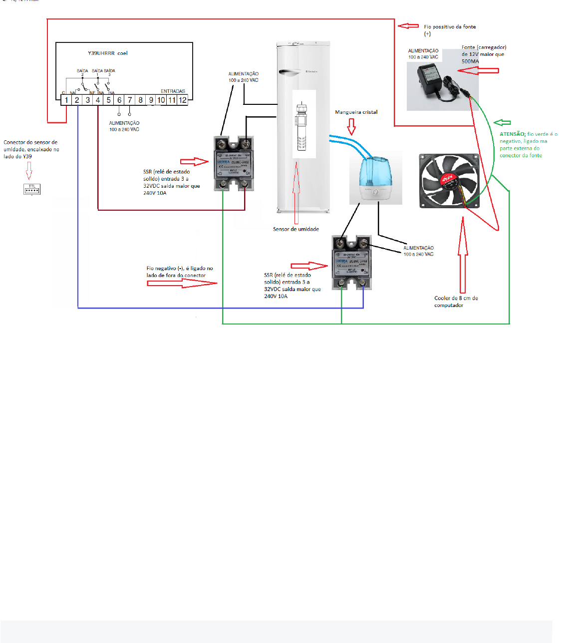 MONTAGEM DE CÂMARA DE MATURAÇÃO COM GELADEIRA USADA Observações: Qualquer técnico elétrico/eletrônico industrial consegue fazer o serviço O tubo que sai do umidificador é transparente para possibilitar verificação de formação de fungos indesejáveis O sensor deve ficar na metade da altura interna da geladeira O ventilador fixo na porta com espaço de no mínimo de 3 cm entre ele e a porta, no meio da altura interna da geladeira Fios do sensor e do ventilador podem passar no mesmo furo do tubo do umidificador Na lateral da geladeira não passa canos de gás, sempre verificar esquema elétrico do equipamento, mas na maioria dos equipamentos não há cabeamento na lateral a menos de 70cm do chão. Qualquer furo pode ser vedado com espuma expansiva (no caso de querer tampar um furo feito no lugar errado), que não compromete o equipamento. Vedação do furo onde passa o tubo do umidificador também pode ser com massa expansiva. GELADEIRA: pode ser comum, com congelador interno, porém tirem a porta do mesmo e adaptem uma bandeja bem abaixo dele para coletar o excesso de água, a água acumulada ali acaba diminuindo a utilização do umidificador, não sendo necessário completar água toda hora, como o tubo de vapor está conectado com cola de silicone, é necessário desmontar o equipamento, pois não dá para completar água por cima... coloquei uma bacia para evitar que, em caso de um acidente, derrube água no chão. Paguei R$ 500,00 na geladeira usada em ótimo estado (com frete), em Jundiaí/SP UMIDIFICADOR: Simples, somente conectamos um cano na saída de vapor com cola de silicone para vedar bem, só atrapalha pois não podemos colocar água por cima, mas não dá tanto trabalho assim tirar a parte de baixo; não deixamos a água acabar antes de colocar mais, o cano entra na geladeira por um buraco na lateral da geladeira. A maior parte das geladeiras possui cano de gás apenas na parte de trás, mas nada melhor que buscar o esquema elétrico e mecânico do equipamento para saber por onde passam os canos e fios. Os cabos do ventilador e sensor passam pelo mesmo buraco do tubo. VENTILADOR: é um cooler de computador de 08 cm CONTROLADOR DE UMIDADE: optamos pelo Y39UHRRR da Coel. CUIDADO: O FINAL DEVE SER RRR, os demais não permitem calibragem na temperatura e umidade que necessitamos. A caixa para acondicionar o equipamento não vem junto, você a compra em qualquer loja de material elétrico; somente são fornecidos o equipamento e o sensor, também o restante do cabeamento deve ser comprado a parte. Tanto a geladeira quanto o umidificador são ligados nesse equipamento, para manter a temperatura e umidade registradas, ele liga e desliga tanto a geladeira quanto o umidificador. O Relê do equipamento não suporta o trabalho, portanto fazer instalação externa de SSR antes de utilizar, caso já o tenha utilizado e o relê tenha colado, o SSR deve ser ligado diretamente na alimentação da bobina de cada relê do Y39; esse serviço somente deve ser executando por um técnico eletrônico experiente. Para calibrar o equipamento utilizar o manual do mesmo, visto haverem vários tipos e fabricações. Qualquer manual é facilmente encontrado na internet em português. Espero ter ajudado Marcos Pereira Pascoal e Alexandra A Jahnel Pascoal