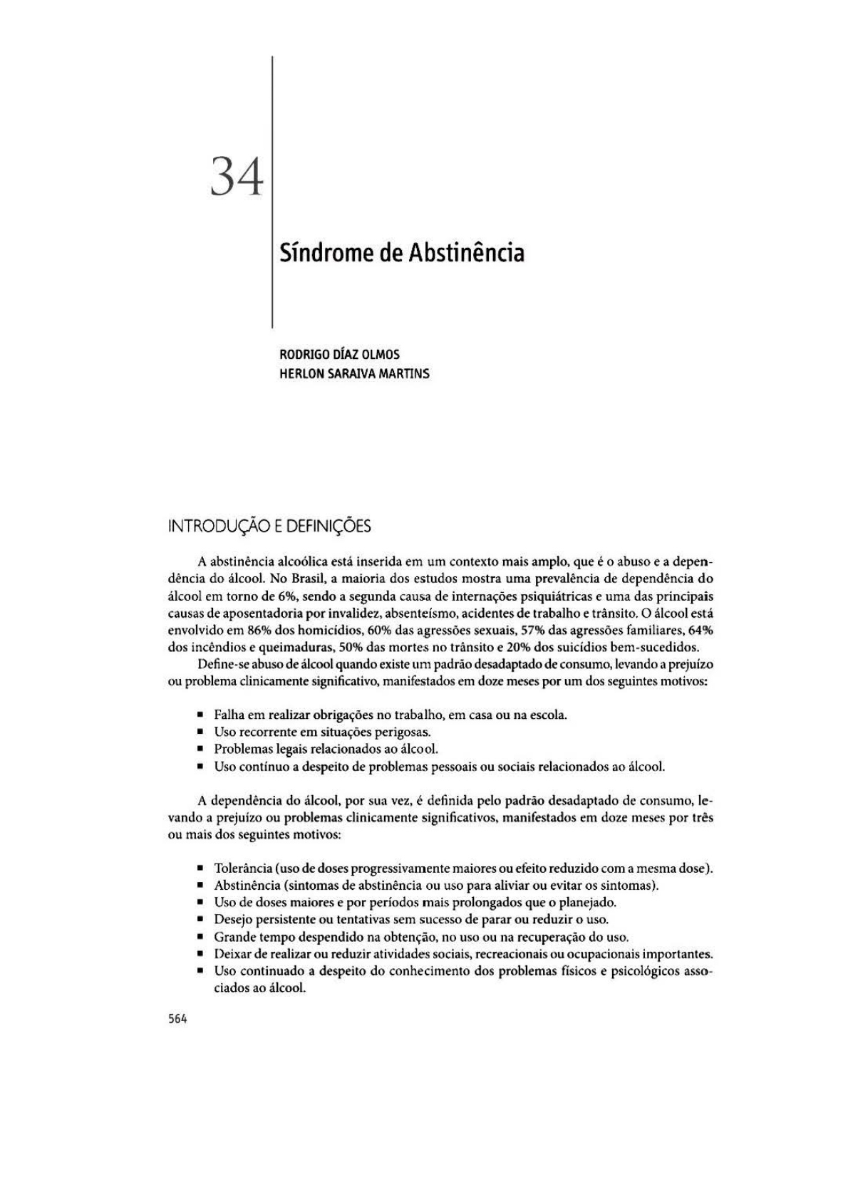 34 Síndrome de Abstinência RODRIGO DÍAZ OLMOS HERLON SARAIVA MARTINS INTRODUÇÃO E DEFINIÇÕES A abstinência alcoólica está inserida em um contexto mais amplo, que é o abuso e a depen- dência do álcool. No Brasil, a maioria dos estudos mostra uma prevalência de dependência do álcool em torno de 6%, sendo a segunda causa de internações psiquiátricas e uma das principais causas de aposentadoria por invalidez, absenteísmo, acidentes de trabalho e trânsito. O álcool est:á envolvido em 86% dos homicídios, 60% das agressões sexuais, 57% das agressões familiares, 64% dos incêndios e queimaduras, 50% das morte:s no trânsito e 20% dos suicídios bem-sucedidos. Define-se abuso de álcool quando existe um padrão desadaptado de consumo, levando a prejuízo ou problema clinicamente significativo, manifestados em doze meses por um dos seguintes motivos: • Falha em realizar obrigações no trabalho, em casa ou na escola. • Uso recorrente em situações perigosas. • Problemas legais relacionados ao áko oi. • Uso contínuo a despeito de problemas pessoais ou sociais relacionados ao álcool. A dependência do álcool, por sua vez, é definida pelo padrão desadaptado de consumo, le- vando a prejuízo ou problemas clinicamente significativos, manifestados em doze meses por três ou mais dos seguintes motivos: 564 • Tolerância (uso de doses progressivamente maiores ou efeito reduzido com a mesma dose). • Abstinência (sintomas de abstinência ou uso para aliviar ou evitar os sintomas). • Uso de doses maiores e por períodos mais prolongados que o planejado. ■ Desejo persistente ou tentativas sem sucesso de parar ou reduzir o uso. • Grande tempo despendido na obtenção, no uso ou na recuperação do uso. • Deixar de realizar ou reduzir atividades sociais, recreacionais ou ocupacionais importantes. • Uso continuado a despeito do conhecimento dos problemas físicos e psicológicos asso- ciados ao álcool. Síndrome de abstinência 565 ETIOLOGIA E FISIOPATOLOGIA A síndrome de abstinência alcoólica inclui dois componentes: 1. Cessação ou redução no uso crônico de grande quantidade de álcool ( dependência do álcool). 2. Presença de dois ou mais dos sintomas de abstinência: ., Hiperatividade autonômica (sudorese, taquicardia, hipertensão sistólica) . ., Tremor nas mãos . ., Insónia . ., Náuseas ou vômitos . ., Alucinações visuais, auditivas ou táteis transitórias . ., Agitação psicomotora . ., Ansiedade . ., Crises tônico-clônicas generalizadas. A ingestão aguda de álcool leva inicialmente a uma liberação de opioides endógenos cau- sando euforia e reforço para o uso continuo; em seguida, há ativação dos receptores inibitórios GABA tipo A, causando efeitos sedativos, ansiolíticos, descoordenação e inibição dos recepto• res excitatórios. Em razão do uso crónico do álcool ocorrem alterações no número e na função dos receptores, como uma resposta compensatória aos efeitos depressivos do álcool. Assim, há uma diminuição nos receptores GABA tipo A e um aumento nos receptores excitatórios. Essa adaptação crônica reverte-se quando há suspensão da ingestão crônica de álcool, culminando com o estado de hipe- rexcitabilidade da sínd.-ome de abstinência alcoólica. ACHADOS CLÍNICOS O curso da síndrome de abstinência alcoólica é altamente variável e depende de alguns fato• res,como: • Quantidade de álcool consumida. ■ Síndromes de abstinência prévias. • Condições médicas associadas. Em média, os sintomas de abstinência podem começar de 5 a 10 horas após a última dose, com pico entre 48 e 72 horas, desaparecendo em 5 a 14 dias. Os achados clínicos mais importantes estão descritos na Tabela 1. A escala CIWA-Ar (J-Clinical lnstitute Withdrawal Assessment of Alcohol Scale, revim/) con- tém os principais achados clínicos da síndrome de abstinência, sendo possível quantificar cada um deles. Dessa forma, podemos classificar a abstinência da seguinte forma: • < IO pontos: abstinência muito leve. • 10 a IS pontos: abstinência leve. • 16 a 20: pontos: abstinência moderada. • >20 pontos: abstinência grave. Além disso, a escala poderá ser útil no tratamento e acompanhamento clinico, sendo a meta usar benzodiazepínico para manter o paciente com menos de 10 pontos na escala (Tabela 2). 566 Emergências clínicas - abordagem prática T ASE LA I Achados clínicos da síndrome de abstinência do álcool Sinais e sintomas precoces Convulsões associadas à abstinência Alucinações alcoóbcas De/1m,m Lremens Início de 5 a I O horas após a última dose. Tremores. sudorese. insônia, hipertensão. taqUICNdia e sintomas gastrintestinais. Pico em 48 a 72 horas: cessação após 5 a 14 dias. Geralmente. 6 a 24 horas após a úlbma dose (> 90% das convulsões ocorrem em 48 horas). Ocorrem em 15-33% dos casos. Convulsões generalizadas e autolimitadas ( < 3% resultam em estado de mal epdéptico). Risco de convulsões aumenta se o indrvíduo 1á teve outras abstinências prévias. Nível de consciênc,a preservado (exceto no período pós-ictal). São relativamente precoces (24 a 48 horas após a última dose). Ocorrem em 25% dos casos. Alucinações visuais, táte,s e auditivas. Exceto pelas alucinações, o nível de consciência é preservado. Complicação mais tardia (após 48 horas, em geral dentro dos primeiros 4 dias). Complicação grave (cerca de I a 10% de monalidade). Início abrupto com desorientação. confusão, ideação paranoide, ilusões, alucinações (especialmente visuais), sinais importantes de atrvação adrenérgica e febre . TABELA 2 CIWA-Ar l (escala de abstinência alcoólica) lllit , Náusea Distúrbios táteis Tremor Distúrbios auditivos Sudorese : ?a ?ZE Zero ponto: não há náusea 4 pontos: náusea intermitente 7 pontos: náusea constante e vômitos frequentes Zero ponto: nenhum 1 ponto: alucinações muito leves 3 pontos: parestesias moderadas S 