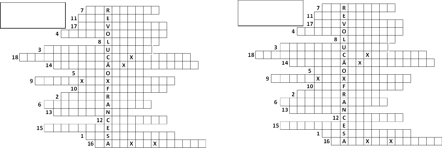 Retomada de conteúdos: Revolução Francesa 1) Quando o rei controlava a economia, a justiça, a política e até a religião dos súditos a monarquia é__________________________________ 2) Quando o povo não vota e não pode expressar suas opiniões, falta ________________________ 3) A sociedade, durante a Revolução Francesa era ____________________ 4) Durante o período do Terror, o rei Luís XVI e a rainha Maria Antonieta foram _________________________________ 5) No Antigo Regime o Primeiro e Segundo Estado não pagavam ________________ 6) Os ___________________________ eram chamados de Terceiro Estado. 7) A _________________________ participou da revolução porque desejava participação política e mais liberdade econômica. 8) ________________________ era rei da França durante a revolução e foi guilhotinado 9) O que marcou o início da revolução foi a ______________________________ 10) Durante a revolução a família real foi guilhotinada e o clero teve os bens _______________________________ 11) A Assembleia Constituinte promulgou a Declaração dos __________________ do Homem e do Cidadão 12) A Declaração dos Direitos Humanos garantia direitos iguais aos _______________ e participação política. 13) Depois da revolução o povo assume o poder apoiados pelos _________________ que defendiam uma maior participação popular no governo. 14) O 18 de Brumário foi um golpe de Estado comandado por _______________ na França, colocando fim ao Diretório e iniciando a ditadura na França. 15) ______________________________ era o principal líder do grupo mais radical na Revolução Francesa, os jacobinos. 16) A _________________ é considerada uma das fases mais radicais e violentas da revolução e foi marcada pela execuções de milhares. 17) A Revolução Francesa pôs fim ao absolutismo e aos _________________________ da nobreza. O povo ganhou direitos e passou a ser respeitado. 18) A Revolução influenciou com seus ideais iluministas a independência de alguns países e a ________________________________ no Brasil. Retomada de conteúdos: Revolução Francesa 1) Quando o rei controlava a economia, a justiça, a política e até a religião dos súditos a monarquia é__________________________________ 2) Quando o povo não vota e não pode expressar suas opiniões, falta ________________________ 3) A sociedade, durante a Revolução Francesa era ____________________ 4) Durante o período do Terror, o rei Luís XVI e a rainha Maria Antonieta foram _________________________________ 5) No Antigo Regime o Primeiro e Segundo Estado não pagavam ________________ 6) Os ___________________________ eram chamados de Terceiro Estado. 7) A _________________________ participou da revolução porque desejava participação política e mais liberdade econômica. 8) ________________________ era rei da França durante a revolução e foi guilhotinado 9) O que marcou o início da revolução foi a ______________________________ 10) Durante a revolução a família real foi guilhotinada e o clero teve os bens _______________________________ 11) A Assembleia Constituinte promulgou a Declaração dos __________________ do Homem e do Cidadão 12) A Declaração dos Direitos Humanos garantia direitos iguais aos _______________ e participação política. 13) Depois da revolução o povo assume o poder apoiados pelos _________________ que defendiam uma maior participação popular no governo. 14) O 18 de Brumário foi um golpe de Estado comandado por _______________ na França, colocando fim ao Diretório e iniciando a ditadura na França. 15) ______________________________ era o principal líder do grupo mais radical na Revolução Francesa, os jacobinos. 16) A _________________ é considerada uma das fases mais radicais e violentas da revolução e foi marcada pela execuções de milhares. 17) A Revolução Francesa pôs fim ao absolutismo e aos _________________________ da nobreza. O povo ganhou direitos e passou a ser respeitado. 18) A Revolução influenciou com seus ideais iluministas a independência de alguns países e a ________________________________ no Brasil.