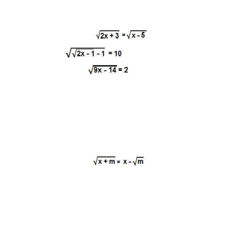 Equações Irracionais 1. Resolva a equação irracional a seguir: 2. Na equação irracional , determine o valor de x. 3. (UTFPR) A equação irracional resulta em x igual a: a) – 2 b) – 1 c) 0 d) 1 e) 2 4. (MACK) Dado m > 0, a equação admite: a) unicamente a raiz nula b) uma raiz real e positiva c) uma única raiz real e negativa d) duas raízes reais, sendo uma nula e) duas raízes reais e simétricas