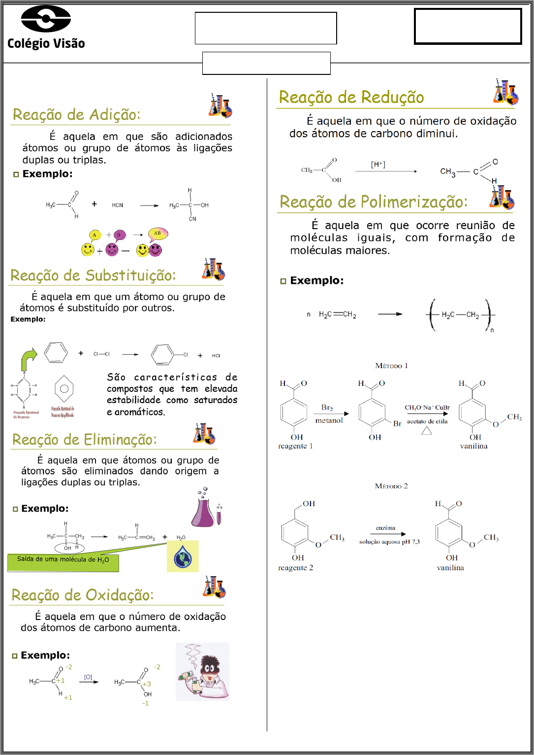 3ºANO DATA: 08/ 10 / 2018 Professor: XUXU QUÍMICA LISTA Classificação das Reações Orgânicas Tipos de Reações Orgânicas Exercícios: 01 -‐ (UNESP SP/2013) As duas reações indicadas no método 1 e a reação indicada no método 2 são classificadas, respectivamente, como reações de: a) substituição, substituição e oxidação. b) redução, redução e oxidação. c) adição, adição e eliminação. d) adição, adição e redução. e) substituição, substituição e substituição. 02 -‐ (Unifacs BA/2012) A humanidade já criou diversas formas de se desfazer dos seus restos mortais. Atualmente, uma dessas formas é a biocremação que consiste em dissolver o corpo em 1000L 2 de solução a 5% (m/v) de hidróxido de potássio, substância similar à soda cáustica, no interior de uma cápsula. Tecnicamente, o método chama-‐se hidrólise alcalina. No processo da biocremação, como na cremação convencional, restam apenas ossos, que são lavados, secados e triturados, e o líquido é filtrado, tratado e reaproveitado na irrigação de jardins. Na cremação convencional, o corpo é queimado à temperatura de 1000 graus em um forno a gás. A biocremação completa, em três horas, o processo que as bactérias, no caso dos corpos sepultados, podem levar anos para concluir. (SIMON, 2012, p. 122). SIMON, Gustavo. “Tu és água e à água voltarás”. Veja, São Paulo: Abril. ed. 2258, ano 45, n. 9, 29 fev. 2012. Sobre as bactérias que realizam a decomposição natural de corpos sepultados, é correto afirmar: 01. Participam da fixação do nitrogênio, desempenhando importante papel na fertilização do solo. 02. Realizam, juntamente com os fungos, a reciclagem da matéria orgânica, possibilitando a continuidade da vida. 03. Executam uma “biocremação” natural incompleta, vez que são autotróficas aeróbicas e, assim, produzem biomassa. 04. Integram o grupo das arqueas termoacidófilas, vivendo em ambientes extremos, onde dificilmente outros seres vivos sobreviveriam. 05. Ocupam o primeiro nível trófico nas teias alimentares de ecossistemas terrestres e aquáticos, servindo de alimento para os outros organismos. 03 -‐ (UFRR/2010) Com relação as reações I e II a seguir, é correto afirmar que: Cl HClCl2 FeCl3 Reação I + + Reação II H2C CH2 HBr H3C CH2Br+ a) Ambas as reações são de eliminação. b) Ambas as reações são de adição. c) A reação I é uma reação de adição e a reação II é uma reação de substituição. d) A reação I é uma reação de substituição e a reação II é uma reação de eliminação. e) A reação I é uma reação de substituição e a reação II é uma reação de adição. 04 -‐ (UFPE/2010) De acordo com as reações abaixo, podemos afirmar que: 1) OH O + CH3-OH H2SO4 OCH3 O 2) + HCl Cl H 3) + H2 Pt 4) + pressão 5) H3C C CH3 CH3 Br + NaOH H2O H2O H3C C CH3 CH3 OH + NaBr 00. o item 1 descreve uma reação de esterificação, que tem como produto o propanoato de metila. 01. o item 2 descreve uma reação de adição 1,2 de um haleto de hidrogênio a uma dupla ligação. A adição do cloro segue a regra de Markovnikov. 02. o item 3 descreve uma reação de redução da dupla ligação, utilizando platina como catalisador. 03. o item 4 descreve uma reação de adição 1,4 para formação de um anel de seis carbonos, o ciclo-‐ hexeno. Esta reação é conhecida como reação Diels-‐ Alder. 04. o item 5 descreve uma reação de substituição nucleofílica do bromo por uma hidroxila. 05 -‐ (PUC Camp SP/2010) O indoxil, ou 3-‐hidroxindol, está presente em uma planta de origem indiana, a Indigofera tinctoria, ou na similar europeia, Isatis tinctoria e é precursor do índigo, o corante azul das calças Lee. Essa substância é oxidada pelo oxigênio atmosférico chegando ao índigo, provavelmente por dimerização de um intermediário radicalar, o indol, segundo o mecanismo: indoxil indol N H O N H O H H N O H H H O2 2 N H H O 2 N H O N H O H H O2 N H O N H O índigo (http://alkimia.tripod.com/corantes.html. Acesso em 30/09/09) Nesse processo, para formar cada molécula de índigo a partir do indoxil, ocorre a a) adição de dois átomos de oxigênio. 3 b) eliminação de uma molécula de água. c) eliminação de duas moléculas de água. d) substituição de dois átomos de hidrogênio. e) substituição de dois átomos de oxigênio. 06 -‐ (UFGD MS/2010) A reação entre bicarbonato de sódio e ácido acético resulta na formação de acetato de sódio,dióxido de carbono e água. Essa transformação química pode ser classificada como: a)uma reação ácido-‐base. b) uma reação radicalar. c) uma reação estereosseletiva. d) uma reação fotoquímica. e) uma reação de combustão. 07 -‐ (UFG GO/2009) Analise a sequência de reações a seguir: CH3 OHO OH HO OH a) Escreva em cada uma das setas o tipo de reação, usando as seguintes palavras: oxidação, adição, eliminação e redução. b) Circule, entre as substâncias mencionadas acima, a única que apresenta atividade óptica. 08 -‐ (UFC CE/2009) A cânfora é uma cetona que possui um odor penetrante característico. É aplicada topicamente na pele como anti-‐ séptica e anestésica, sendo um dos componentes do ungüento Vick® Vaporub®. Na seqüência abaixo, a cânfora sofre transformações químicas em três etapas reacionais (I, II e III). O OH I II IIIII De acordo com esta seqüência reacional, é correto classificar as etapas reacionais I, II e III como sendo, respectivamente: a) oxidação, eliminação, substituição. b) redução, substituição, eliminação. c) redução, eliminação, adição. d) oxidação, adição, substituição. e) oxidação, substituição, adição. 09 -‐ (FATEC SP/2009) O alcoolismo é um grave problema de saúde pública no Brasil, assim como em vários outros países. Estima-‐se que cerca de 10% da população brasileira seja dependente de álcool, enquanto um número bem