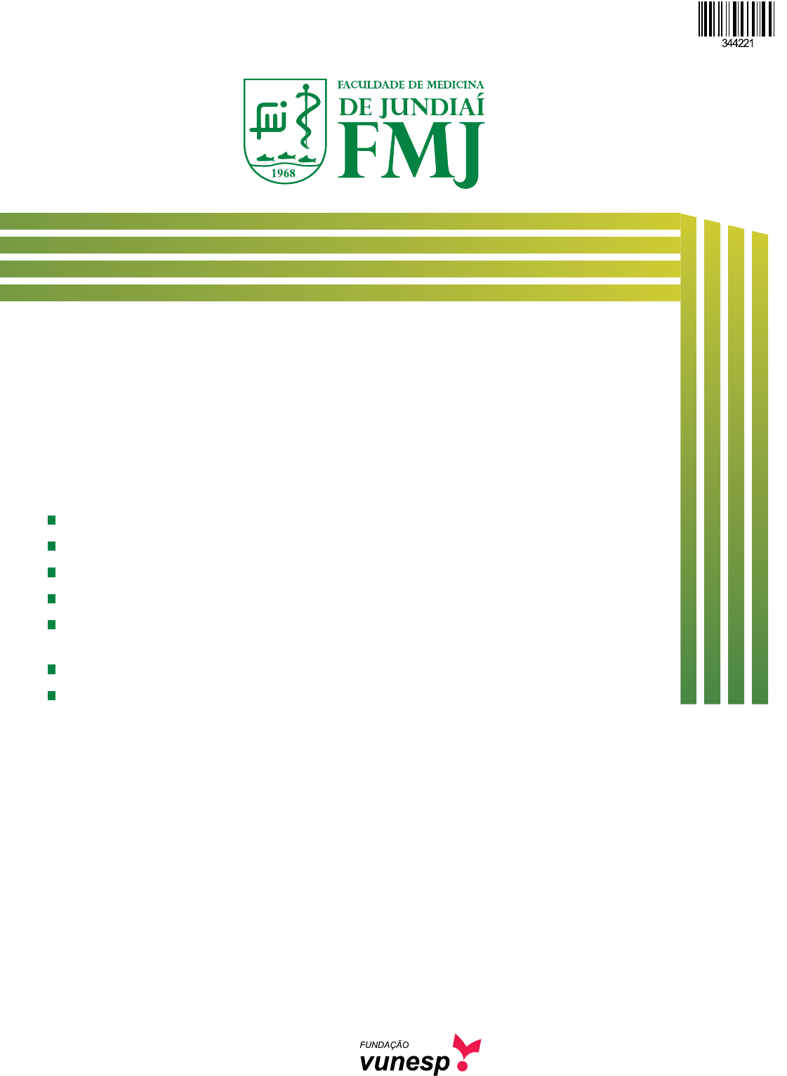 Vestibular 2015 Medicina 001. Prova de Conhecimentos Gerais Confira seus dados impressos neste caderno. Esta prova contém 86 questões objetivas e terá duração total de 4 horas. Para cada questão, o candidato deverá assinalar apenas uma alternativa na Folha de Respostas. Com caneta de tinta azul ou preta, assine a Folha de Respostas e marque a alternativa que julgar correta. Encontra-se neste caderno a Classificação Periódica, a qual, a critério do candidato, poderá ser útil para a resolução de questões. O candidato somente poderá sair do prédio depois de transcorridas 3 horas, contadas a partir do início da prova. Ao final da prova, antes de sair da sala, entregue ao fiscal a Folha de Respostas e o Caderno de Questões. 16.12.2014 2FMJU1401 | 001-ConhecGerais 3 FMJU1401 | 001-ConhecGerais QUESTÃO 01 Considere uma fração tal que somando-se 4 ao seu numera- dor obtém-se outra fração de termos iguais, e subtraindo-se 1 do seu denominador obtém-se outra fração igual a . A soma dos termos da fração inicial vale (A) 11. (B) 10. (C) 8. (D) 13. (E) 15. QUESTÃO 02 Em um distrito de certo município, o número de habitantes, num raio de r quilômetros a partir do Centro de Saúde Muni- cipal, é dado por P(r) = k · 2 3 · r, em que k é constante e r > 0. Se há 1 536 habitantes num raio r = 3 km, o número de habi- tantes existentes num raio r = 4 km desse Centro de Saúde é igual a (A) 16 384. (B) 12 288. (C) 2 048. (D) 8 192. (E) 4 096. QUESTÃO 03 Por recomendação médica, em um processo de condiciona- mento pós-cirurgia, um paciente caminha diariamente sem- pre 5 minutos a mais do que no dia anterior. Sabendo-se que, ao final de 18 dias ininterruptos, ele havia caminhado um total de 15h09min, é correto afirmar que a duração, em minutos, da caminhada desse paciente no 7.º dia foi igual a (A) 43. (B) 45. (C) 33. (D) 35. (E) 38. R A S C U N H O 4FMJU1401 | 001-ConhecGerais QUESTÃO 04 Em uma unidade pediátrica, todo o medicamento líquido con- tido em um recipiente com o formato de um cilindro circular reto, completamente cheio, foi distribuído a determinados p acientes em copinhos dosadores iguais, também com a for- ma de cilindros circulares retos, preenchendo-os totalmente. S abe-se que as medidas da altura e do diâmetro da base do copinho são iguais, nessa ordem, a e das respectivas medidas do recipiente. Se cada paciente ingeriu o conteúdo de 4 copinhos em 24 horas, então o número de pacientes que receberam esse medicamento, nesse dia, foi (A) 25. (B) 30. (C) 28. (D) 24. (E) 32. QUESTÃO 05 Uma área comunitária foi decorada com bandeirinhas verdes e amarelas para os jogos da Copa do Mundo. Para confeccio- ná-las, foram recortadas regiões triangulares AED de folhas retangulares congruentes ABCD, conforme mostra a figura. Se a medida da altura, em centímetros, do triângulo AED, i ndicada por h na figura, é , a área, em centímetros qua- drados, da região triangular recortada é igual a (A) (B) (C) (D) (E) R A S C U N H O 5 FMJU1401 | 001-ConhecGerais R A S C U N H O QUESTÃO 06 Seja a função f definida por , cujo domínio é o intervalo fechado e a > 0. Se N é o valor máximo de f e M é o valor mínimo de f, N – M é igual a (A) 16. (B) 12. (C) 13. (D) 15. (E) 14. QUESTÃO 07 Considerem-se, em um plano cartesiano, as circunferências concêntricas de raios R e r, que determinam uma coroa cir- cular de área igual a 16π. Os pontos A(2, 1) e B(10, 7) são extremidades de um diâmetro da circunferência maior. Desse modo, é correto afirmar que o comprimento da circun- ferência de raio r é igual a (A) 8π. (B) 10π. (C) 6π. (D) 16π. (E) 9π. 6FMJU1401 | 001-ConhecGerais R A S C U N H O QUESTÃO 08 Em um posto de enfermagem foram misturados, em uma caixa, vários pares de luvas de procedimento de três cores distintas, dos quais apenas 2 pares são de cor rosa. Se uma enfermeira retirar ao acaso um par de luvas dessa caixa, a probabilidade de ela tirar um par da cor natural é , e a probabilidade de tirar um par de luvas azuis é o dobro da probabilidade de tirar um par rosa. Desse modo, se uma e nfermeira retirar aleatoriamente 2 pares de luvas dessa caixa, a probabilidade de que ambos sejam azuis é de (A) (B) (C) (D) (E) QUESTÃO 09 Em uma tomada de preços para a compra de certo antibiótico de uso hospitalar, a diferença entre o maior e o menor pre- ço unitário encontrados era igual a x reais. Posterior mente, considerou-se um desconto de 20% sobre o maior preço, proposto pelo respectivo fornecedor, e essa diferença pas- sou a ser igual a 20% do menor preço. Nessas condições, é correto afirmar que a diferença indicada por x representava, do m enor preço, (A) 45%. (B) 50%. (C) 35%. (D) 30%. (E) 40%. 7 FMJU1401 | 001-ConhecGerais Leia o texto para responder às questões de números 12 e 13. A biodiversidade da maior floresta equatorial do planeta não para de surpreender: 441 novas espécies foram desco- bertas na Amazônia entre 2010 e 2013. Entretanto, segundo anunciou o governo no final de 2013, houve aumento de 28% no desmatamento da região – resultado direto da impunidade fomentada pela reforma do Código Florestal. (Ciência hoje, abril de 2014. Adaptado.) QUESTÃO 12 Suponha que uma das espécies descobertas na Amazônia pertença ao mesmo gênero de outra espécie que ocorre s omente na região do Pantanal. É correto afirmar que (A) ambas pertencem à mesma família, mas são de classes diferentes. (B) não há nenhum grau de parentesco evolutivo entre elas. (C) são espécies que podem ter surgido por meio de uma especiação alopátrica. (D) ambas pertencem à mesma classe, mas são de ordens diferentes. (E) são espécies que refletem exemplo de convergência adaptativa. QUESTÃO 13 O problema ambiental citado no texto tem como conse- quência (A) a redução da temperatura do solo. (B) o aumento da profundidade dos rios. (C) a redução da lixiviação. (D) o aumento nos índices de precipitação. 