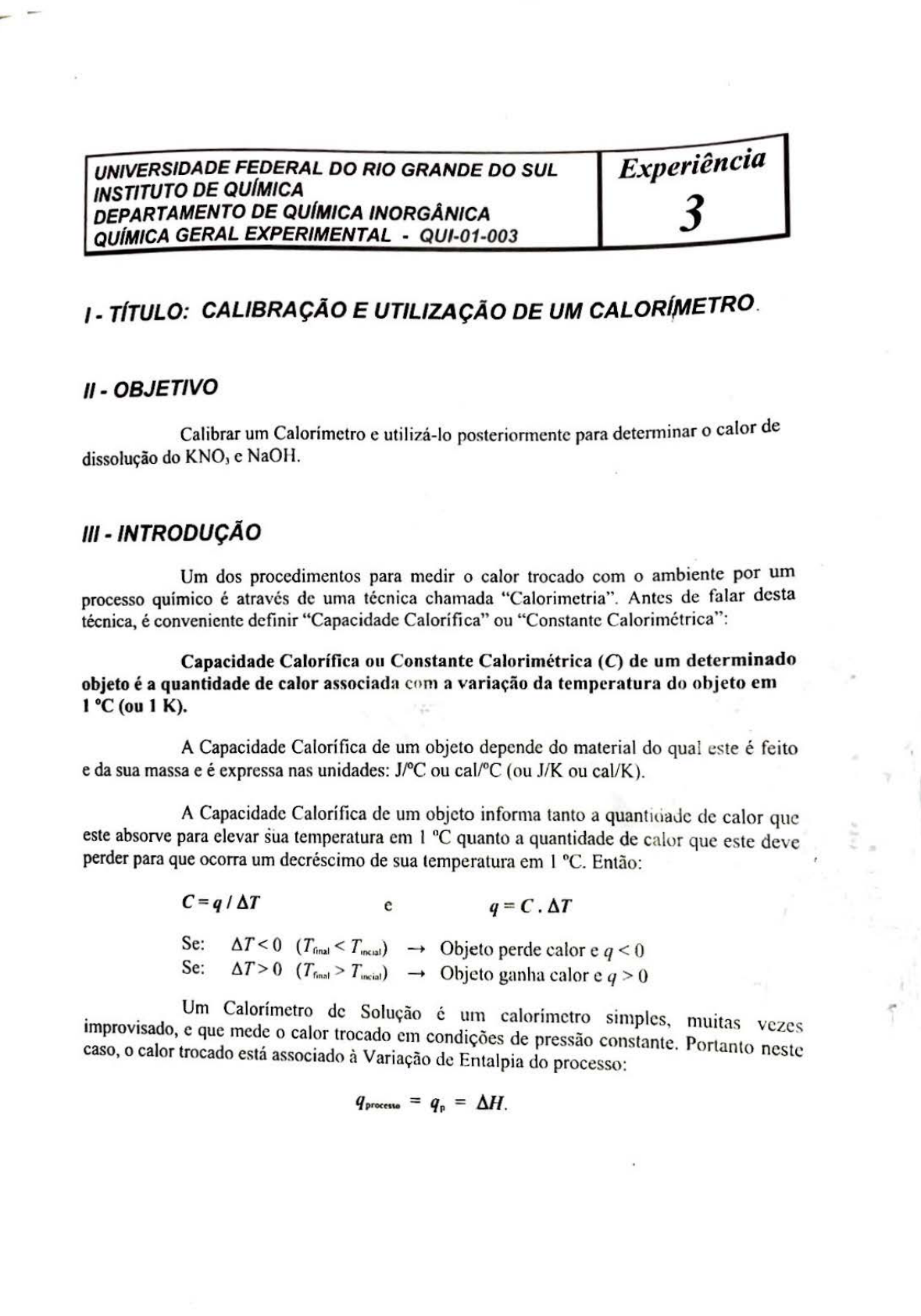 QUÍMICA GERAL EXPERIMENTAL - QUl-01-003