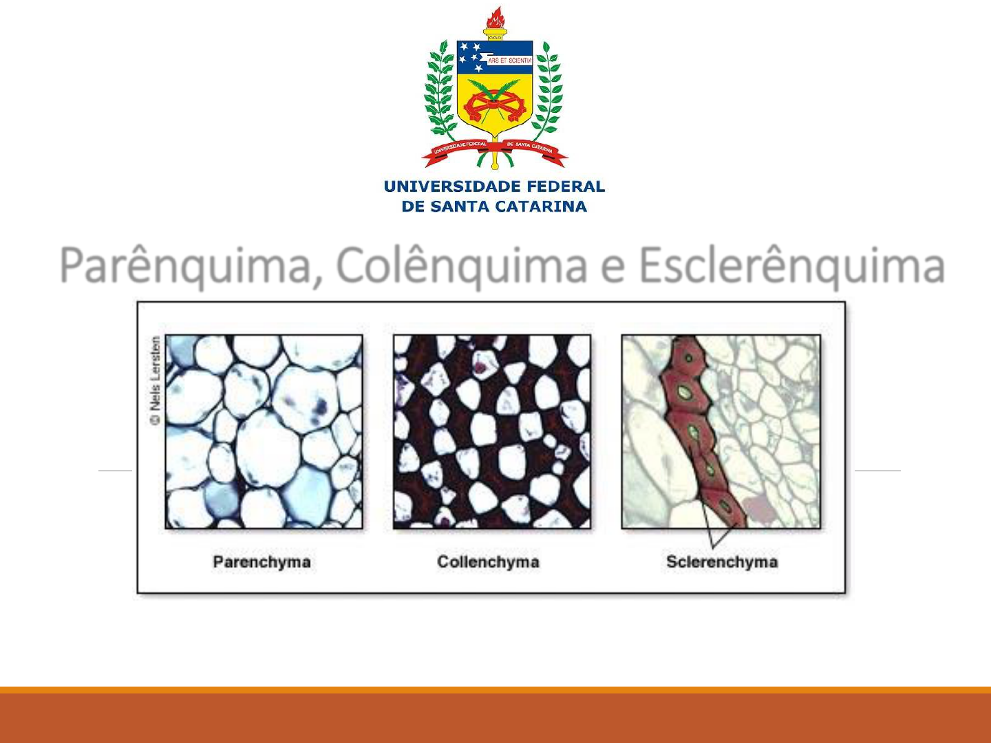 Parênquima, Colênquima e Esclerênquima PROFA. MAKELI GARIBOTTI LUSA PROFA. FERNANDA OLIVEIRA TECIDOS FUNDAMENTAIS PARÊNQUIMA COLÊNQUIMA ESCLERÊNQUIMA Tecidos simples pertencem ao sistema fundamental estão presentes em praticamente todos os órgãos vegetais. 1 - PARÊNQUIMA DISTRIBUIÇÃO: Em todos os órgãos da planta Caule de tomate (Solanum lycopersicum). 1 - PARÊNQUIMA OCORRÊNCIA FOLHAS RAÍZES CAULES 1 - PARÊNQUIMA OCORRÊNCIA FLORES SÉPALAS PÉTALAS PARÊNQUIMA- ORIGEM PARÊNQUIMA PRIMÁRIO PARÊNQUIMA SECUNDÁRIO PARÊNQUIMA • organogênese 3. Paredes normalmente finas: → celulose, hemicelulose e substâncias pécticas. http://generalhorticulture.tamu.edu CARACTERÍSTICAS DAS CÉLULAS 1. Vivas 2. Capacidade de divisão algosobre.com.br • Cicatrização, tecidos secundários PARÊNQUIMA CARACTERÍSTICAS DAS CÉLULAS study.com 5. Vacúolos normalmente grandes. 6. Espaços intercelulares frequentes. 4. Presença de campos de pontoação primária. Quais as funções do parênquima? Preenchimento Fotossíntese Reserva Secreção FUNÇÕES DO PARÊNQUIMA Quando isoladas e com conteúdo diferente (mucilagem, cristal, óleo, etc.) → as células são denominadas de idioblastos. TIPOS DE PARÊNQUIMA 1. Parênquima de preenchimento Córtex e medula do caule e da raiz pecíolo nervuras salientes Células: forma variável podem conter cloroplastos, amiloplastos, cristais e outras substâncias. Caule de Eremanthus polycephalus – Lusa M. G. Parênquima de preenchimento Appezzato & Guerreiro, 2006 Foto: Cleusa Bona Foto: Cleusa Bona TIPOS DE PARÊNQUIMA 2. Parênquima Clorofiliano → Contém cloroplastos • Em folhas • caules jovens • outros órgãos que fazem fotossíntese Parênquima Clorofiliano Em órgão laminar: Paliçádico Lacunoso Regular Paliçádico Lacunoso Parênquima Clorofiliano Plicado Pinus sp P. Plicado phytoimages.siu.edu galleryhip.comdiscoverlife.org Braciforme fineartamerica.com thinkoholic.com TIPOS DE PARÊNQUIMA 3. Parênquima de reserva → Reserva de várias substâncias, dentro ou fora da célula. • Raízes • rizomas • algumas folhas • frutos e sementes *As reservas podem estar em: - plastídios, vacúolo, no citoplasma ou nos espaços intercelulares (ar). Parênquima de reserva →Parênquima amilífero allposters.com Petterson et al. 2008 Foto: Cleusa Bona Persea americana (www.ebah.com.br) Parênquima aerífero ou aerênquima Aerênquima esquizógeno Lusa et al. 2011 httpvisualsunlimited.photoshelter.com flores.culturamix.com Diafragma (Par. Braciforme) T0 Parênquima aerífero ou aerênquima Aerênquima lisígeno T 90 Lusa, 2010 Parênquima aquífero microscopy-uk.org.uk blackplanet.com amodadoflavio.com Parênquima aquífero OUTROS TIPOS DE RESERVA - Carboidratos http://en.wikipedia.org Sacarose Inulina Raiz de Dente-de-leão henriettes-herb.com arthurleej.com Caule de cana-de-açúcar Raiz de Carqueja Joaquim et al. 2015 para-perderpeso.com OUTROS TIPOS DE RESERVA - Óleos e Proteínas Óleos Proteínas Aleurona - microvacúolos com proteínas no milho Gotas de óleo - Fruto- abacate endocrinonews.com revistaagrosa.com.br Petterson et al. 2008 2 - COLÊNQUIMA → Do grego colla = cola ou substância glutinosa, pegajosa. FUNÇÃO -Sustentação dos órgãos primários COLÊNQUIMA DISTRIBUIÇÃO: Superficial – cordões ou cilindro contínuo - Caules, Folhas (pecíolo e nervuras), partes florais, frutos e raízes - Regiões de torção. Ocorrência: Asteraceae. Nery et al. 2014 Melastomataceae. Reis et al. 2004 Helianthus annus. Caule. slideshare.net Ev er t, 2 01 3 COLÊNQUIMA COLÊNQUIMA- Origem 1. Vivas (podem ter cloroplastos) 2. Dividem-se até a maturidade (podem originar felogênio) 3. Parede celular c/ muita substância péctica e água 4. Parede primária espessa irregularmente 5. Cor branca brilhante. *Com o amadurecimento as células podem lignificar-se esclerênquima. CARACTERÍSTICAS DAS CÉLULAS COLÊNQUIMA TIPOS DE COLÊNQUIMA ANGULAR biologia.edu.arbotanica TIPOS DE COLÊNQUIMA ANELAR preuniversity.grkraj.org Anelar no caule de Asteraceae. TIPOS DE COLÊNQUIMA LACUNAR LAMELAR biologia.edu.arbotanica biologia.fciencias.unam.mx Espaços intercelulares Petterson et al. 2008 3 - ESCLERÊNQUIMA → Do grego skleros = duro FUNÇÃO -Sustentação de órgãos primários e, principalmente, secundários ESCLERÊNQUIMA DISTRIBUIÇÃO: periférica ou interna – calotas ou cilindro contínuo - raízes, caules, folhas, frutos, sementes. ESCLERÊNQUIMA OCORRÊNCIA FOLHAS RAÍZES CAULES ESCLERÊNQUIMA- Origem 1. Geralmente sem protoplasto vivo → quando vivas apresentam muitas pontoações 2. Paredes secundárias espessadas 3. Parede celular c/ espessamento homogêneo 4. Formato variável CARACTERÍSTICAS DAS CÉLULAS ESCLERÊNQUIMA pontoações Foto: Lusa MG, Minasia scapigera TIPOS DE CÉLULAS Fibras* Esclereídes** * Sempre longas Secção longitudinal Secção transversal transtutors.com ** ≠ formatos, nunca tão longas. studyblue.com flickr.com TIPOS DE FIBRAS 1. Libriformes 2. Septadas 3. Gelatinosas 4. Fibrotraqueídes LIBRIFORME SEPTADA GELATINOSA * alfa-celulose FIBROTRAQUEÍDE *Traqueídes Fibrotraqueídes Fibras libriformes pharamcytimes.com FIBRAS artesanato.culturamix.com jsertao.com Sisal TIPOS DE ESCLEREÍDES Macroesclereídes ou esclereídes colunares Osteoesclereídes Astroesclereídes Braquiesclereídes ou células pétreas Tricoesclereídes Astroesclereídes de Nymphaea blog.f1000.com TIPOS DE ESCLEREÍDES liliumaquae.com TIPOS DE ESCLEREÍDES Esclereíde colunar amychaplin.com Camelia sinensis Phaseolus vulgaris Copyright 2008 Pearson Education TIPOS DE ESCLEREÍDES pearcoresolutions.com blog.foodnetwork.com Células pétreas – Pêra Vriesia platynema (Bromélia) Obrigada! PRÁTICA 04 – PARÊNQUIMA, COLÊNQUIMA E ESCLERÊNQUIMA 1. Pecíolo de Tetrapanax sp. Faça secções transversais bem finas. a) Monte entre lâmina e lamínula com água. Observe, antes da coloração, o brilho característico da