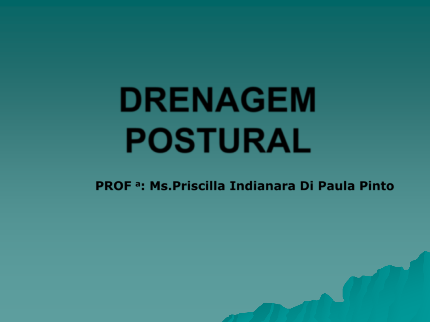 Clique para editar o estilo do título mestre Clique para editar o estilo do subtítulo mestre * * * DRENAGEM POSTURAL PROF a: Ms.Priscilla Indianara Di Paula Pinto * * * DRENAGEM POSTURAL Recurso terapêutico simples, amplamente utilizado na fisioterapia respiratória; OBJETIVO: drenar secreções da árvore brônquica; Postura de higiene brônquica (Consenso de Lyon); Recurso da própria natureza, baseado em um princípio físico, a ação da gravidade; * * * DRENAGEM POSTURAL DEFINIÇÃO: Técnica da fisioterapia respiratória que utiliza a ação da gravidade para deslocar as secreções brônquicas de regiões mais distais das VAs para regiões mais centrais, com o objetivo de serem expectoradas (GAVA; PICANÇO, 2007); Esse deslocamento também é auxiliado pela ventilação dependente da postura. * * * DRENAGEM POSTURAL TÉCNICA: Identificação da região acometida (ausculta); Posicionamento dessa região; Alinhamento dos brônquios segmentares a favor da ação da gravidade; OBS: A técnica descreve um posicionamento para cada segmento pulmonar (alguns autores descrevem o mesmo posicionamento para ser usado na drenagem de dois ou mais segmentos). * * * DRENAGEM POSTURAL JUSTIFICATIVA DA TÉCNICA: Considerando-se que há uma tendência natural de acumular secreções pulmonares nas áreas mais distais da árvore brônquica, pelo próprio efeito gravitacional, a drenagem postural emprega o posicionamento invertido no intuito de favorecer o acesso da secreção pulmonar a um trajeto mais superior na árvore brônquica e, consequentemente, sua eliminação. * * * DRENAGEM POSTURAL Há uma tendência de acúmulo de secreções nas regiões pulmonares basais (vias aéreas mais inferiores); Por esta razão, a posição mais utilizada na técnica é a de Trendelemburg (tronco com toráx em posição mais inferior que o quadril); * * * DRENAGEM POSTURAL TEMPO DE DRENAGEM: 15 a 20 minutos para cada segmento (chegando a 1 hora nos tratamentos domiciliares). POSTURAS MAIS USADAS: Decúbitos laterais; Decúbito ventral e dorsal (com ou sem rotação e elevação da parte inferior do corpo). * * * DRENAGEM POSTURAL PRECAUÇÕES/CUIDADOS: O paciente deverá ser informado da posição que irá assumir; Usar roupas confortáveis, apoiar-se sobre travesseiros e estar sobre uma maca que também ofereça conforto; Uma escarradeira e/ou toalhas de papel devem estar próximos ao paciente/ Verificar se a última refeição ocorreu há mais de 2 horas; No caso de pacientes hospitalizados, cuidados com as sondas, cateteres, cabos, drenos, etc, e recomedam-se inclinações menos acentuadas. * * * DRENAGEM POSTURAL CONTRA-INDICAÇÕES (para a postura de Trendelemburg): IR; IAM; Fraqueza do diafragma; Hipertensão craniana; Instabilidade hemodinâmica; Pós-operatório de cirurgia de crânio; Abdome aberto; Diálise peritonial; Traumatismos torácicos; Edema agudo de pulmão; Tuberculose ativa; Pneumotoráx ou derrame pleural não drenado; Lesão medular instável; Paciente sob VM; Uso de sonda nasogástrica; Hemoptise; Intolerância ao posicionamento. * * * DRENAGEM POSTURAL O paciente pode ser colocado nas posições de drenagem, com auxílio de macas especiais para drenagem postural; A técnica de drenagem se apresenta quase sempre associada a outras técnicas, como a TAPOTAGEM e a VIBRAÇÃO. * * * DRENAGEM POSTURAL VANTAGENS: Técnica simples; Baixo custo; Fácil compreensão pelo paciente; Grande coadjuvante para as terapias de pacientes hipersecretivos crônicos; Promove a drenagem das secreções pulmonares; Promove melhora da relação V/Q (melhora na oxigenação); Prevenção de complicações pós-operatórias (atelectasias e pneumonias). * * * DRENAGEM POSTURAL INDICAÇÕES: Pacientes hipersecretivos e com dificuldade de expectoração (mucoviscidose, infecções respiratórias, tuberculose, bronquiectasias, etc.). * * * DRENAGEM POSTURAL SENTIDO DA DRENAGEM: Para que haja drenagem da secreção, o paciente deverá ser mantido em posição capaz de facilitar o fluxo da secreção patológica: → das ramificações segmentares → para as lobares A partir destas, segue para: → brônquios principais → traquéia → e para fora do sistema respiratório. * * * DRENAGEM POSTURAL PARA DEFINIR O TEMPO DE DRENAGEM, DEVE-SE CONSIDERAR OS ASPECTOS INDIVIDUAIS DE CADA PACIENTE: Estado atual de saúde; Se o tratamento é ambulatorial; Se o tratamento é no leito hospitalar; Se o paciente encontra-se em terapia intensiva; Ou se é uma autodrenagem (em domicílio). OBS: A AUSCULTA PULMONAR guiará a indicação e o tempo para a drenagem postural! * * * DRENAGEM POSTURAL ÁREAS PULMONARES: 10 para o pulmão direito; 9 para o pulmão esquerdo. * * * DRENAGEM POSTURAL * * * DRENAGEM POSTURAL POSIÇÕES DE DRENAGEM POSTURAL: A posição e a inclinação variam de acordo com a posição da área pulmonar a ser drenada; 10 a 15o → lobo médio e língula; 20 a 30o → bases pulmonares; Semi-sentada (Fowler-com variações) → ápices pulmonares. * * * Referências sugeridas para estudo COSTA, Dirceu. Fisioterapia Respiratória Básica. São Paulo: Atheneu, 1999. GAVA, Marcus Vinicius; PICANÇO, Patrícia Salerno de Almeida. Manuais de Fisioterapia: Fisioterapia Pneumológica. São Paulo: Manole, 2007. SCALAN, Craig; WILKINS, Robert; e colaboradores. Fundamentos da Terapia Respiratória de EGAN. 7. ed. São Paulo: Manole, 2000. PRYOR, Jennifer A.; WEBBER, Bárbara A. Fisioterapia para problemas respiratórios e cardíacos. 2. ed. Rio de Janeiro: Guanabara Koogan, 2002.