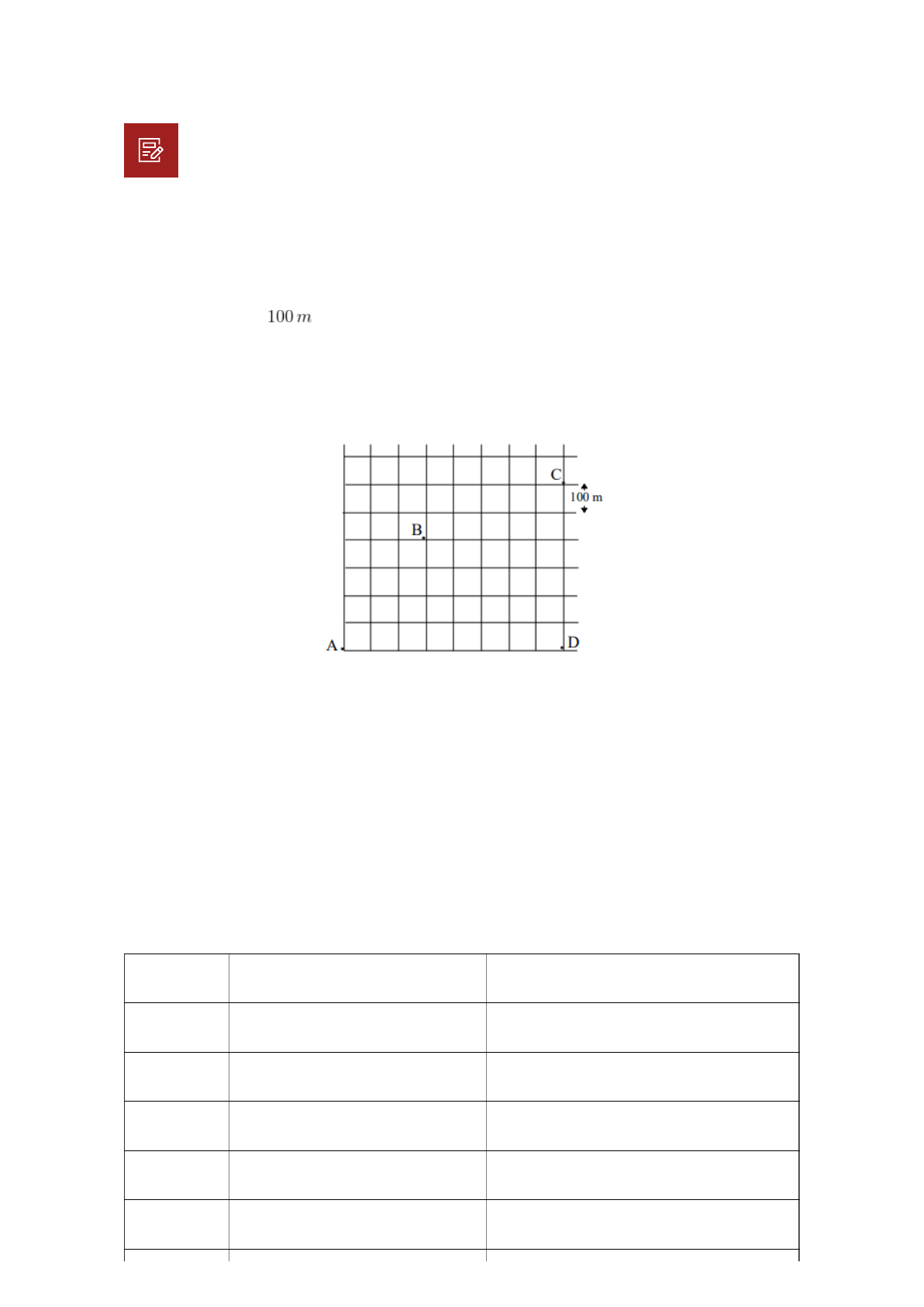 20/10/2018 Exercício de Apoio - Semana 1: FÍSICA I - FFG001 https://cursos.univesp.br/courses/1904/pages/exercicio-de-apoio-semana-1?module_item_id=138165 1/4 1) A figura mostra o mapa de uma cidade em que as ruas retilíneas se cruzam perpendicularmente e cada quarteirão mede . Você caminha pelas ruas a partir de sua casa, na esquina A, até a casa de sua avó, na esquina B. Dali segue até sua escola, situada na esquina C. Seu desejo é que você pudesse ir diretamente em linha reta de sua casa até a escola. A menor distância que você caminha pelas ruas e a distância em linha reta entre sua casa e a escola são, respectivamente: a) 1800 m e 1400 m. b) 1600 m e 1200 m. c) 1400 m e 1000 m. d) 1200 m e 800 m. e) 1000 m e 600 m 2) Escreva as coordenadas dos pontos correspondentes na forma cartesiana e na forma polar: Ponto Coordenadas Cartesianas Coordenadas Polares (1) (2) (3) (4) (5) EXERCÍCIOS DE APOIO (SEMANA 1) Apenas para praticar. Não vale nota. 20/10/2018 Exercício de Apoio - Semana 1: FÍSICA I - FFG001 https://cursos.univesp.br/courses/1904/pages/exercicio-de-apoio-semana-1?module_item_id=138165 2/4 (6) 3) Partindo do ponto A, uma pessoa caminha, passando na ordem, pelos pontos B, C, D, B e E, onde para. Calcule o espaço percorrido e o deslocamento da pessoa nesse trajeto. GABARITO 1) Alternativa: C A distância entre a sua casa e a escola caminhando pelas ruas é dada por: Trecho entre A e C: 800 m (em x) + 600 m (em y) = 1400 m 20/10/2018 Exercício de Apoio - Semana 1: FÍSICA I - FFG001 https://cursos.univesp.br/courses/1904/pages/exercicio-de-apoio-semana-1?module_item_id=138165 3/4 Se o caminho fosse uma linha reta diretamente entre os pontos A e C: Neste caso teríamos o cálculo da hipotenusa de um triângulo hipotético: 2) 20/10/2018 Exercício de Apoio - Semana 1: FÍSICA I - FFG001 https://cursos.univesp.br/courses/1904/pages/exercicio-de-apoio-semana-1?module_item_id=138165 4/4 3) Espaço percorrido (soma de todo o espaço percorrido no trajeto executado): A → B: 40 m B → C: 20 m C → D: 20 m D → B: 30 m B → E: 50 m Total: 160 m Para o cálculo do deslocamento, basta verificar a distância diretamente no trecho entre o ponto inicial A e final E, assim teremos 30 m.
