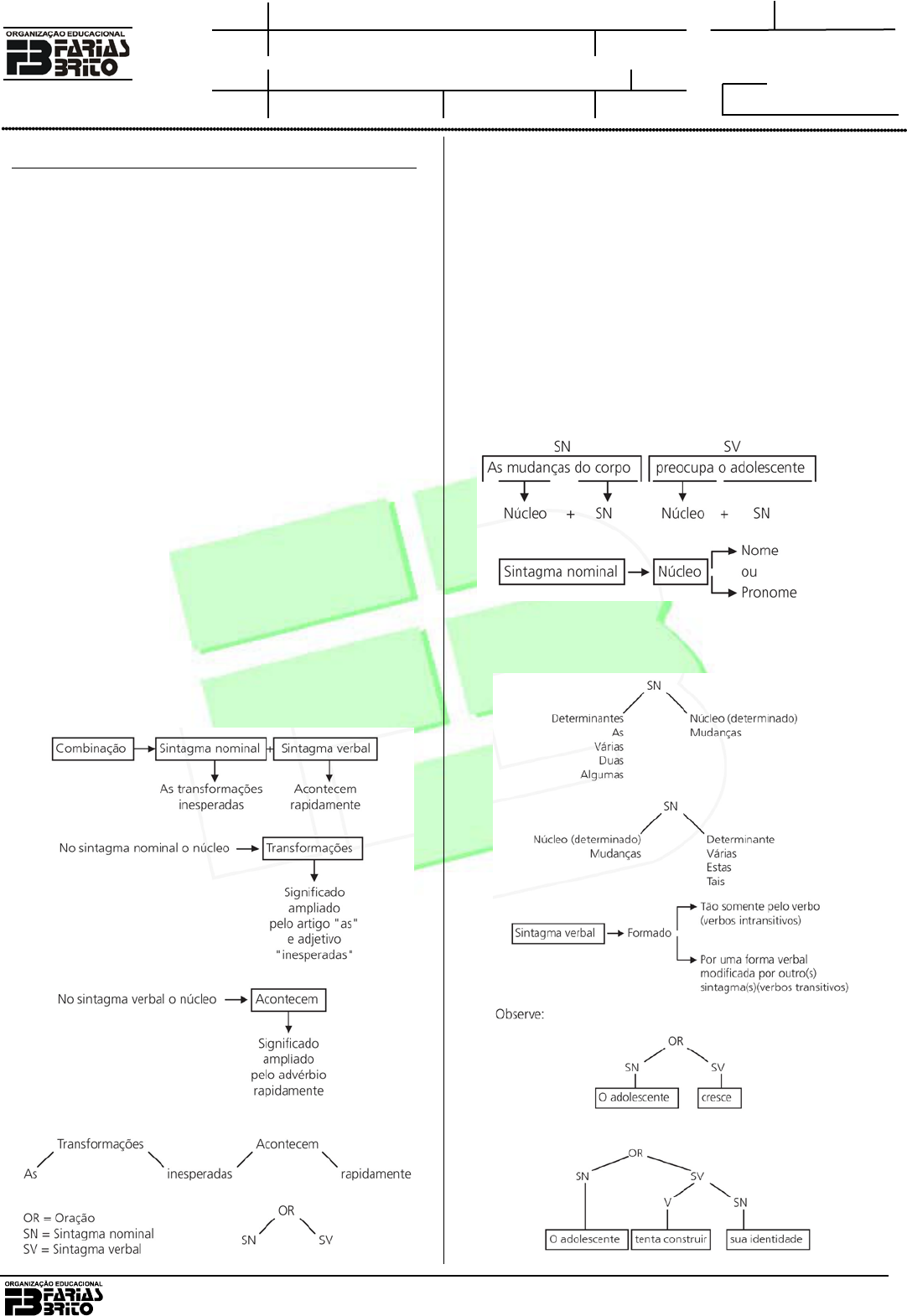 1 OSG.: 34282/10 ENSINO PRÉ-UNIVERSITÁRIO TC LÍNGUA PORTUGUESA TURNO DATA ALUNO(A) TURMA Nº SÉRIE PROFESSOR(A) TOM DANTAS RUMO AO ITA SEDE ___/___/___ Os sintagmas • Estrutura básica de uma oração: Combinação de um nome a um nome e um verbo Mudanças acontecem Nome + verbo • Temos duas unidades de sentido em que se pode subdividir a frase. A essas unidades damos o nome de sintagma. • Observe que temos em “mudanças acontecem” uma estrutura pela qual se formam as orações em português. Se colocarmos outras palavras no lugar de mudanças e acontecem que pertençam ao mesmo paradigma, podemos gerar diversas outras orações. Veja: Fatos surgem/modificações ocorrem/ alterações sucedem/ transformações aparecem • Os sintagmas, basicamente, são estruturados em torno de um verbo (sintagma verbal) ou de um nome (sintagma nominal), que poderão vir acompanhados de outras palavras que ampliam seus significados e com as quais se combinam logicamente. As transformações inesperadas acontecem rapidamente. Podem ocorrer, em português, orações que não apresentam o SN; só existe o SV. • Choveu pouco em Brasília • Nevou muito em Gramado. Observação: A inexistência de SN ao qual o SV se relaciona determina uma característica especial para esses verbos: eles se mantêm inalterados, sempre na terceira pessoa do singular. O sintagma com parte de outro sintagma Quando um sintagma é parte integrante de um sintagma nominal, desempenha a função de complemento ou de adjunto do nome a que se relaciona. Quando é parte integrante de um sintagma verbal, funciona como complemento do verbo. Veja: Observação: Os termos que se referem ao núcleo (determinantes): pronomes adjetivos, artigos, numerais. TC – LÍNGUA PORTUGUESA 2 ITA/IME – PRÉ-UNIVERSITÁRIO A regência • Regente → para os termos subordinantes. • Regido → para os termos subordinados. REGÊNCIA NOMINAL Quando o termo regente é um nome. REGÊNCIA VERBAL Quando o termo regente é um verbo. As funções dentro dos sintagmas maiores O adjunto adnominal Modificam os substantivos, portanto tem equivalência de adjetivos. Exemplos: O complemento nominal O sintagma nominal dentro do sintagma nominal Exemplos: ADJUNTO ADNOMINAL OU COMPLEMENTO NOMINAL? EIS A QUESTÃO! Diferenças fundamentais: • O adjunto adnominal só se relaciona com o substantivo, o complemento nominal desenvolve relações com o substantivo, adjetivo e advérbio. • O complemento nominal equivale a um complemento de um verbo, ou seja, só se relaciona a substantivos cujos significados transitam; portanto seu valor não é ativo, como se observa no adjunto adnominal; na realidade terá valor passivo, pois é sobre ele que a ação vai se instaurar. Exemplos: TC – LÍNGUA PORTUGUESA 3 ITA/IME – PRÉ-UNIVERSITÁRIO 01. (UFSCar-SP) A oração “Vasculhou os bolsos loiros sueco”, extraída de Gabriela, cravo e canela, obra de Jorge Amado, com a substituição do complemento verbal por um nome oblíquo, equivale a: A) Vasculhou-o os bolsos. B) Vasculhou-se o loiro sueco. C) Vasculhou-lhe os bolsos. D) Vasculhou-lhes o loiro sueco. E) Vasculhou-os o loiro sueco. 02. (UFPI) “(...) De tudo quanto foi meu passo caprichoso na vida, restará, pois o resto se esfuma, uma pedra que havia em meio do caminho.” Legado, Carlos Drummond de Andrade Marque a opção que analisa corretamente a função sintática de uma pedra. A) Aposto. B) Sujeito. C) Objeto direto. D) Objeto indireto. E) Predicativo do sujeito. 03. (UFC-CE) Leia o trecho abaixo do conto “Os moradores do casarão”, de Moreira Campos. “Consultando o relógio da parede, que bate as horas num gemer de ferros, ela chama uma das pretas, para que lhe traga a chaleira com água quente.” Numere a segunda coluna, identificando a função sintática do termo, de acordo com a primeira coluna. I. adjunto adnominal II. adjunto adverbial ( ) num gemer de ferros; ( ) da parede; ( ) com água quente. A sequência correta, de cima para baixo, é: A) II – II – I B) II – I – I C) II – I – II D) I – II – II E) I – II – I 04. (FVG-SP) Em cada uma das alternativas abaixo, está destacado um termo iniciado por preposição. Assinale a alternativa em que esse termo não é objeto indireto. A) O rapaz aludiu às histórias passadas, quando nossa bela Eugênia ainda era praticamente uma criança. B) Quando voltei da Romênia, o Brasil todo assistia à novela da Globo, todos os dias. C) Quem disse a Joaquina que as batatas deveriam cozer-se devagar? D) Com a aterrissagem, o aviador logo transmitiu ao público a melhor das impressões. E) Foi fiel à lei durante todos os anos que passou nos Açores. 05. (PUC-RJ) O enunciado a seguir é ambíguo por apresentar mais de uma possibilidade de leitura. “A indicação do neurocientista trouxe benefícios para a pesquisa”. A) Explique quais são as leituras possíveis. B) Desfaça a ambiguidade, deixando clara uma dessas leituras. 06. (Fuvest-SP) Transpondo-se corretamente para a voz ativa a oração “para serem instruídos por um astrônomo (...)”, obtém-se: A) para que sejam instruídos por um astrônomo (...). B) para que um astrônomo os instruírem (...). C) para que um astrônomo lhes instruíssem (...). D) para um astrônomo instruí-los (...). E) para que fossem instruídos por um astrônomo (...). 07. (PUC-RJ) Observe a frase que segue: “Não posso lhe garantir que todos estarão presentes à sua festa da formatura”. Do enunciado acima, pode-se afirmar que a parte destacada desempenha a função de: A) sujeito de posso. B) objeto direto de posso. C) objeto indireto de posso. D) objeto direto de garantir. E) objeto indireto de garantir. 08. (PUC-PR) Assinale a alternativa em que o pronome colocado entre parênteses não preenche corretamente a lacuna. A) O mal-entendido ______ aborreceu demais. (os) B) Não fiquem preocupados: nós _____ ajudaremos. (lhes) C) Na verdade, em muito pouco _____ ajudaría-mos. (as) 