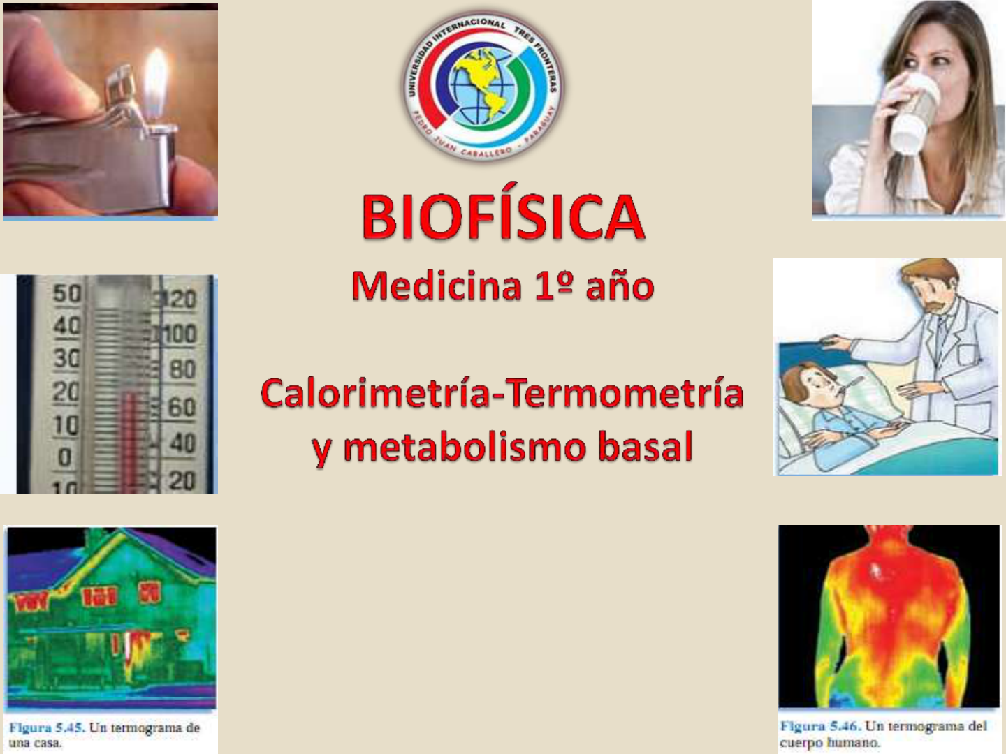 1 Lic. Bioq. Yoelys Gómez Rodríguez ENERGÍA TÉRMICA (CALORÍFICA, CALOR): Energía asociada al mov. Aleatorio de átomos y moléculas La cantidad de energía en tránsito de los cuerpos de mayor temperatura a los de menor temperatura es lo que se entiende en Física por CALOR. Aun cuando no sea posible determinar el contenido total de energía calorífica de un cuerpo, puede medirse la cantidad que se toma o se cede al ponerlo en contacto con otro a diferente temperatura. . Expresión mensurable de la E térmica: TEMPERATURA. SIGNIFICADO DE CALOR Ser humano gasta energía: Trabajo (W) biológico 4 TRANSPORTE ACTIVO La ecuación calorimétrica (1) sirve para determinar cantidades de calor si se conoce la masa del cuerpo, su calor específico y la diferencia de temperatura, pero además permite definir la caloría como unidad de calor. Una caloría es la cantidad de calor necesaria para elevar en un grado centígrado (1 ºC) la temperatura de 1 g de agua: 14,5 ºC → 15,5 ºC La unidad de calor en el SI coincide con la de energía y es el joule (J), habiendo quedado la caloría reducida a una unidad práctica que se ha mantenido por razones históricas, pero que va siendo progresivamente desplazada por el joule. Información Nutricional (Nutrition Facts) Metabolismo basal (MB) 8 Conjunto de reacciones químicas que se llevan a cabo cuando el individuo está gastando energía para funciones de mantenimiento y NO en actividad física de ninguna clase de gasto extra. Condiciones basales: • Reposo físico y psíquico de por los menos 30 min • T agradable: 22-25 ºC • 12 h ayuno • Determinación de MB: Calorimetría indirecta 9 Estudios del Metabolismo Metaboloma 10 Calorimetría Indirecta Calorimetría directa Metabolismo basal varía 11 12 REQUERIMIENTO ENERGÉTICO DIARIO 1. MB (≈ 1.600 Kcal/día) 2. Actividad física (tipo de activ / h) 3. Actividad indeterminada (≈ 300 Kcal/día) 4. Efecto termogénico de los alimentos (10% valores anteriores) TERMOMETRÍA 13 Temperatura: No es una forma de energía Representa la Ec promedio de las moléculas del cuerpo. Diferencia de temperatura: es la fuerza impulsora de la TRANSFERENCIA de CALOR. En ello reside la importancia de la temperatura Ocurre cuando dos cuerpos a diferentes temperaturas se ponen en contacto hasta alcanzar una temperatura estable. EQUILIBRIO TÉRMICO Termómetros 16 Escalas termométricas 17 Existen tres escalas termométricas, utilizadas preferentemente según los países y conforme a los fines propuestos: Escala de Celsius Escala de Fahrenheit Escala de Kelvin. Fue inventado por el astrónomo sueco Celsius;presenta una escala dividida en cien partes, comprendida entre 0 grados, que corresponde a la temperatura de fusión del hielo, y 100 grados, temperatura de ebullición del agua. • La escala puede continuarse por encima del 100 y por debajo de 0, en este caso, la temperatura se considera negativa. • Esta escala termométrica es la más práctica y ha terminado por imponerse en casi todo el mundo, siendo la escala utilizada exclusivamente a los fines de las investigaciones científicas. Primitivamente presentaba dos puntos fijos, el punto 0 grados, que era la temperatura más baja que podía obtenerse mezclando hielo y sal, y 24 grados, la temperatura más alta que se conseguía colocando el termómetro en la boca o en la axila de una persona normal. Considerando que los grados eran demasiado grandes, posteriormente el autor dividió cada grado en 4 partes, de manera que los 24 grados se transformaron en 96 grados, que correspondía a la temperatura del cuerpo humano. El mismo Fahrenheit perfeccionó posteriormente su termómetro, utilizando mercurio en lugar de alcohol, fijo el punto del agua en 212 y 32 el punto de fusión del hielo, estableciendo 180 divisiones entre los dos puntos fijos. Esta escala se utiliza en los países de habla inglesa sobretodo para los fines médicos. La temperatura de los cuerpos es la expresión de la energía cinética molecular. A medida que disminuye el movimiento de las moléculas, disminuye la temperatura y, como es lógico suponer, puede llegarse a un estado tal de la materia en que la moléculas estén inmovilizadas y en el que no habrá ningún desprendimiento calórico. Una temperatura tal corresponderá a 0 grados absoluto. Hay razones para admitir que 0 grados absoluto está a -273 grados Celsius. En esta escala, la temperatura de fusión del hielo corresponde a 273 K y la de ebullición del agua a 373 K. De manera que en esta escala no existen grados negativos. ºC = ºF - 32 = K -273 5 9 5 TºC = TK - 273 • Convertir 25C a F C = ºF - 32 5 9 25 = ºF - 32 5 9 5 X 9 = ºF - 32 45 +32 = ºF ºF=77 F 27 Sustancias termométricas: Hg 28 Temperatura corporal 29 Animales Poquilotermos Animales Homeotermos Temperatura corporal 30 Isotermas 31 Única fuente endógena de producción de Calor (Q) 32 METABOLISMO TRABAJO MUSCULAR 33 Pérdida de Calor 34 TRANSFERENCIA DE CALOR El calor es energía en tránsito, la forma en que se lleva a cabo esta transferencia se describirá a continución. El calor al transferirse de una región de mayor temperatura a otra de menor temperatura lo hace por medio de tres mecanismos: 1. conducción, 2. convección 3. radiación Conducción: Es el simple pasaje de la piel al aire que la rodea por continuidad térmica y dado el gradiente de temperatura existente. Evidentemente este mecanismo desaparece y aún se invierte si la temperatura del aire supera la temperatura de la piel. TRANSFERENCIA DE CALOR Convección: Se produce cuando el aire en contacto con la superficie del cuerpo se halla en movimiento, ya que en este caso el calor es transportado por desplazamiento de materia. Radiación: Este fenómeno esta fundado en la propiedad de todo cuerpo de emitir radiaciones del tipo de la luz cuya energía es proporcional a la cuarta potencia de la temperatura absoluta. Espectro electromagnético 40 Luz: son las radiaciones electromagnéticas dete