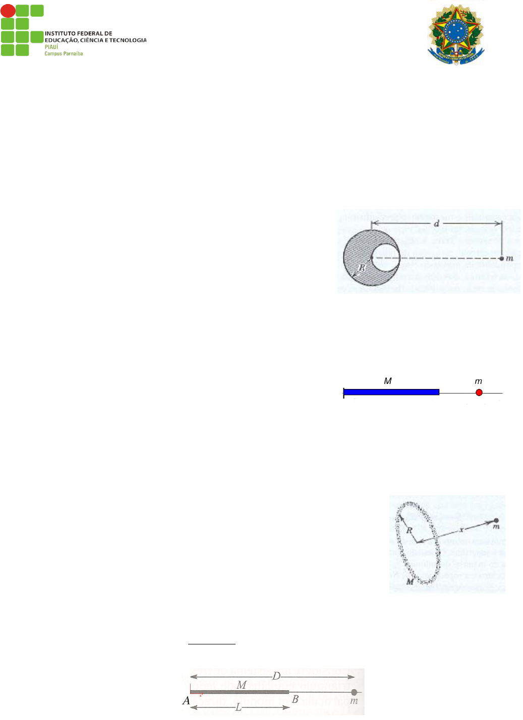 INSTITUTO FEDERAL DE EDUCAÇÃO, CIÊNCIA E TECNOLOGIA DO PIAUÍ - CAMPUS PARNAÍBA CURSO: LICENCIATURA EM FÍSICA DISCIPLINA: MECÂNICA II SEM 2019.1 ALUNO: Lista 3 1. Considere um satélite em órbita circular próxima da superfície de um planeta. (a) Mostre que o período T dessa orbita só depende da densidade média do planeta, e não de sua massa total. (b) Calcule o valor de T para a Terra, para a qual ρ = 5,52 kg/m3, desprezando os efeitos da atmosfera sobre a órbita. 2. Numa esfera de chumbo de raio R, faz-se uma cavidade esférica de tal modo que a sua superfície toca a superfície externa da esfera de chumbo e passa pelo centro desta. A massa da esfera antes que a cavidade fosse feita era M. Com que força, de acordo com a lei da gravitação universal, a esfera de chumbo irá atrair uma pequena esfera de massa m, que está à distância d do centro da esfera de chumbo, sobre uma linha reta que une os centros das esferas e da cavidade? 3. Mostre que, se fosse possı́vel perfurar um túnel atravessando a Terra até os antı́podas, e se a Terra fosse homogênea, uma partı́cula dentro do túnel descreveria um MHS. Calcule o perı́odo de oscilação da partı́cula. 4. Considere uma haste de largura desprezível e massa M distribuída uniformemente ao longo do seu comprimento L . Uma partícula de massa m está colocada a uma distância s da haste, como mostra a figura ao lado. Calcule a força gravitacional que a haste exercerá sobre a partícula. 5. Demonstre que uma distribuição esfericamente simétrica de massa (como a Terra) atrai uma partícula externa como se toda a massa da distribuição estivesse concentrada em seu centro (resultado obtido por Newton em 1685). 6. Vários planetas (os gigantes gasosos Júpiter, Saturno, Urano e Netuno) possuem anéis aproximadamente circulares em torno de si, provavelmente constituídos de material que não conseguiu formar um satélite. Além disso, muitas galáxias contém estruturas semelhantes a anéis. Considere um anel homogêneo de massa M e raio R. Encontre uma expressão para a força gravitacional exercida pelo anel sobre uma partícula de massa m localizada à distância x do centro do anel, ao longo do seu eixo (figura ao lado). 7. Considere um fio retilíneo homogêneo de massa M e comprimento L e uma partícula de massa m alinhada com o fio, à distância D de uma extremidade. Mostre que a força de atração gravitacional exercida pelo fio sobre a partícula é a mesma que se teria se a massa total do fio estivesse concentrada num único ponto, à distância d da massa m, onde d=√D(D−L) é a média geométrica das distâncias de m às extremidades A e B do fio. 8. Um homem de 100 kg, preocupado com seu peso, resolve pesar-se sobre uma balança de molas confiável, recém-adquirida, enquanto está subindo de elevador para o seu apartamento do 14° andar. O homem constata com satisfação que a balança registra 85 kg. Qual é a aceleração do elevador? 9. A força centrífuga é uma força de inércia que atua sobre um corpo em repouso num referencial girante S’. Seja ω a velocidade angular de rotação de S’ em relação à S (referencial inercial). Considere um corpo de massa m em repouso em relação a S’ que está preso ao centro da plataforma girante por um fio esticado. Encontre a expressão e dê as características para a força centrífuga neste caso. (seção 13.3 do livro texto. Curso de Física Básica, 1 Mecânica, H. Moysés Nussenzveig, Mecânica, 5ª edição). 10. Se na plataforma girante da questão anterior, o corpo que estava em repouso começa a se mover, atua sobre o mesmo uma força de inércia chamada força de Coriolis. Encontre a expressão para a força de Coriolis, supondo que uma pessoa caminha sobre a plataforma girante S’ com velocidade puramente tangencial. (seção 13.4 do livro texto. Curso de Física Básica, 1 Mecânica, H. Moysés Nussenzveig, Mecânica, 5ª edição). Dados: G = 6,67 x 10-11 Nm2/kg2 ; RT= 6,37x106 m ; MT = 5,98 x1024 kg.
