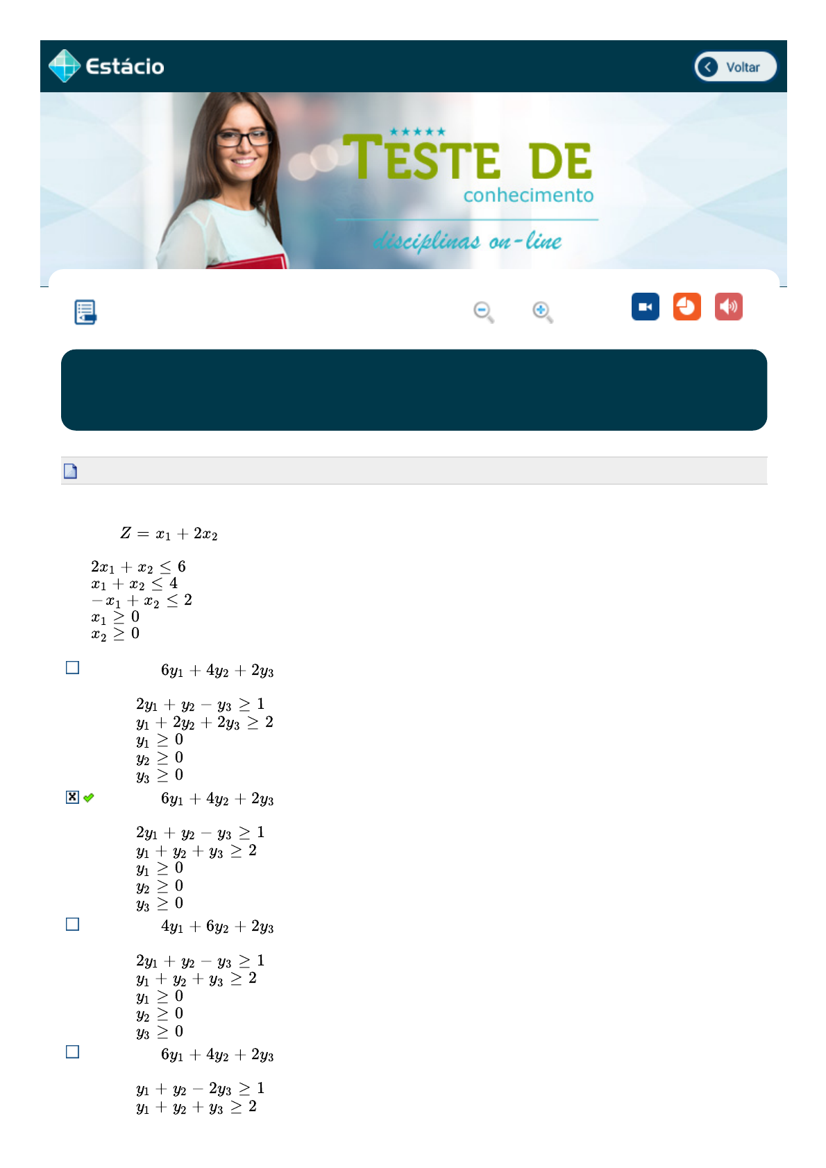 13/09/2019 EPS simulado.estacio.br/alunos/ 1/6 PESQUISA OPERACIONAL 5a aula Lupa Vídeo PPT MP3 Exercício: GST1235_EX_A5_201603023968_V1 12/09/2019 Aluno(a): MAXWEL PORFIRIO ALBUQUERQUE 2019.2 Disciplina: GST1235 - PESQUISA OPERACIONAL 201603023968 1a Questão Estabelecendo o problema dual do problema de maximização abaixo, obtemos Max Sujeito a: Min Sujeito a: Min Sujeito a: Min Sujeito a: Min Sujeito a: Z = x 1 + 2x 2 2x 1 + x 2 ≤ 6 x 1 + x 2 ≤ 4 −x 1 + x 2 ≤ 2 x 1 ≥ 0 x 2 ≥ 0 6y 1 + 4y 2 + 2y 3 2y 1 + y 2 − y 3 ≥ 1 y 1 + 2y 2 + 2y 3 ≥ 2 y 1 ≥ 0 y 2 ≥ 0 y 3 ≥ 0 6y 1 + 4y 2 + 2y 3 2y 1 + y 2 − y 3 ≥ 1 y 1 + y 2 + y 3 ≥ 2 y 1 ≥ 0 y 2 ≥ 0 y 3 ≥ 0 4y 1 + 6y 2 + 2y 3 2y 1 + y 2 − y 3 ≥ 1 y 1 + y 2 + y 3 ≥ 2 y 1 ≥ 0 y 2 ≥ 0 y 3 ≥ 0 6y 1 + 4y 2 + 2y 3 y 1 + y 2 − 2y 3 ≥ 1 y 1 + y 2 + y 3 ≥ 2 13/09/2019 EPS simulado.estacio.br/alunos/ 2/6 Min Sujeito a: Respondido em 12/09/2019 09:15:09 Gabarito Coment. 2a Questão Considere o modelo C de programação de dois itens P e Q , onde x1 e x2 são decisões de produção no intervalo determinado: Maximizar C = 30x1 +40x2 Sujeito a x1 + 2x2 ≤100 5x1+3x2 ≤ 300 x1, x2 ≥0 A partir daí, construa o modelo dual correspondente: Minimizar D= 100y1+300y2 Sujeito a y1 + 5y2 ≥ 30 2y1 + 3y2 ≥ 40 y1, y2 ≥0 Minimizar D= 10y1+300y2 Sujeito a y1 + 5y2 ≥ 30 2y1 + y2 ≥ 100 y1, y2 ≥0 Maximizar D= 10y1+300y2 Sujeito a y1 + 5y2 ≥ 30 y1 + 3y2 ≥ 40 y1, y2 ≥0 Minimizar D= 40y1+30y2 Sujeito a 100y1 + 5y2 ≥ 30 300y1 + 3y2 ≥ 40 y1, y2 ≥0 Minimizar D= 300y1+100y2 Sujeito a y1 + y2 ≥ 30 2y1 + 5y2 ≥ 40 y1, y2 ≥0 Respondido em 12/09/2019 09:16:44 y 1 ≥ 0 y 2 ≥ 0 y 3 ≥ 0 6y 1 + 4y 2 + 2y 3 2y 1 + y 2 − y 3 ≥ 1 y 1 + 2y 2 + y 3 ≥ 2 y 1 ≥ 0 y 2 ≥ 0 y 3 ≥ 0 13/09/2019 EPS simulado.estacio.br/alunos/ 3/6 Gabarito Coment. Gabarito Coment. 3a Questão Estabelecendo o problema dual do problema de maximização abaixo, obtemos Max Sujeito a: Min Sujeito a: Min Sujeito a: Min Sujeito a: Min Sujeito a: Min Sujeito a: Respondido em 12/09/2019 09:12:52 Gabarito Coment. Gabarito Coment. 4a Questão Estabelecendo o problema dual do problema de maximização abaixo, obtemos Z = 5x 1 + 2x 2 x 1 ≤ 3 x 2 ≤ 4 x 1 + 2x 2 ≤ 9 x 1 ≥ 0 x 2 ≥ 0 3y 1 + 4y 2 + 9y 3 y 1 + y 3 ≥ 5 y 2 + 2y 3 ≥ 2 y 1 ≥ 0 y 2 ≥ 0 y 3 ≥ 0 3y 1 + 4y 2 + 9y 3 3y 1 + y 3 ≥ 5 y 2 + 2y 3 ≥ 2 y 1 ≥ 0 y 2 ≥ 0 y 3 ≥ 0 3y 1 + 4y 2 + 3y 3 y 1 + y 3 ≥ 5 y 2 + 2y 3 ≥ 2 y 1 ≥ 0 y 2 ≥ 0 y 3 ≥ 0 3y 1 + 9y 2 + 4y 3 y 1 + y 3 ≥ 5 y 2 + 2y 3 ≥ 2 y 1 ≥ 0 y 2 ≥ 0 y 3 ≥ 0 3y 1 + 4y 2 + 9y 3 y 1 + y 3 ≥ 5 2y 2 + 2y 3 ≥ 2 y 1 ≥ 0 y 2 ≥ 0 y 3 ≥ 0 13/09/2019 EPS simulado.estacio.br/alunos/ 4/6 Max Sujeito a: Min Sujeito a: Min Sujeito a: Min Sujeito a: Min Sujeito a: Min Sujeito a: Respondido em 12/09/2019 09:13:31 Gabarito Coment. Gabarito Coment. 5a Questão Analisando o Dual do modelo Primal abaixo apresentado, assinale a resposta correta: Max Z = 70x1+ 90x2 S. a: 6x1+ 4x2 ≥ 22 2x1+ 3x2 ≥ 16 3x1+ 5x2 ≥ 18 Z = 5x 1 + 2x 2 x 1 ≤ 3 x 2 ≤ 4 −x 1 − 2x 2 ≤ − 9 x 1 ≥ 0 x 2 ≥ 0 9y 1 + 3y 2 − 4y 3 y 1 − y 3 ≥ 5 y 2 − 2y 3 ≥ 2 y 1 ≥ 0 y 2 ≥ 0 y 3 ≥ 0 3y 1 + 4y 2 − 9y 3 2y 1 − 2y 3 ≥ 5 y 2 − 2y 3 ≥ 2 y 1 ≥ 0 y 2 ≥ 0 y 3 ≥ 0 3y 1 + 4y 2 − 9y 3 y 1 − y 3 ≥ 5 y 2 − 2y 3 ≥ 2 y 1 ≥ 0 y 2 ≥ 0 y 3 ≥ 0 3y 1 + 4y 2 − 9y 3 y 1 − 2y 3 ≥ 5 y 2 − y 3 ≥ 2 y 1 ≥ 0 y 2 ≥ 0 y 3 ≥ 0 3y 1 + 4y 2 − 9y 3 y 1 − y 3 ≥ 5 2y 2 − y 3 ≥ 2 y 1 ≥ 0 y 2 ≥ 0 y 3 ≥ 0 13/09/2019 EPS simulado.estacio.br/alunos/ 5/6 x1; x2≥0 A Função Objetivo será de Maximização Teremos um total de 3 Restrições O valor da constante da primeira Restrição será 90 O valor do coeficiente de y1 na primeira Restrição será 22 A Função Objetivo terá 3 Variáveis de Decisão Respondido em 12/09/2019 09:18:53 6a Questão Dado o modelo abaixo, considere o teorema da dualidade e encontre o modelo dual correspondente inserindo as variáveis de folga: Minimizar C =20x1+15x2 Sujeito a 3x1 + x2 ≥ 5 2x1 + 2x2 ≥ 3 4x1 + 5x2 ≥ 2 x1,x2≥0 Maximizar D=3y1+5y2+2y3 Sujeito a 3y1 + 2y2 + 4y3 + y4 =20 y1 + y2 + 5y3 + y5=15 y1, y2,y3,y4,y5 ≥0 Maximizar D= y1+3y2+2y3 Sujeito a 3y1 + 2y2 + y3 + y4 =20 y1 + 2y2 + 5y3 + y5=15 y1, y2,y3,y4,y5 ≥0 Maximizar D= 5y1+3y2+y3 Sujeito a 3y1 + 2y2 + 4y3 =20 y1 + y2 + 5y3 + y4 =15 y1, y2,y3,y4 ≥0 Maximizar D= 5y1+3y2+2y3 Sujeito a 3y1 + 2y2 + 4y3 + y4 =20 y1 + 2y2 + 5y3 + y5=15 y1, y2,y3,y4,y5 ≥0 Maximizar D= 5y1+2y2+3y3 Sujeito a 3y1 + 2y2 + 4y3 + y4 =20 y1 + 2y2 + 5y3 =15 y1, y2,y3,y4 ≥0 Respondido em 12/09/2019 09:20:13 Gabarito Coment. 7a Questão Analisando o Dual do modelo Primal abaixo apresentado, assinale a resposta correta: 13/09/2019 EPS simulado.estacio.br/alunos/ 6/6 Max Z = 50x1+ 60x2 + 70x3 S. a: 8x1+ 6x2 + 4x3 ≥ 32 x1+ 5x2 + x3 ≥ 15 x1; x2; x3≥0 A Função Objetivo será de Maximização O valor do coeficiente de y2 na primeira Restrição será 1 Teremos um total de 2 Restrições A Função Objetivo terá 3 Variáveis de Decisão O valor da constante da primeira Restrição será 8 Respondido em 12/09/2019 09:18:33