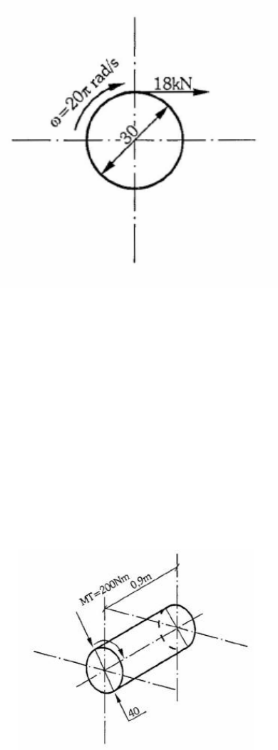 Lista Resistência dos Materiais Aplicada Torção – PROFESSOR: MARCOS RESENDE 1) Uma árvore de aço possui diâmetro d = 30mm, gira com uma velocidade angular ω = 20π rad/s, movida por uma força tangencial FT = 18kN. Determinar para o movimento da árvore: a) rotação (n) b) freqüência (f) c) velocidade periférica (vp) d) potência (P) e) torque (Mt) 2) Dimensionar a árvore maciça de aço, para que transmita com segurança uma potência de 7355W (~10CV), girando com uma rotação de 800rpm. O material a ser utilizado é o ABNT 1040L, com Ϯ = 50MPa (tensão admissível de cisalhamento na torção). 3) o eixo-árvore representado na figura, possui diâmetro d = 40mm, e comprimento l= 0,9m, gira com uma velocidade angular ω = 20π rad/s movido por um torque MT = 200Nm . Determinar para o movimento da árvore: a) força tangencial b) velocidade periférica c) potência d) tensão máxima atuante 4) No exercício anterior, determine a distorção (y) e o ângulo de torção (θ). Gaço = 80 GPa. 5) Um eixo-árvore de secção transversal constante, com diâmetro igual a 50mm, transmite uma potência de 60kW a uma frequência de 30Hz. Pede-se determinar no eixo: a) a velocidade angular b) a rotação c) o torque atuante d) a tensão máxima atuante 6) Dimensionar o eixo-árvore vazado com relação entre diâmetros igual a 0,6, para transmitir uma potência de 20kW, girando com uma velocidade angular ω = 4π rad/ s O material do eixo é ABNT 1045 e a tensão admissível indicada para o caso é 50MPa. 7) A figura dada, representa a chave para movimentar as castanhas da placa do eixo árvore do torno. A carga máxima que deve ser aplicada em cada extremidade é F = 120N. Dimensionar a extremidade da secção quadrada de lado "a" da chave. O material a ser utilizado é o ABNT 1045 e a sua tensão de escoamento é 400MPa. Como a chave estará submetida à variação brusca de tensão, recomenda-se a utilização do coeficiente de segurança k = 8. 8) A figura dada representa uma "chave soquete" utilizada para fixação de parafusos. A carga máxima que será aplicada na haste da "chave soquete" é de 180N. Dimensionar a haste da chave. Material a ser utilizado é o ABNT 3140 (aço Cr: Ni) o σe = 650 MPa. Utilizar k = 6,5. 9) Um eixo-árvore possui d = 80mm e comprimento igual a 90cm, transmite uma potência de 15kW com uma freqüência de 10Hz. Determinar: a) Tensão máxima de cisalhamento atuante b) A distorção no eixo c) O ângulo de torção Gaço = 80 GPa 10) Um motor de potência 100kW e velocidade angular 40π rad / s aciona duas máquinas através da transmissão por polias representada na figura. A máquina da direita (2), consome 80kW e a da esquerda (3) 20kW. Desprezam-se as perdas. O eixo da direita (2), possui di = 80mm e comprimento igual a 1,2m, enquanto o eixo da esquerda possui d = 40mm e comprimento igual a 0,8 m. Gaço = 80GPa. Os diâmetros nominais das polias são: dn = 150mm; dn2 = 450mm; dn3 = 180mm; dn4 = 360mm; dn5 = 200mm; dn6 = 40Ômm. Determinar: a) A rotação nos eixos (1), (2) e (3) b) Atensão máxima atuante nos eixos (2) e (3) c) Ângulo de torção nos eixos (2) e (3) d) A distorção nos eixos (2) e (3)
