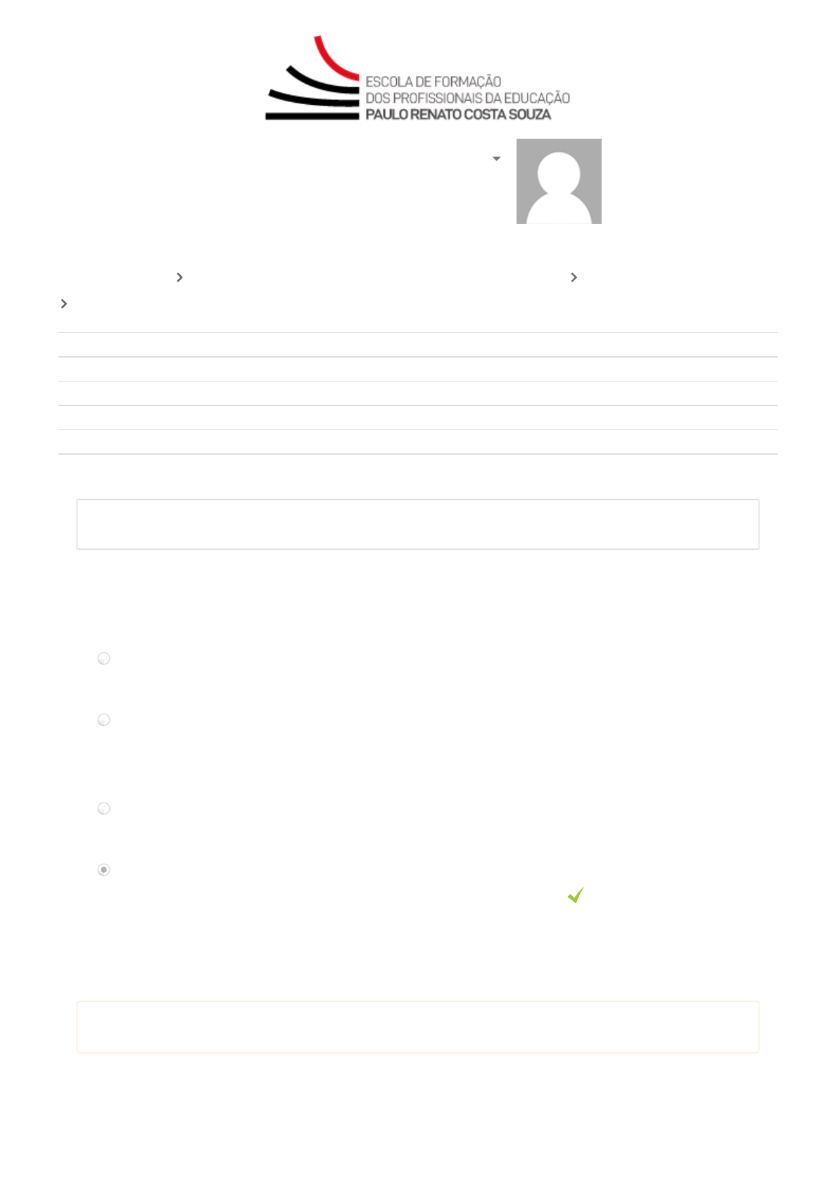 08/09/2019 Questões Objetivas - Teste 2.A avaefap.escoladeformacao.sp.gov.br/mod/quiz/review.php?attempt=4718457 1/5 Iniciado em sábado, 7 Set 2019, 15:09 Estado Finalizada Concluída em domingo, 8 Set 2019, 10:15 Tempo empregado 19 horas 6 minutos Notas 5,00/5,00 Avaliar 100,00 de um máximo de 100,00 Questão 1 Correto Atingiu 1,00 de 1,00 Com relação aos termos Bullying e Cyberbullying, assinale a alternativa CORRETA: A. A palavra Bullying é derivada de outro termo em inglês, Bully, que signi�ca paz, empatia, compreensão. B. Bullying representa uma relação de intimidação, de supremacia e controle de uma pessoa ou grupo sobre outra pessoa, já o Cyberbullying é só um tipo de brincadeira nas redes sociais digitais. C. Cyberbullying é muito menos grave do que o Bullying, pois seus efeitos são apenas virtuais. D. O Cyberbullying é a modalidade digital do Bullying, que é identi�cado pelas intimidações usando a Internet e outras plataformas digitais. CORRETA: As tecnologias digitais podem ser usadas para praticar Bullying de novas formas e para ampliar as audiências desta violência. Sua resposta está correta. Página principal Educando para boas escolhas online - 1ª Edição/2019 Módulo 2 - Cyberbullying Questões Objetivas - Teste 2.A odnir demetrio de oliveira 08/09/2019 Questões Objetivas - Teste 2.A avaefap.escoladeformacao.sp.gov.br/mod/quiz/review.php?attempt=4718457 2/5 Questão 2 Correto Atingiu 1,00 de 1,00 Apesar de ser um problema mundial, muitas vezes o Cyberbullying é subestimado pelos adultos como “brincadeira de criança”. Marque abaixo a alternativa CORRETA sobre a diferença entre Cyberbullying e brincadeiras: A. Toda brincadeira violenta, mesmo que ocorra apenas uma vez, precisa ser encarada como Bullying ou Cyberbullying. B. O Cyberbullying é sempre um problema entre duas pessoas, apenas entre agressor e vítima sozinhos, nunca em grupo. Os espectadores não interferem muito na prática de Cyberbullying. C. Só existe brincadeira quando todos os envolvidos se divertem. Quando há uma relação de desigualdade de poder, na qual uns se divertem e outros sofrem, é preciso interromper a violência também on-line. CORRETA: Na brincadeira há regras e todos são iguais diante delas. Quando alguém está desconfortável a brincadeira acaba. No caso da Internet deve ser apagada, excluída e pedidos de desculpas registrados. D. O Cyberbullying ocorre independentemente do contexto e não tem relação com os valores, as normas ou com a cultura do local no qual ocorre. Sua resposta está correta. 08/09/2019 Questões Objetivas - Teste 2.A avaefap.escoladeformacao.sp.gov.br/mod/quiz/review.php?attempt=4718457 3/5 Questão 3 Correto Atingiu 1,00 de 1,00 Com relação aos diferentes atores que participam nos casos de Cyberbullying, assinale as alternativas como Verdadeiras (V) ou Falsas (F): A. Ao buscar reconhecimento, validação social e exercício de poder, o agressor depende dos espectadores para que tenha algum retorno da prática dessa violência. Verdadeira B. Os espectadores também são considerados agressores, tanto os que participam ativamente curtindo e compartilhando as humilhações, quanto os mais passivos que assistem sem reagir, seja por medo ou por aceitarem a situação. Verdadeira C. As ações de sensibilização e prevenção devem focar apenas nos agressores, principais responsáveis. Falsa D. Conquistar a validação social e/ou intimidar os espectadores são algumas das principais motivações dos agressores Verdadeira Sua resposta está correta. 08/09/2019 Questões Objetivas - Teste 2.A avaefap.escoladeformacao.sp.gov.br/mod/quiz/review.php?attempt=4718457 4/5 Questão 4 Correto Atingiu 1,00 de 1,00 Com base nas pesquisas apresentadas sobre o Cyberbullying no cenário nacional de uso da Internet por crianças e adolescentes, qual alternativa está CORRETA? A. Em 2009, nenhum aluno relatou ter presenciado Cyberbullying nas pesquisas da SaferNet Brasil. B. Nem o Bullying nem o Cyberbullying têm sido relatados pelos alunos nas pesquisas sobre violência no contexto escolar. C. As pesquisas sinalizam especi�camente as experiências de intimidações e discriminações sistemáticas (Cyberbullying) na Internet, um tema cada vez mais importante para planejar ações que favorecem um ambiente saudável e seguro no contexto escolar. CORRETA: O Cyberbullying é um tema que ganha cada vez mais atenção de órgãos de pesquisa, ONG’s e gestores públicos, uma vez que a convivência dos alunos é cada vez mais mediada pelas tecnologias digitais. D. Os casos de Cyberbullying praticamente nem chegam ao Canal de Ajuda da SaferNet, o que indica que não provoca incômodo na vida das vítimas. Sua resposta está correta. 08/09/2019 Questões Objetivas - Teste 2.A avaefap.escoladeformacao.sp.gov.br/mod/quiz/review.php?attempt=4718457 5/5 Questão 5 Correto Atingiu 1,00 de 1,00 A partir das discussões iniciais deste módulo, assinale as alternativas como Verdadeiras (V) ou Falsas (F): A. Além de conhecer os dados nacionais sobre Cyberbullying, é importante que cada instituição escolar tenha algum retrato de sua realidade local para orientar suas atividades. Verdadeira B. O Cyberbullying costuma ser um problema isolado na escola e deve ser tratado apenas como caso de polícia. Falsa C. Realizar uma enquete com a participação direta dos alunos pode ser um ótimo início para debater o tema. Verdadeira D. O Cyberbullying é só um novo nome exagerado e importado para falar de brincadeiras entre crianças. Não é uma questão que precisa ser tratada na escola. Falsa Sua resposta está correta.